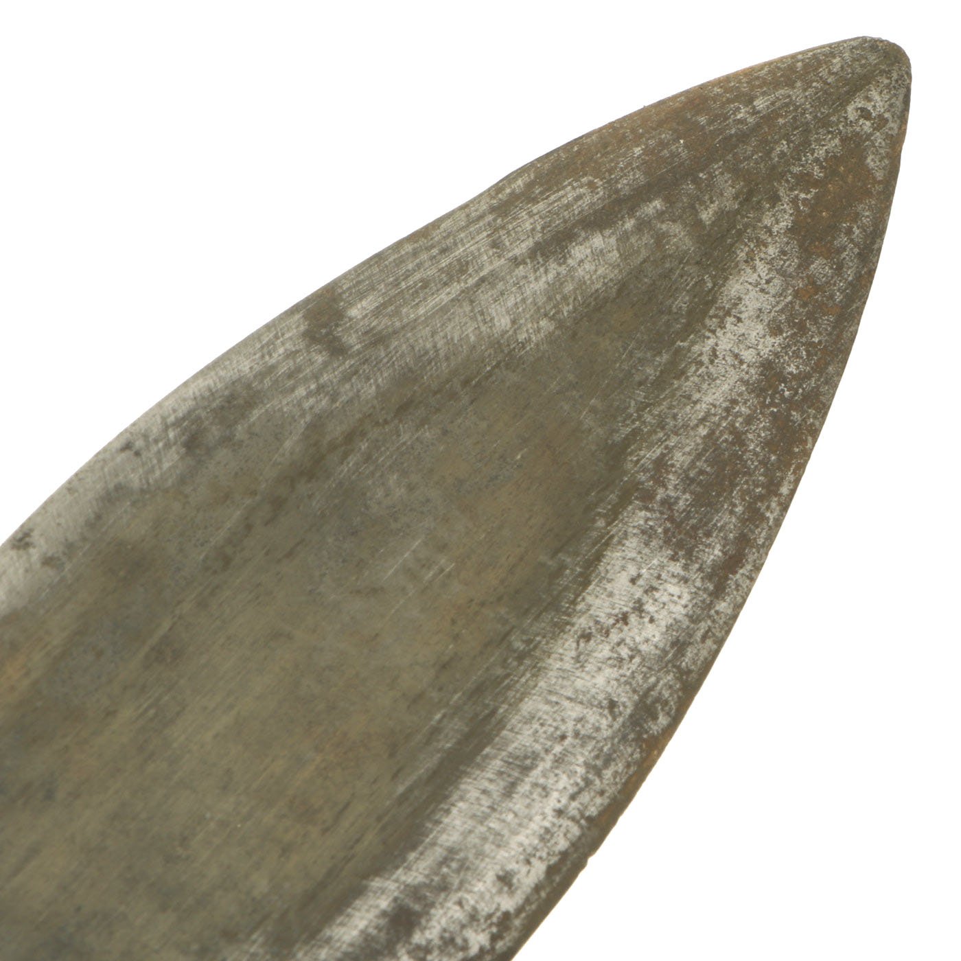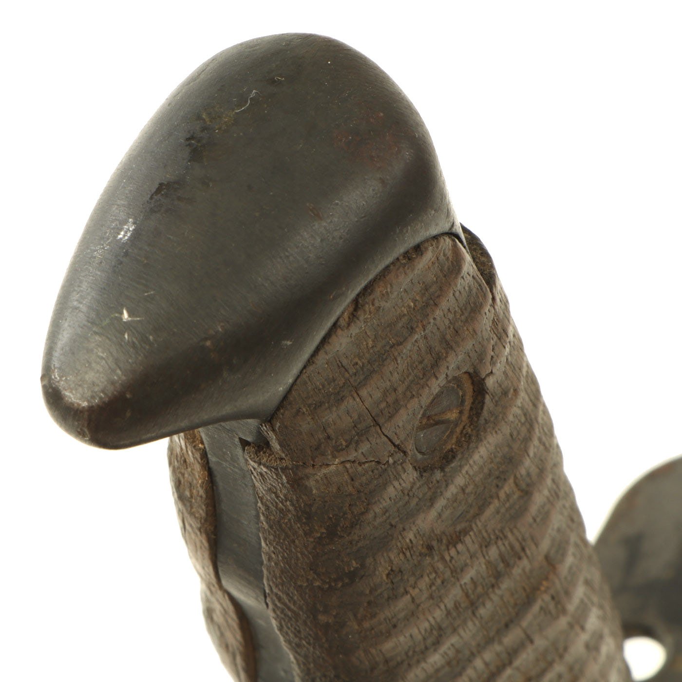 The markings are quite faint, so unfortunately cannot make out the original manufacturing date. The blade and ricasso are almost completely devoid of the original black finish, most likely due to cleaning and use. There is definitely wear, and the blade may have been arsenal reconditioned for reissue in WWII, which is why the markings are faint. It does show sharpening after manufacture, but it is well done, most likely at arsenal. The main edge of the model 1917, such as this one, is mostly ground from one side, while the other side was left flat. The original profile is still mostly intact.