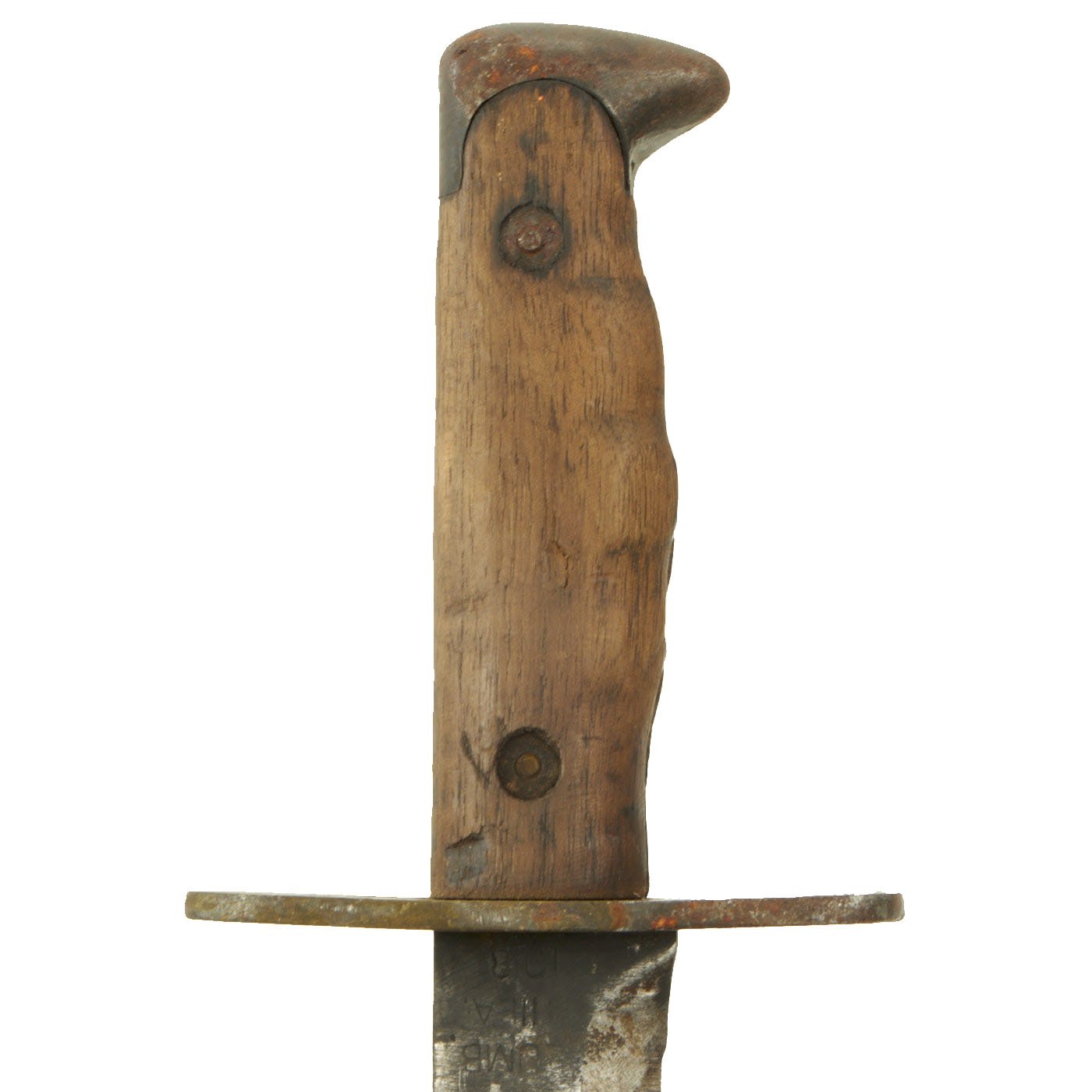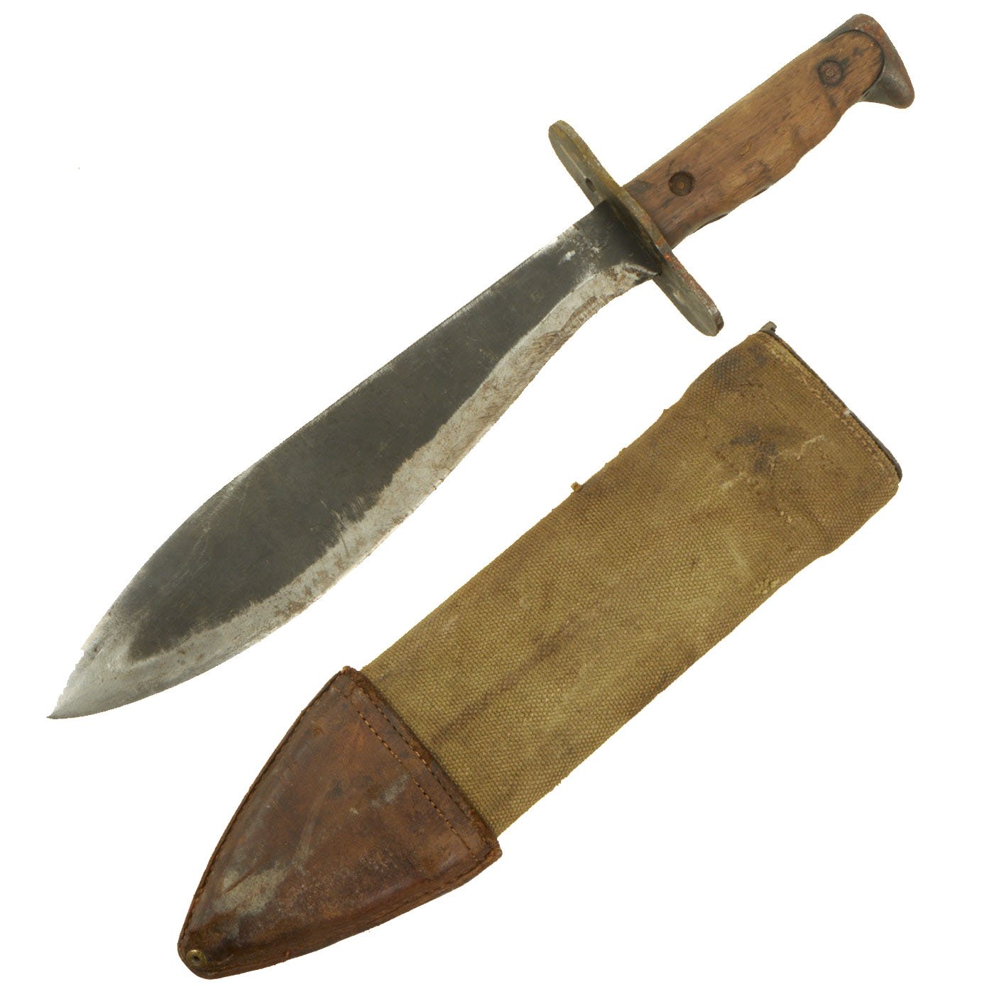 This model was a moderate simplification of the earlier 1910 Bolo made by Springfield Armory. The main difference is the lack of the catch mechanism on the scabbard and grip, though the crossguard still had a hole so that it could be used with earlier scabbards. It was manufactured by contractors such as Plumb and A.C. Co. The blade ricasso is marked: