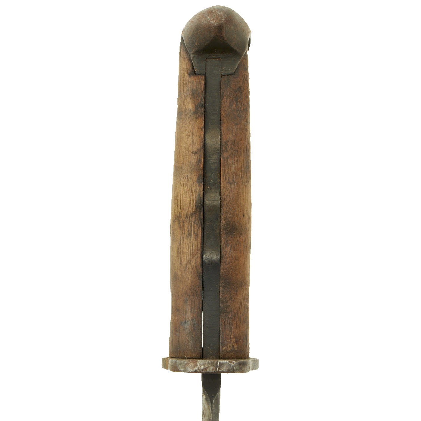 This indicates production by Rock Island Arsenal, the "Arsenal of Democracy" in Illinois. The 1916 date and hook on the scabbard throat show that this is in fact a scabbard for the earlier Model 1910 bolo, used with a Model 1917. The hook fits perfectly into the hole on the crossguard. The scabbard is in good service worn condition, showing weathering and use. The loop and hook for attachment to a USGI pistol belt have also completely torn away.