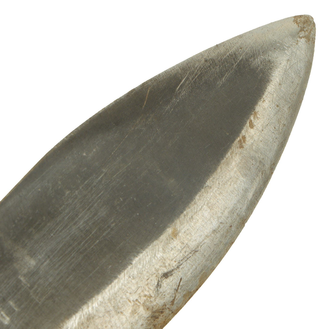 Blade and ricasso still have most of the original black finish, and are in very good condition. There is however definitely wear, and this blade has been sharpened multiple times, which has changed the blade profile a bit. The main edge is sharpened from both sides along the entire edge, and the blade is definitely a bit lighter and narrower now. This has also removed some of the markings on the ricasso.