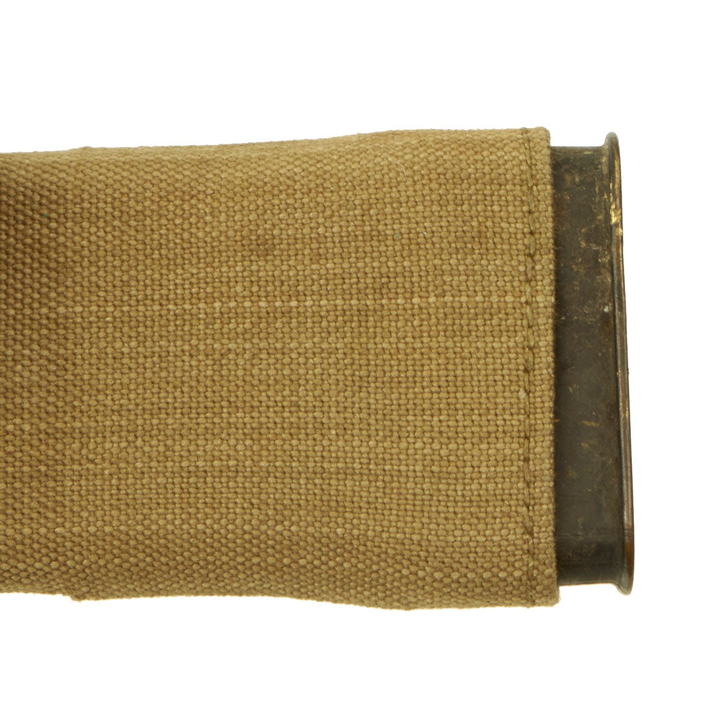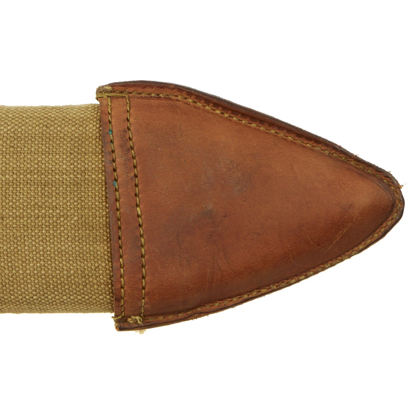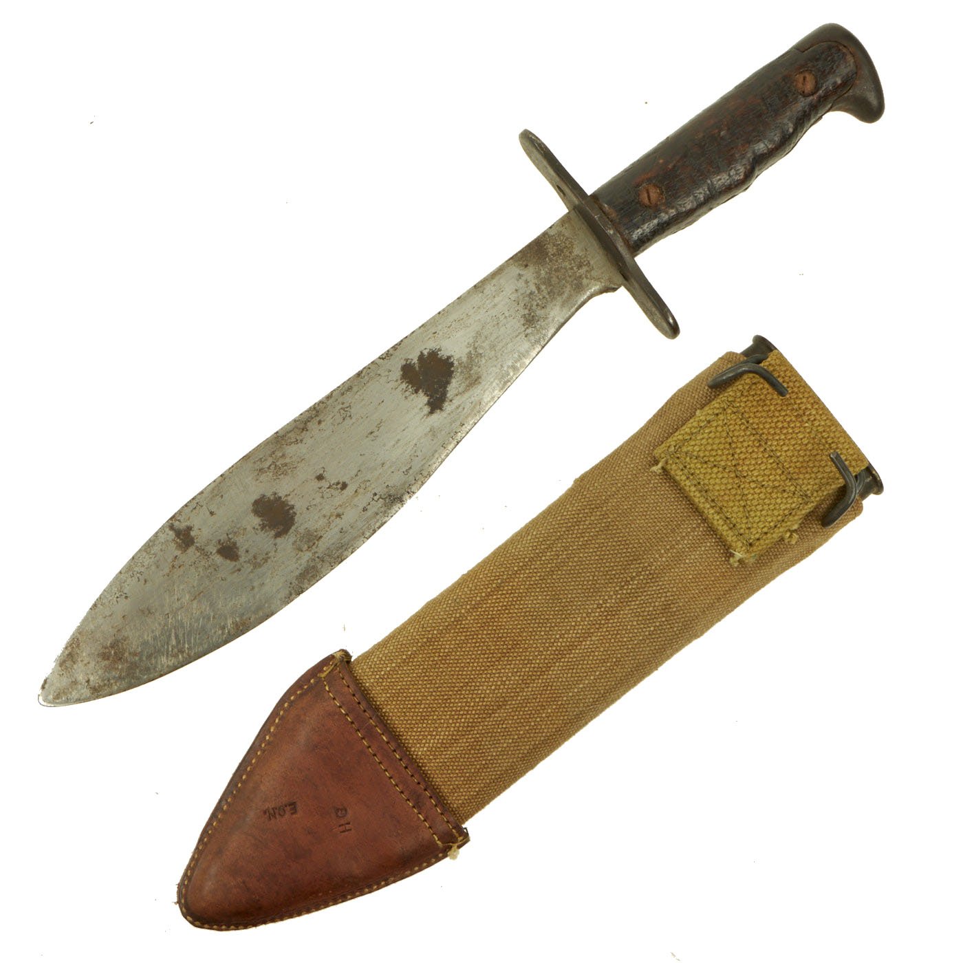 The leather tip of the canvas scabbard sleeve is maker marked H G with inspector marking E.O.N.. The scabbard is in very good condition, with no real issues with the canvas or leather portions aside from the expected wear from 100 years of age, and a bit of fabric shrinking. Really a great example of one of these scabbards.