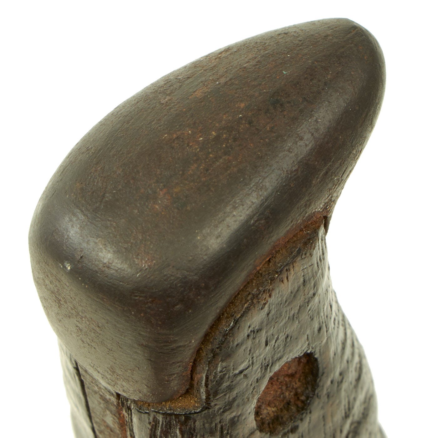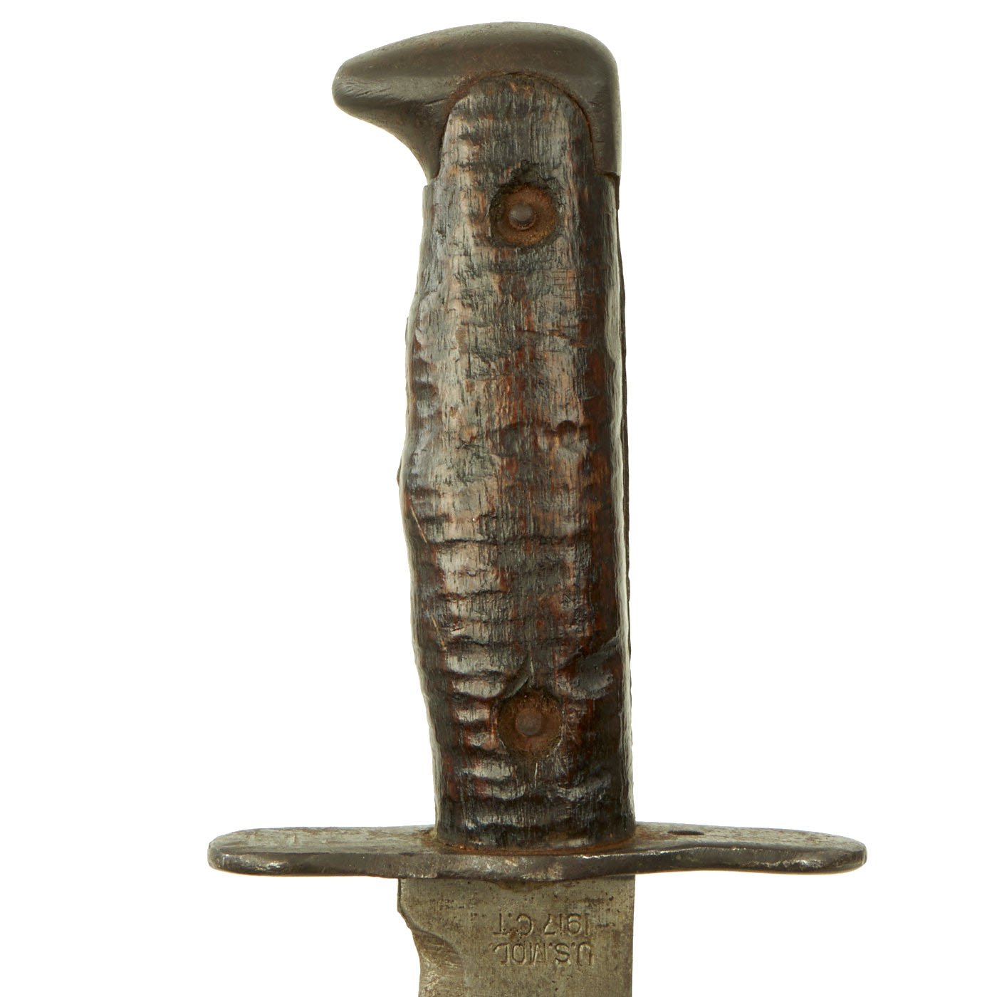 Blade and ricasso have had most of the original finish removed, with some areas of light oxidation. This definitely appears to be a bolo that saw significant use in the field. It has definitely been sharpened multiple times, but it was well done, most likely at arsenal. The main edge of the model 1917, such as this one, is mostly ground from one side, while the other side was left flat. The original profile is still mostly intact.