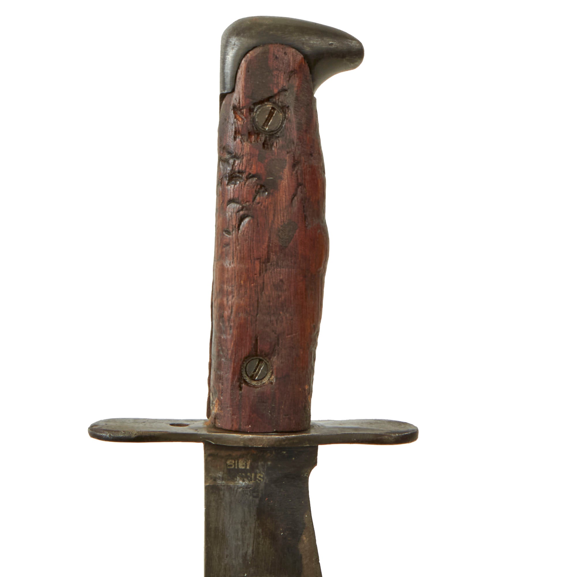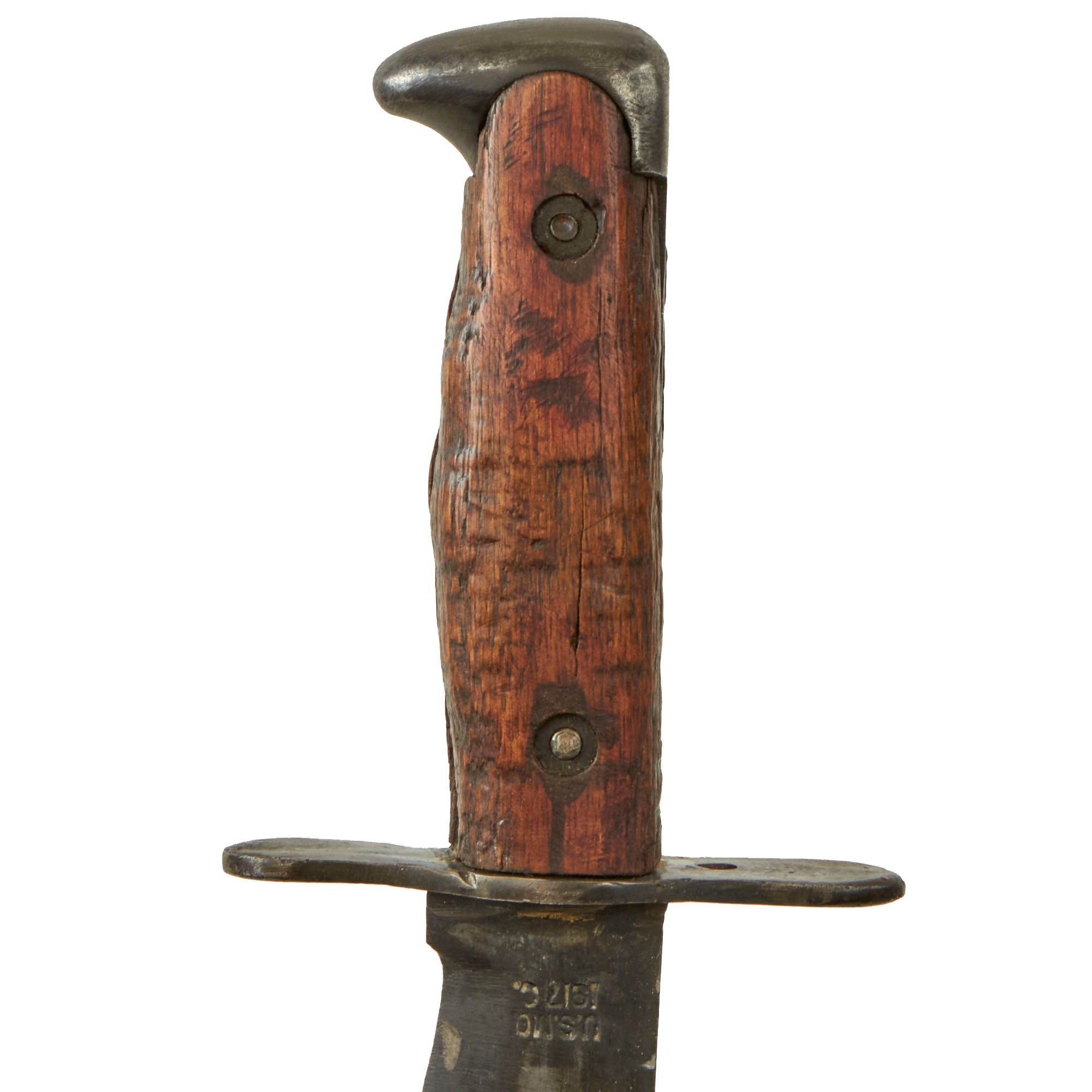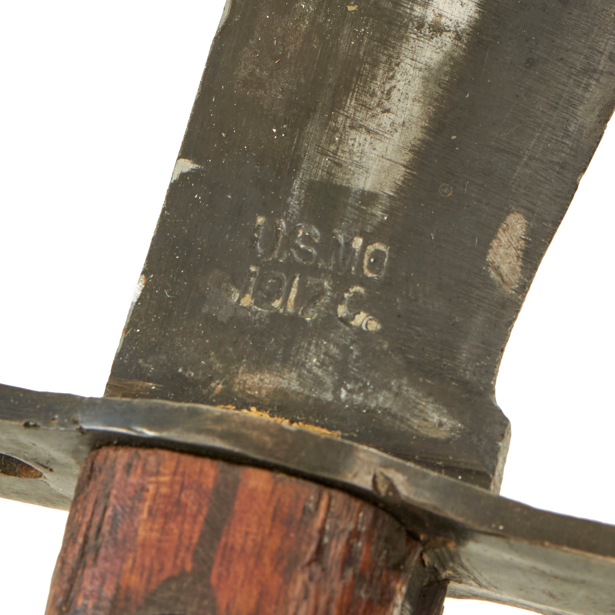 This model was a moderate simplification of the earlier 1910 Bolo made by Springfield Armory. The main difference is the lack of the catch mechanism on the scabbard and grip. It was manufactured by contractors such as Plumb and A.C. Co. The blade ricasso of this example is marked: