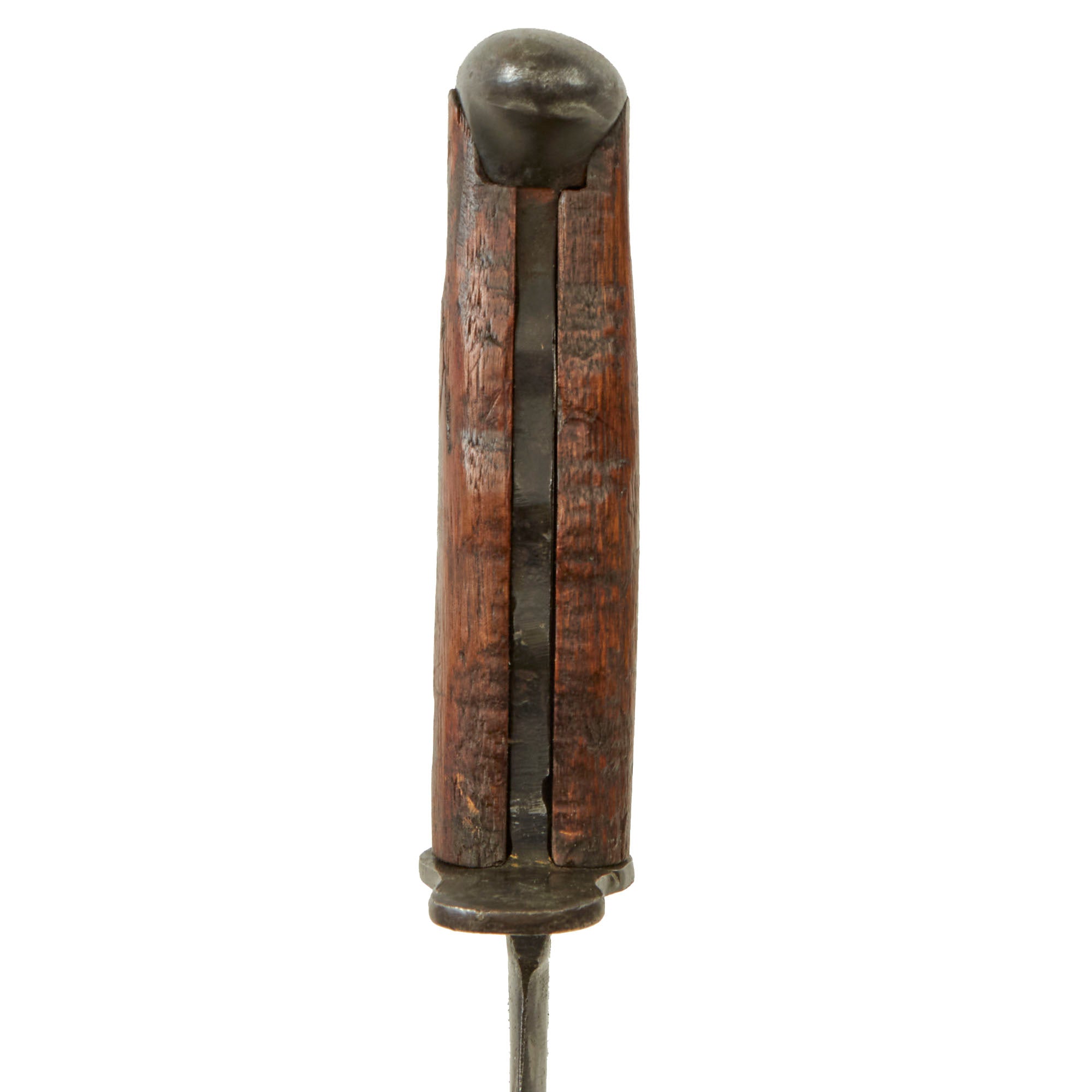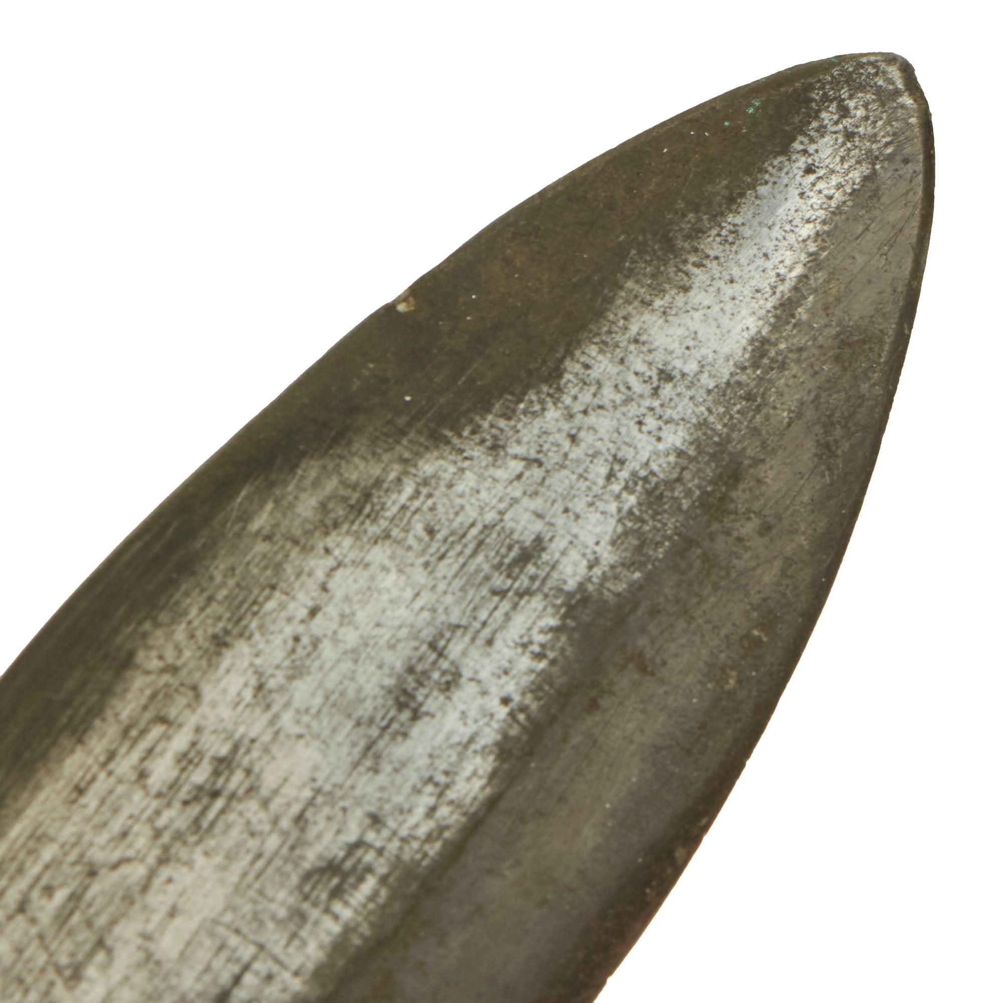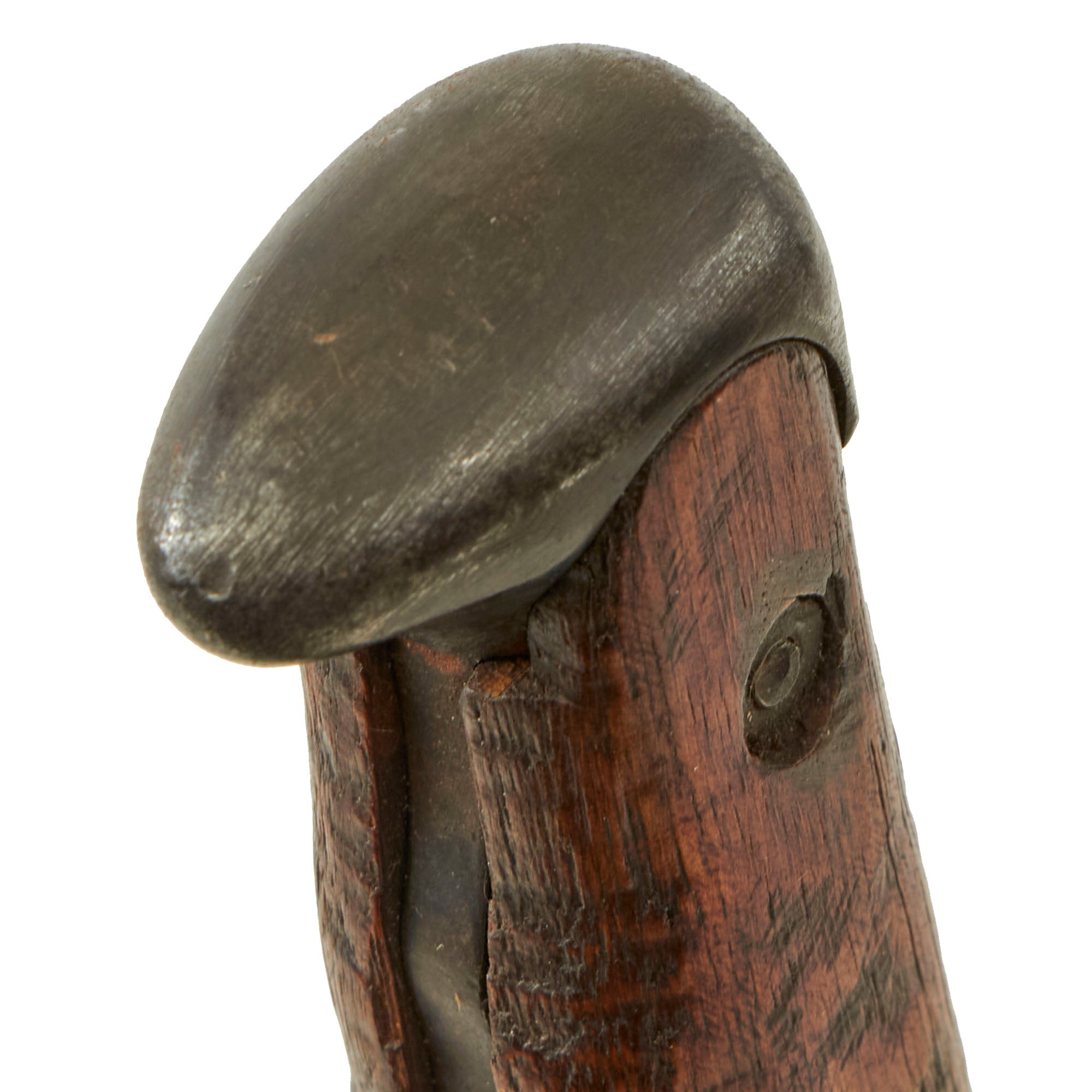 This model was a moderate simplification of the earlier 1910 Bolo made by Springfield Armory. The main difference is the lack of the catch mechanism on the scabbard and grip. It was manufactured by contractors such as Plumb and A.C. Co. The blade ricasso of this example is marked: