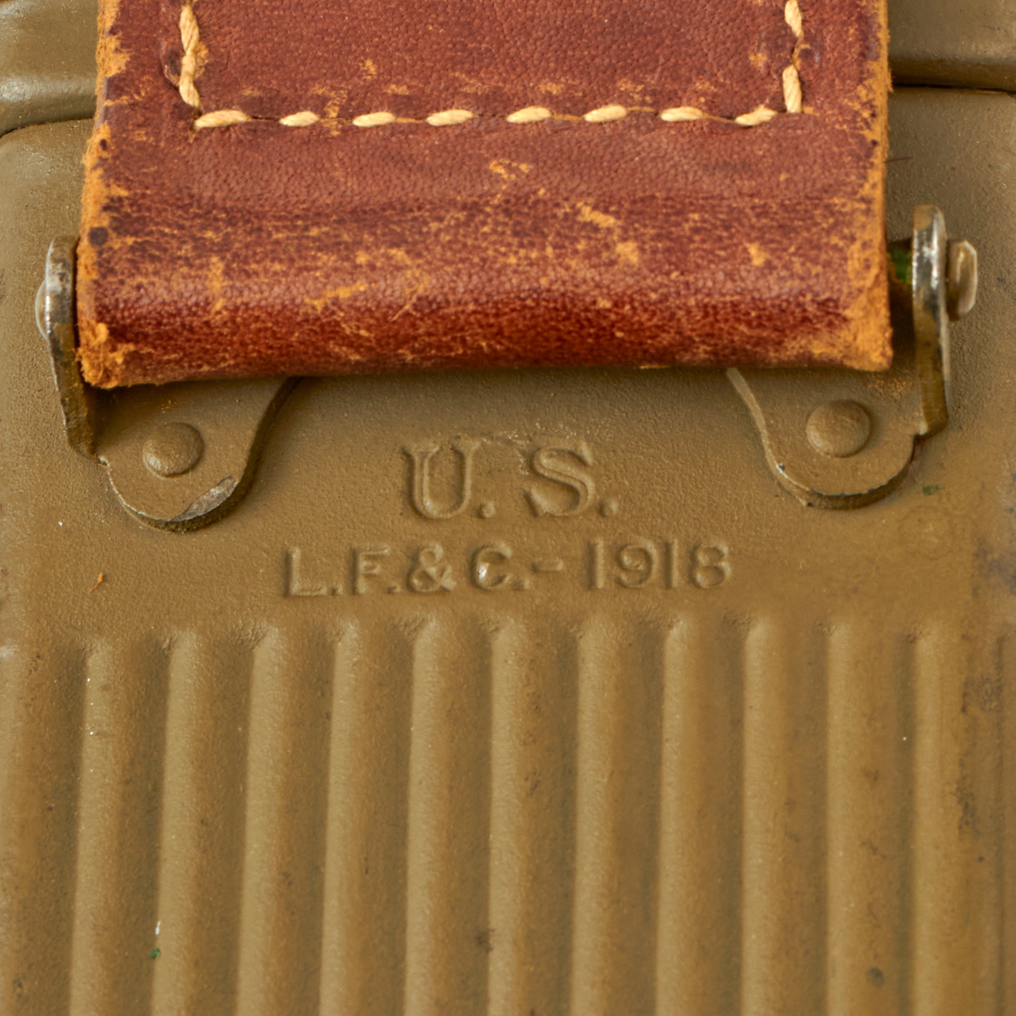 The scabbard is an all steel example with leather belt hanger with the standard wire hanger for the pistol belt. The scabbard is marked as being made by Landers, Frary & Clark and is dated 1918.