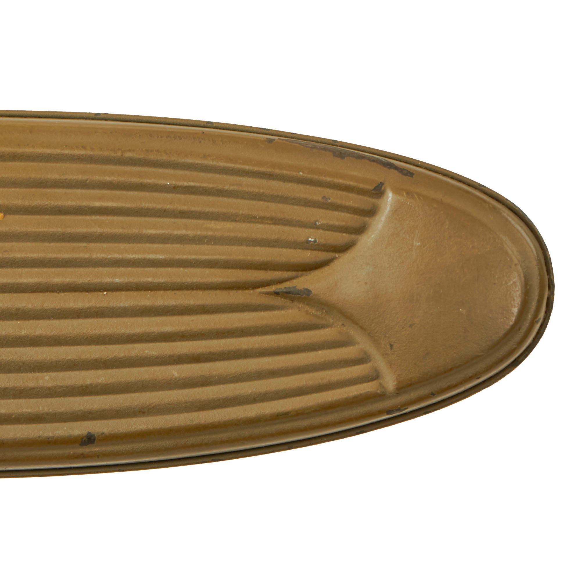 Blade and ricasso still have some of the original black finish, and are in good condition. It has seen some level of use and sharpening, which has removed the finish from most of the blade. There is also the usual runner wear on both sides of the blade. The main edge of the model 1917, such as this one, is mostly ground from one side, while the other side was left flat. There is just some light sharpening from the flat side, which was the quickest way to get the edge back.