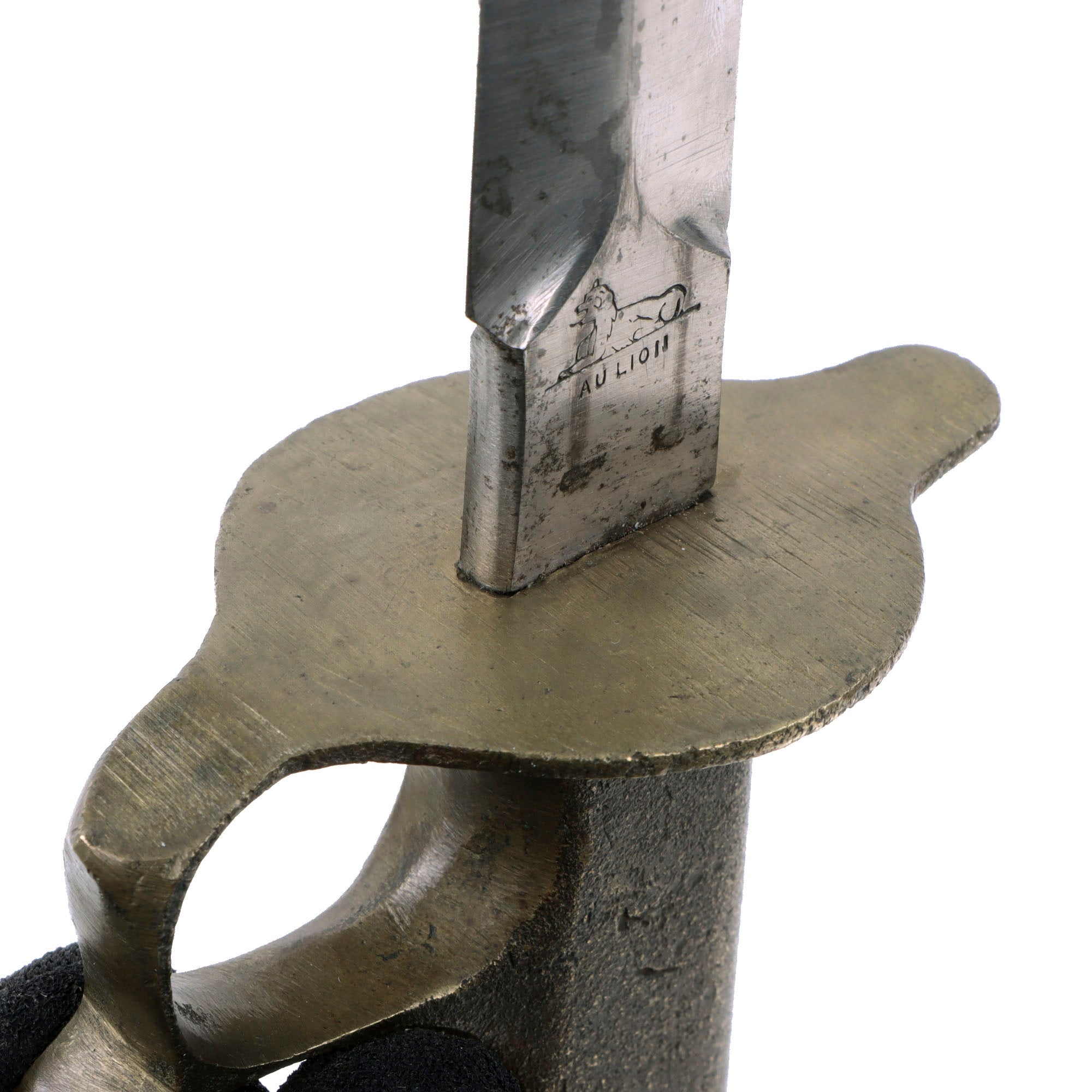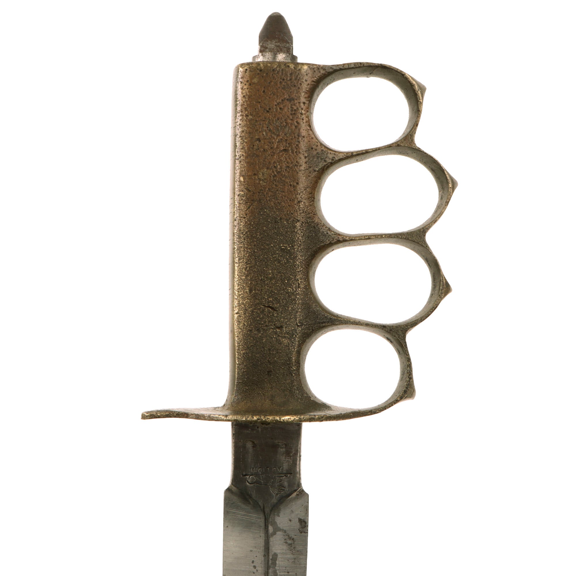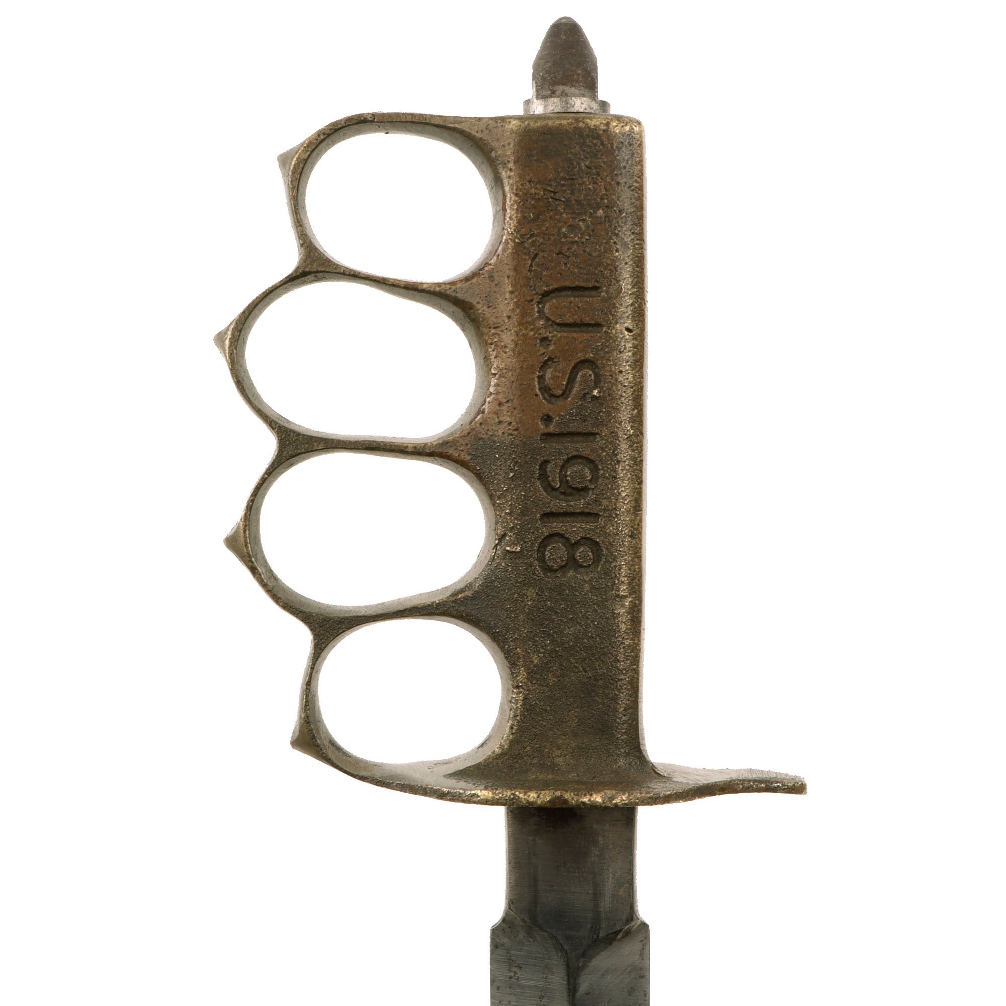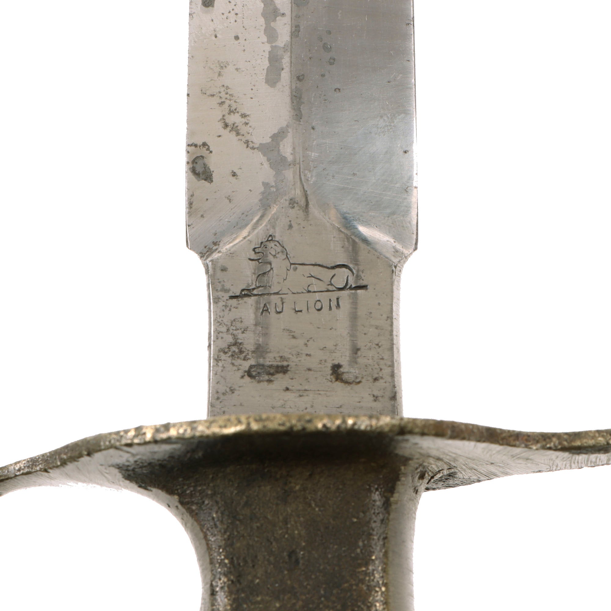 The knives were also produced in France and are marked with the usual 1918 and US marks, as well as Au Lion on the blade. In order to save time in getting the new knife to troops in the field, the first Mark I trench knives were procured from a French manufacturer, Au Lion (Au Lion/Société Générale, France). Whether this mark was a maker's mark or simply a motto is not known. The U.S. M-1918 Mark I Trench Knife is easily identifiable due to its large "brass knuckle" style guard and grip. The knives were 11 ¾" in overall length, with a 6 ¾" dagger style blade. The brass grips were marked U.S. 1918 and with the makers name or initials.