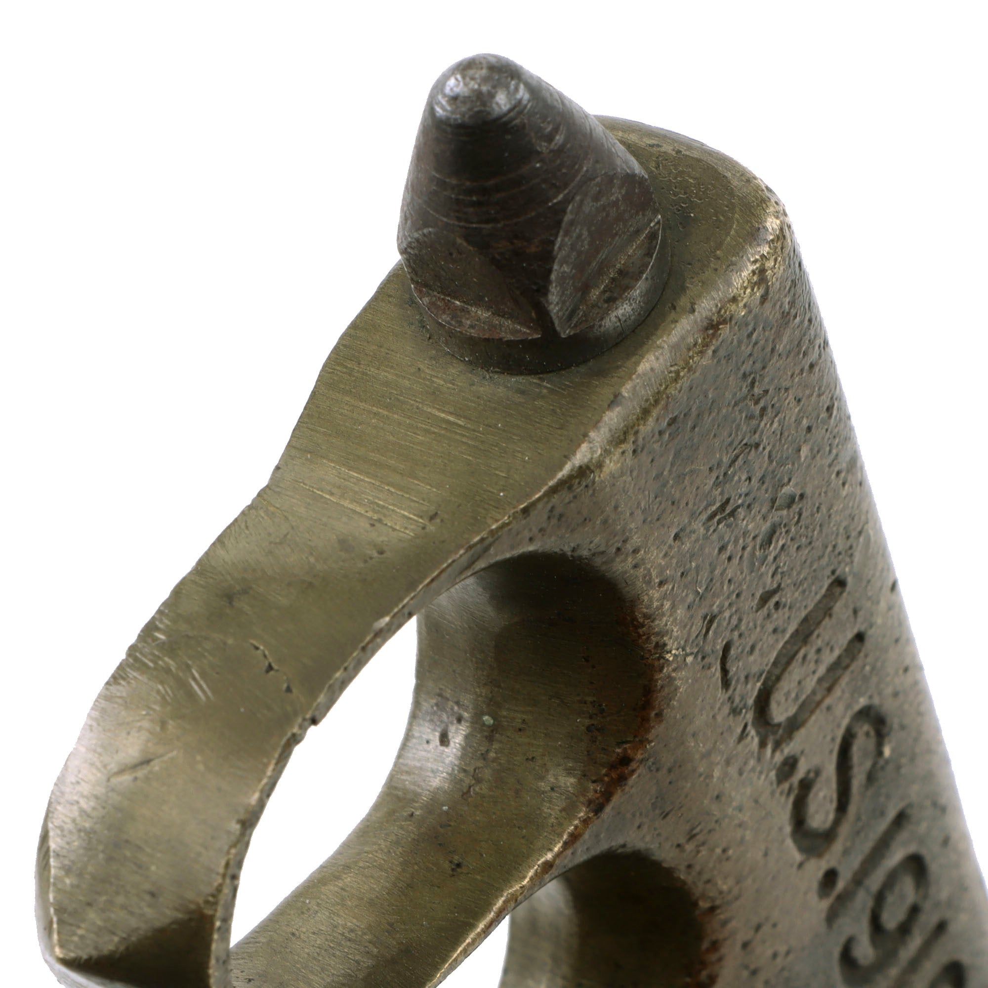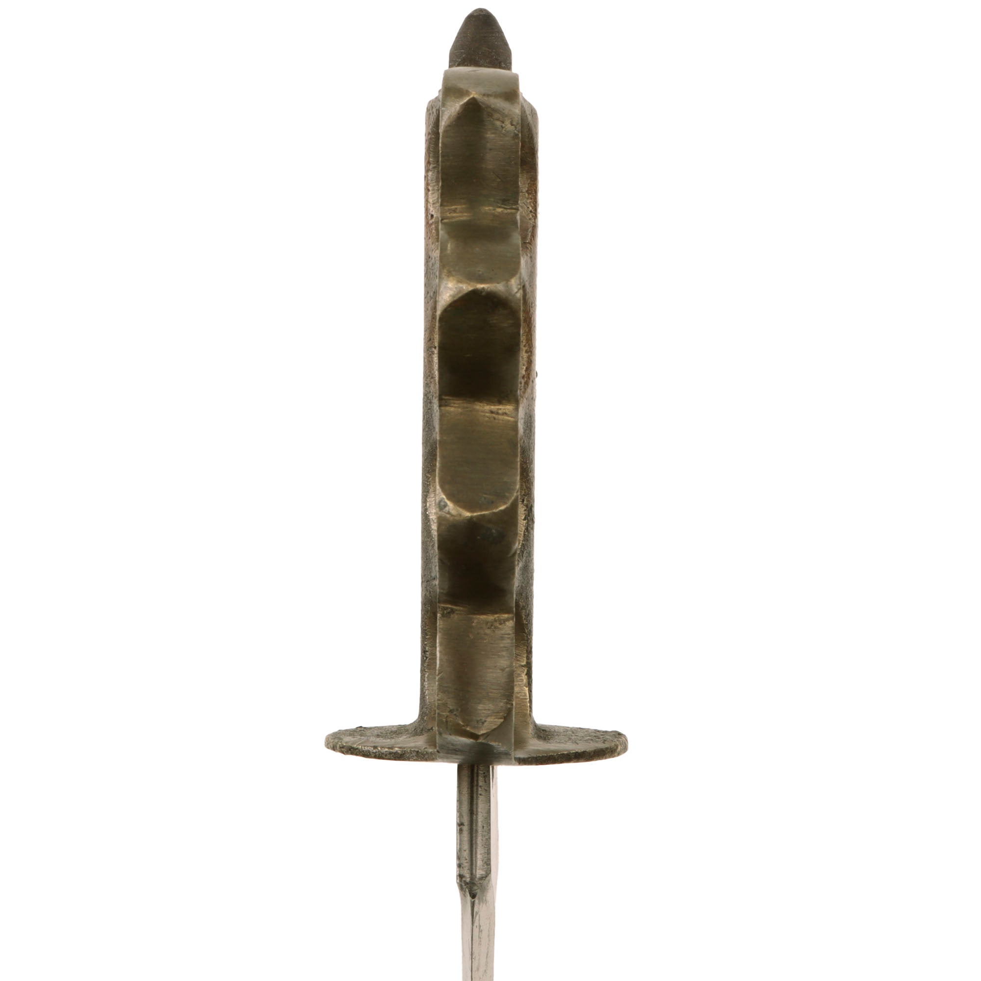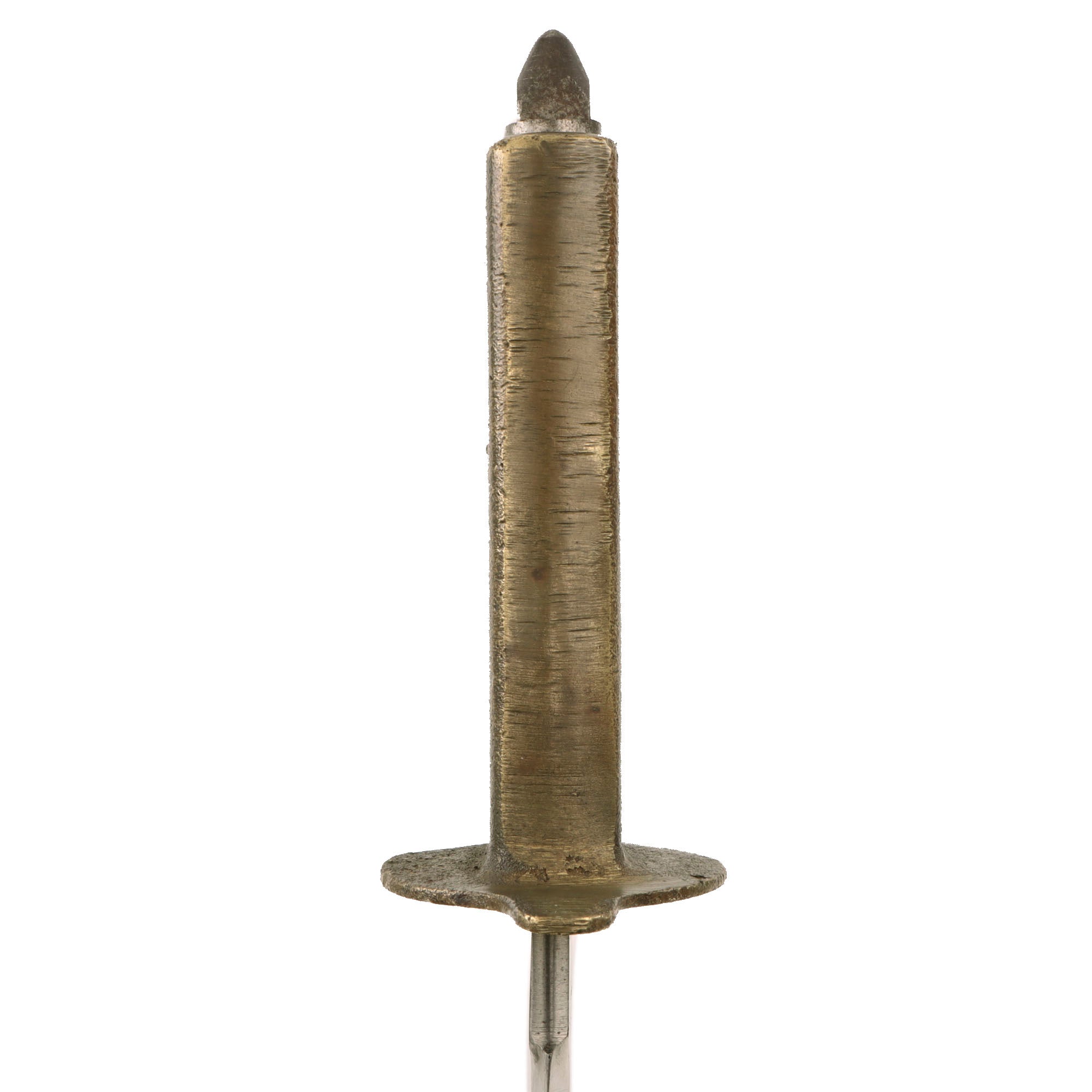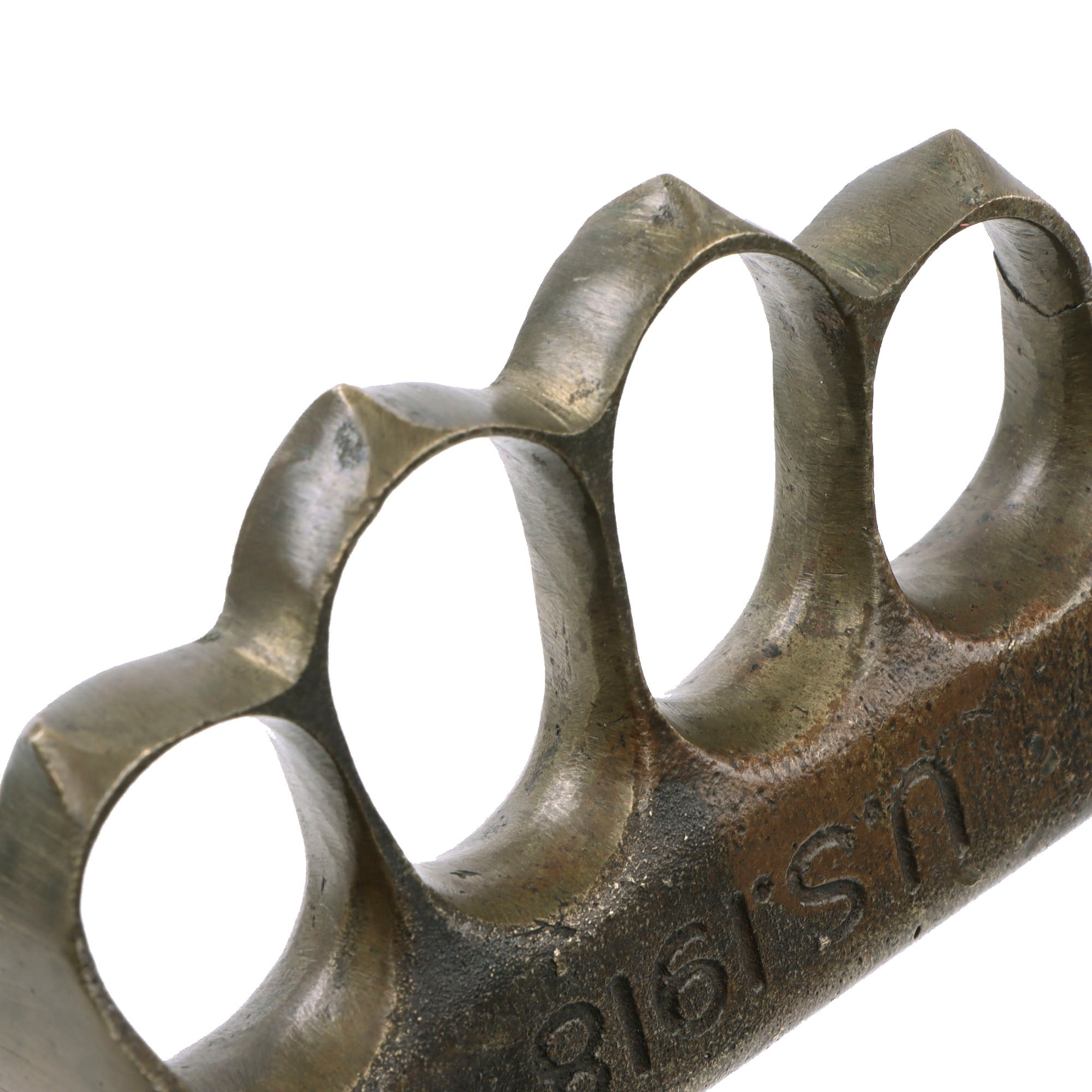 The French made grips are cast with a variety of minor differences, and this one is cast with two grooves along the top edge of the grip. The brass knuckle grip has a lovely brass color with a heavy amount of patina, and spots of oxidation & verdigris.