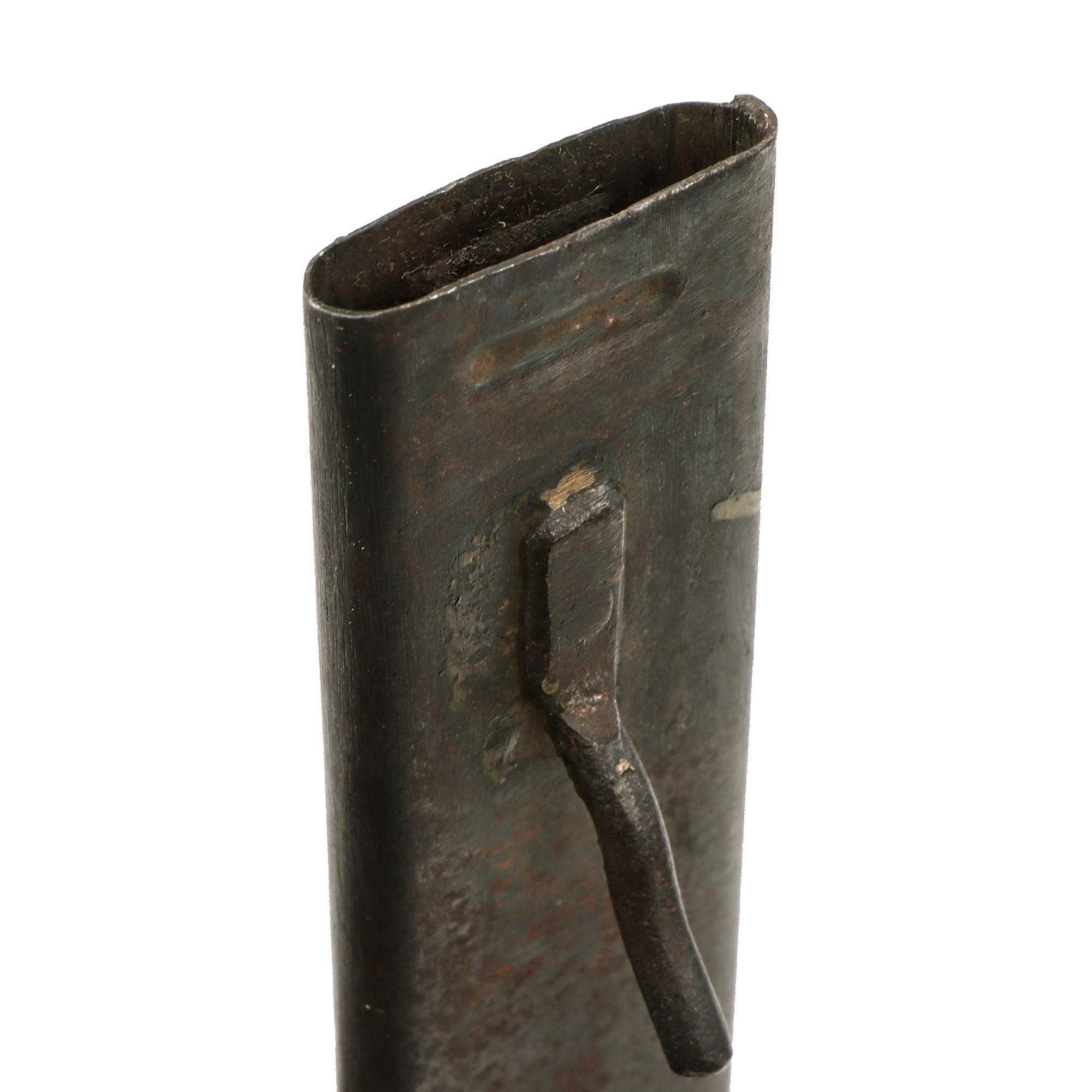 The overall construction of the scabbard is more simple than the US made scabbards. This example does have some heavy dents, as these were made from much thinner steel than the US version, and the construction is less robust. Both of the prongs are intact as well.
