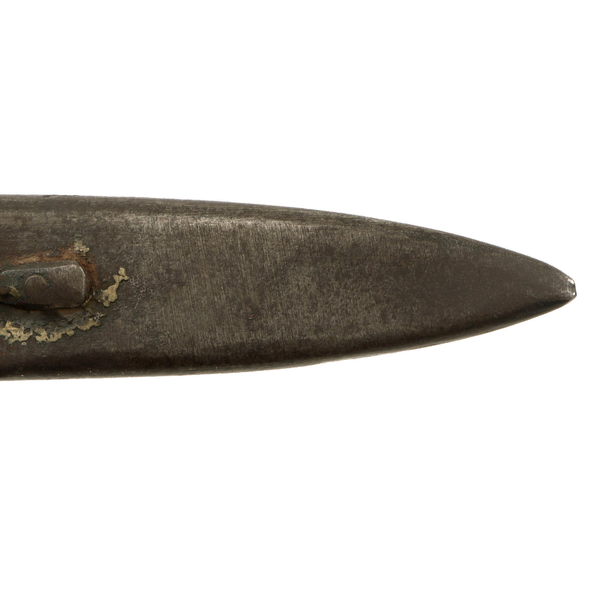 The blades of most of the AU LION knives were produced in the white, with no finish on the blade. There is some oxidation spotting as shown, but no edge nicks. The steel scabbard is in great condition, and unlike most examples still has both belt prongs intact, although they are a bit dented. There is a fair bit of denting to the scabbard as shown. The scabbard retains much of the original finish, and as with most Au Lion scabbards, there are no markings.