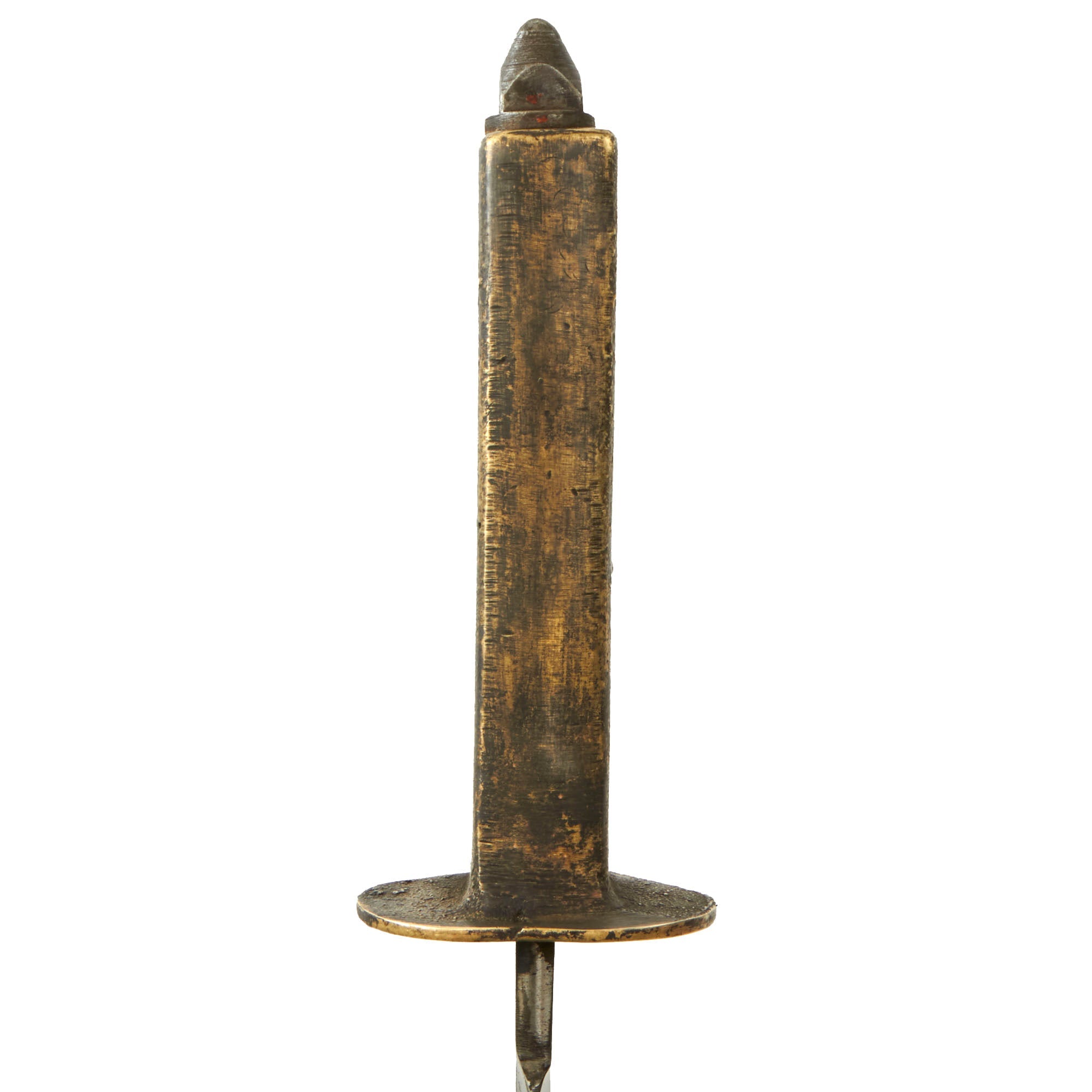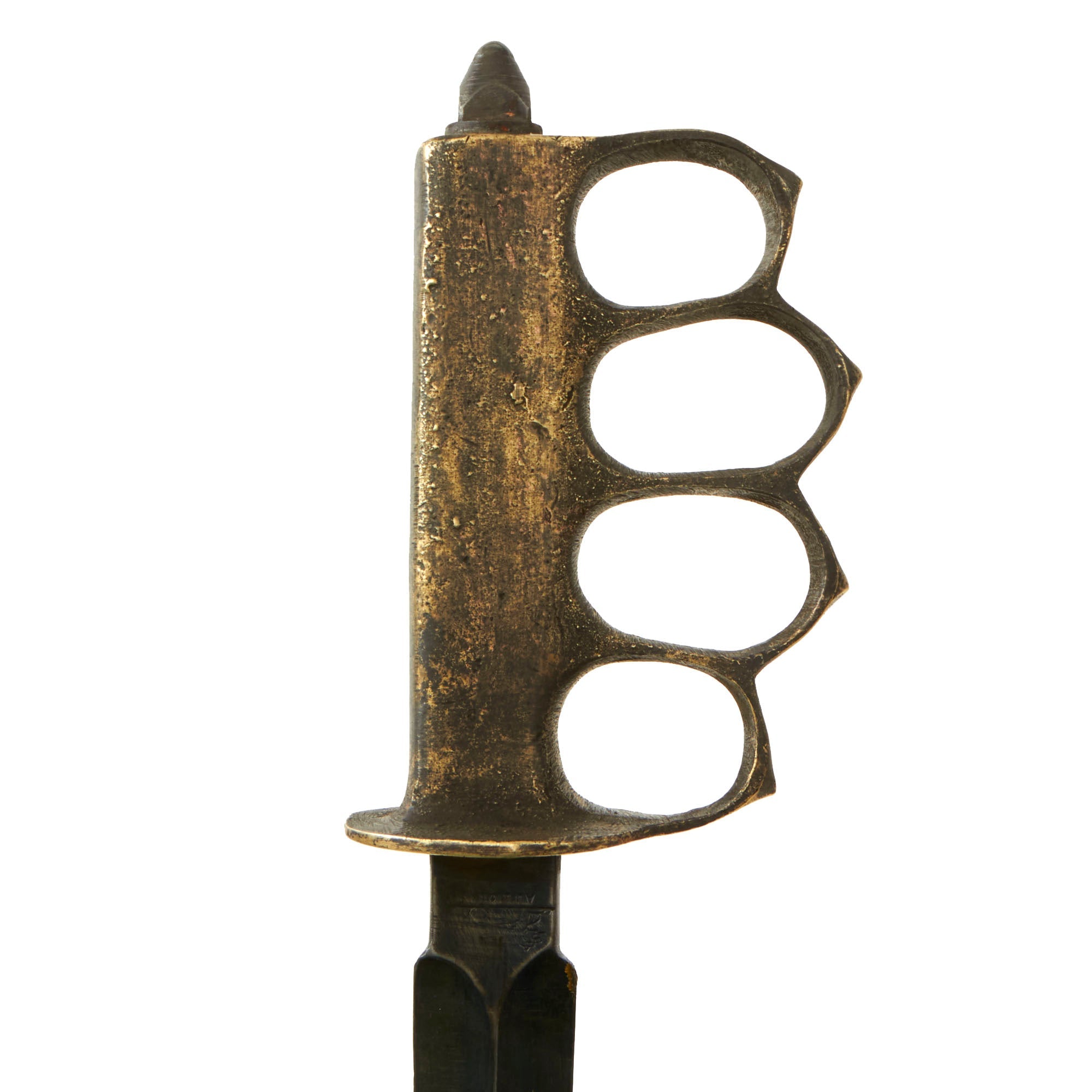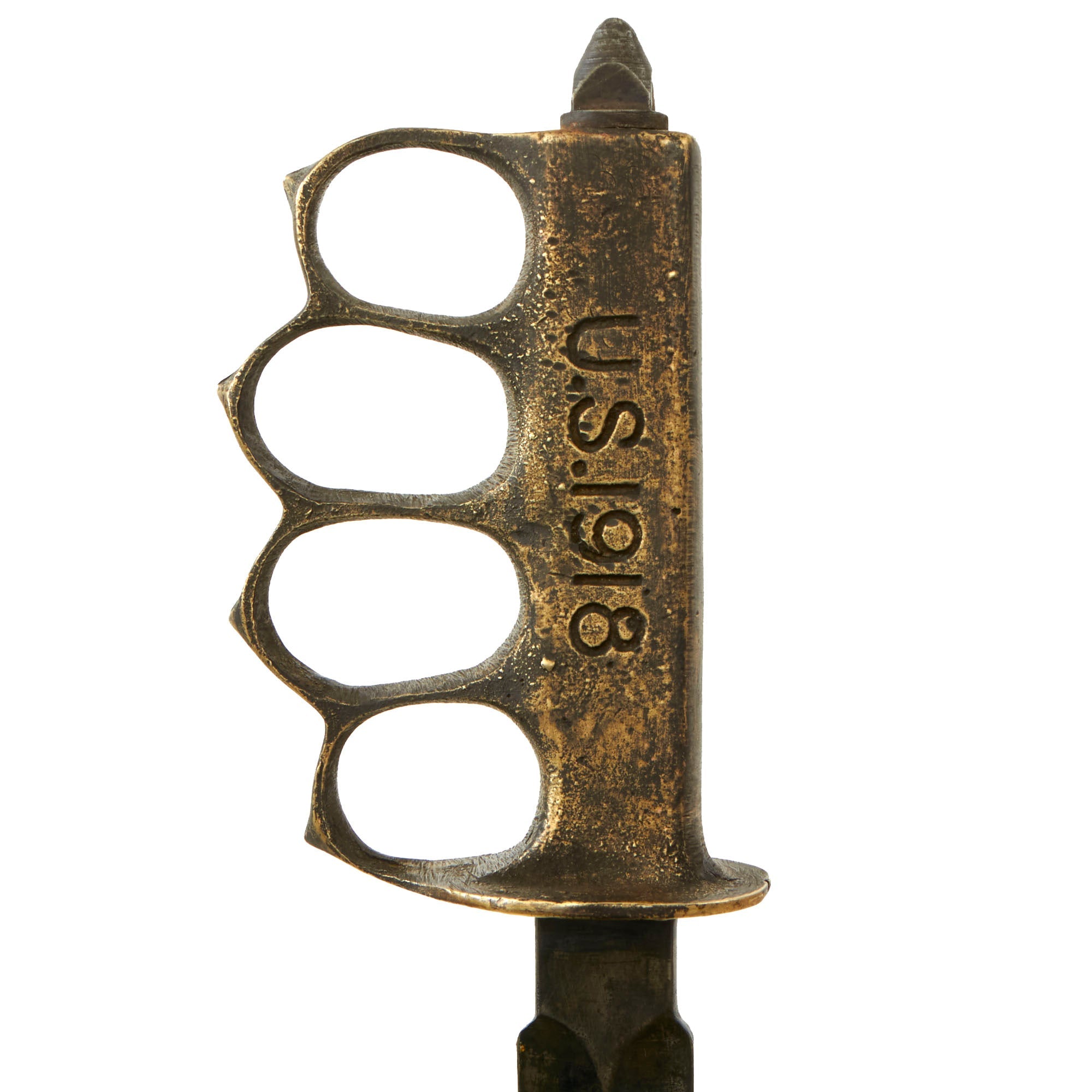 Overall this is a fine example of the very popular and collectible World War I era US trench knife. The knife is 100% original and the scabbard is reproduction, and would make a fantastic addition to any military edged weapons collection. These brass D guard knuckle knives always make a great centerpiece to any military knife display and certainly draw attention due to their size and fierce appearance.