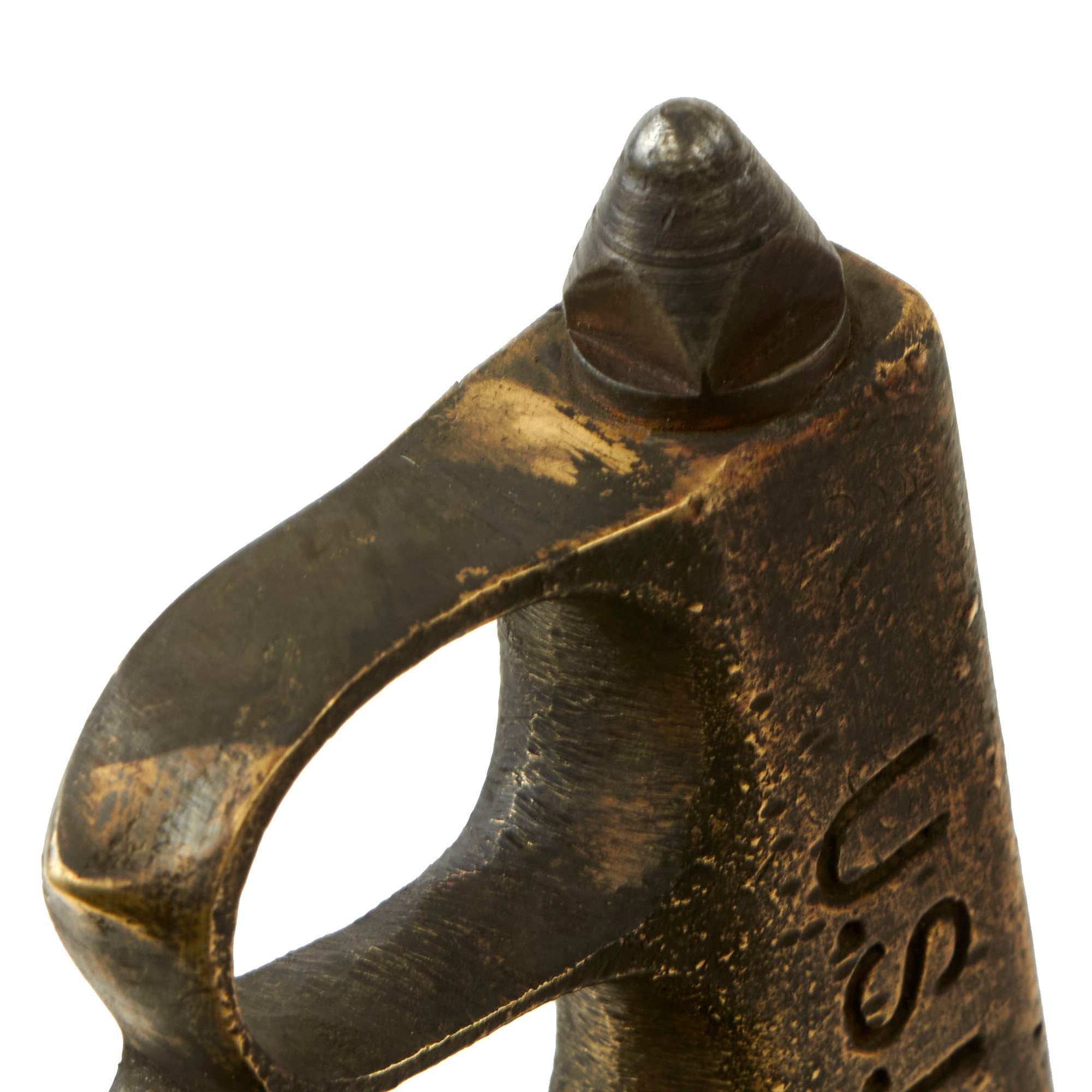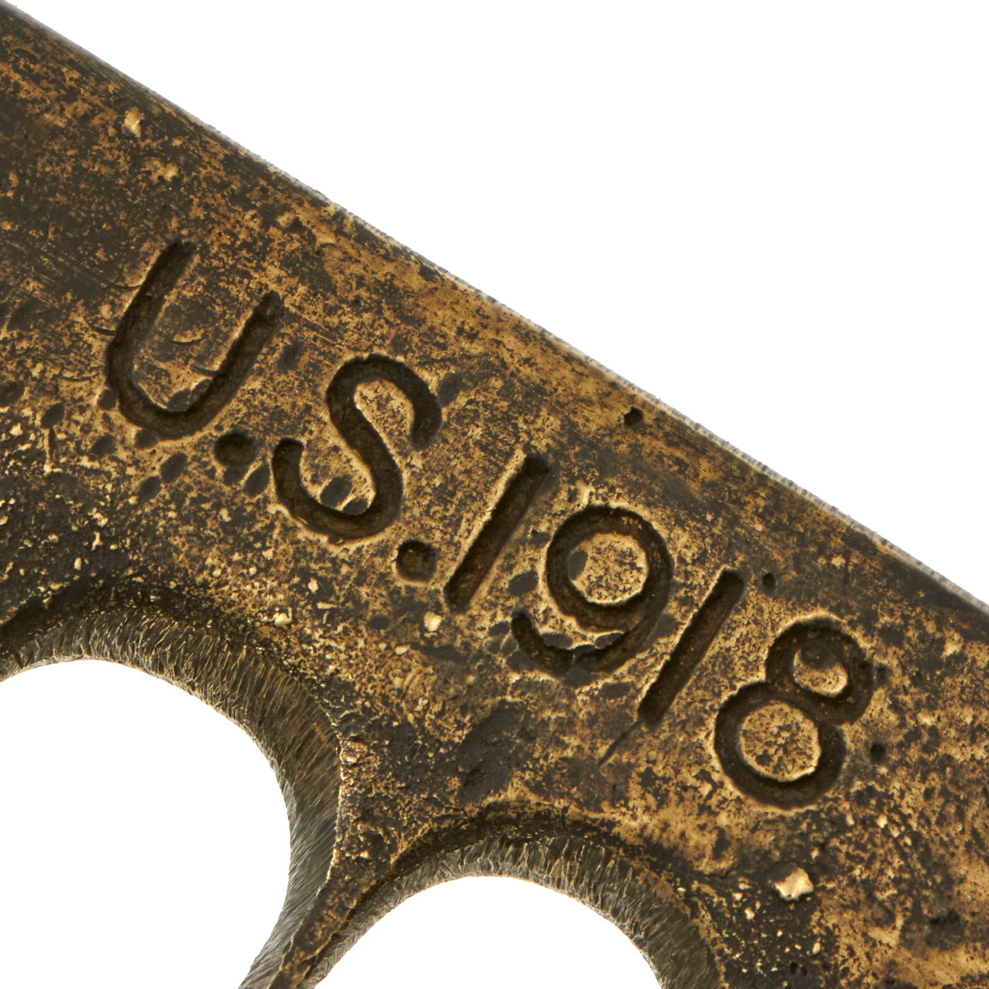 The U.S. Model 1918 Mark I Trench Knife offered here is in great service-used condition. The knife is one of the French made examples which is marked on the ricasso with a (Reclining Lion) / AU LION. The marking is on the reverse of the blade, so the blade may have been turned around at one point. The blade mark is about 90% retained. This brass grip of the knife is clearly marked: U. S. 1918. As is usually the case with the AU LION marked knives, the cast brass grip is rougher and cruder than the US made versions, with some residue as shown. As is also typical of the French made knives, the knuckle points are also less defined and not as sharp as the US made knives. The French made grips are cast with a variety of minor differences, and this one is cast with two grooves along the top edge of the grip. The brass knuckle grip has a lovely brass color with a heavy amount of patina, and spots of oxidation.