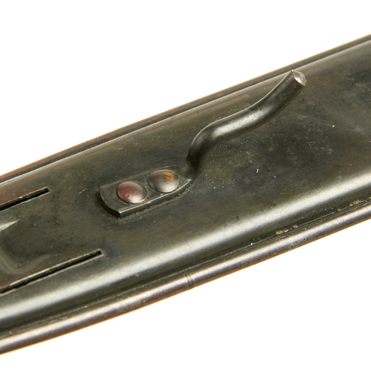 The scabbard retains about 90%+ of its original chemical blued finish. The scabbard is amazingly free of dents or dings. Usually these scabbards show significant denting and damage from use.