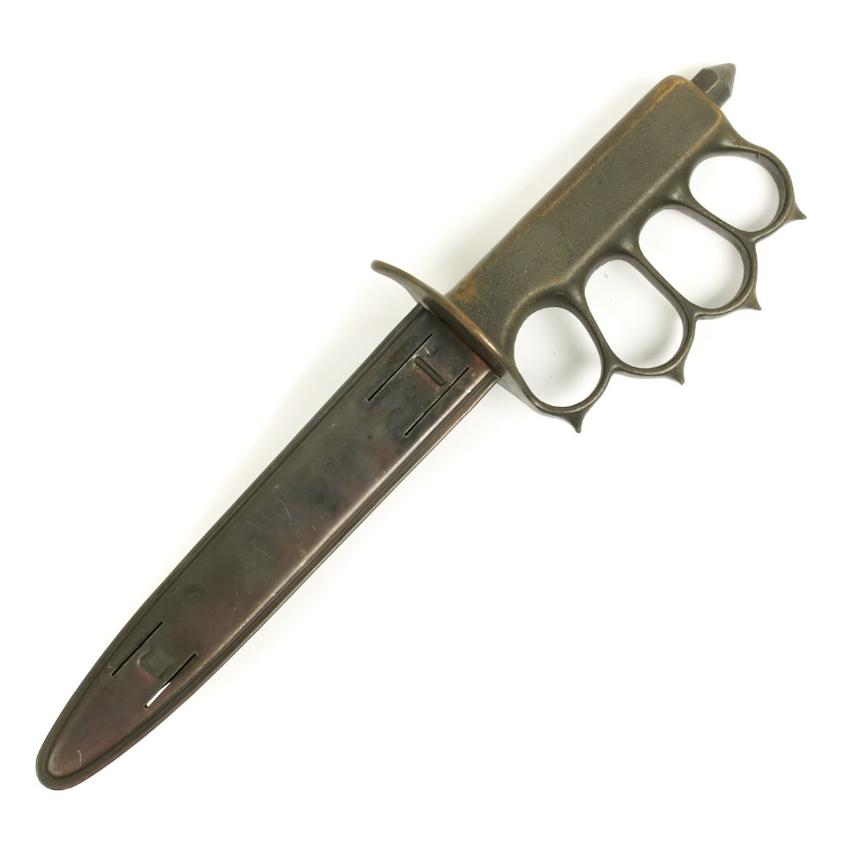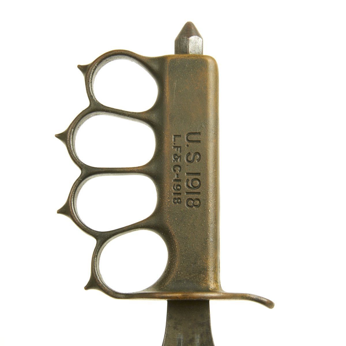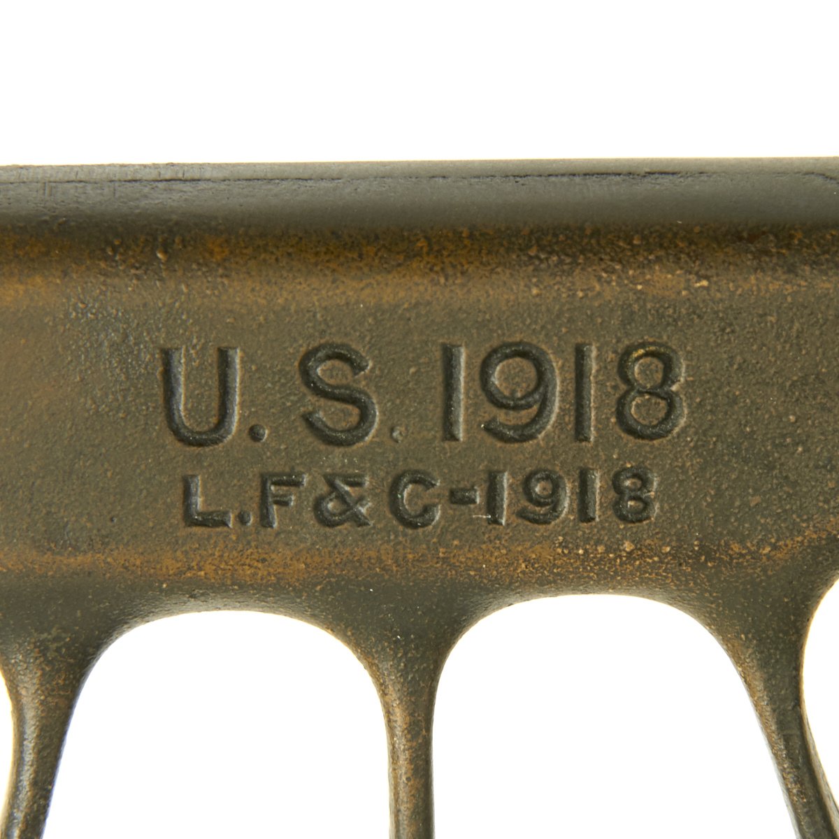 Original Item: Only One Available. This example of the U.S. Model 1918 MkI Trench Knife is offered in near mint condition. The U.S. Model 1918 Mark I Trench Knife was the second major "Knuckle Knife" to be officially adopted and issued to the US military. It was developed for use in the horrific trench warfare that typified the stalemate on the Western Front during the latter part of World War One and saw use not only there, but during World War Two as well. The knife was manufactured in the United States by Henry Disston & Sons (H.D. & S.) as well as Landers, Frary & Clark (L.F. & C.) and Oneida Community Ltd (O.C.L.). The knives were also produced in France and are marked with the usual 1918 and US marks, as well as Au Lion on the blade. Whether this mark was a maker's mark or simply a motto is not known. The U.S. M-1918 Mark I Trench Knife is easily identifiable due to its large "brass knuckle" style guard and grip. The knives were 11 ¾" in overall length, with a 6 ¾" dagger style blade. The brass grips were marked U.S. 1918 and with the makers name or initials.