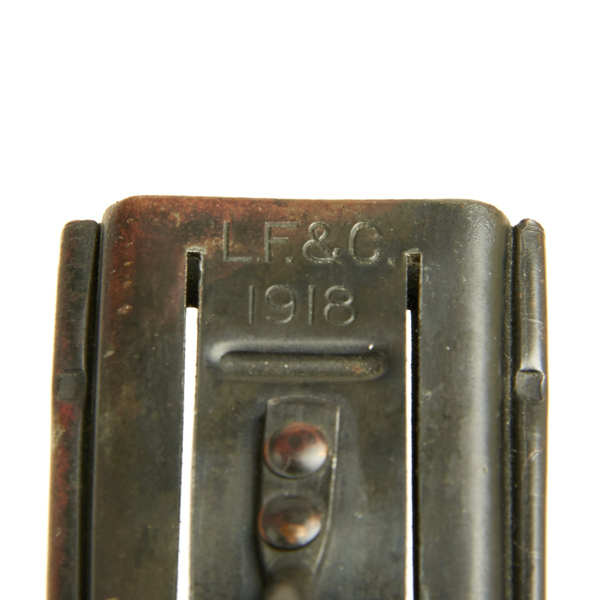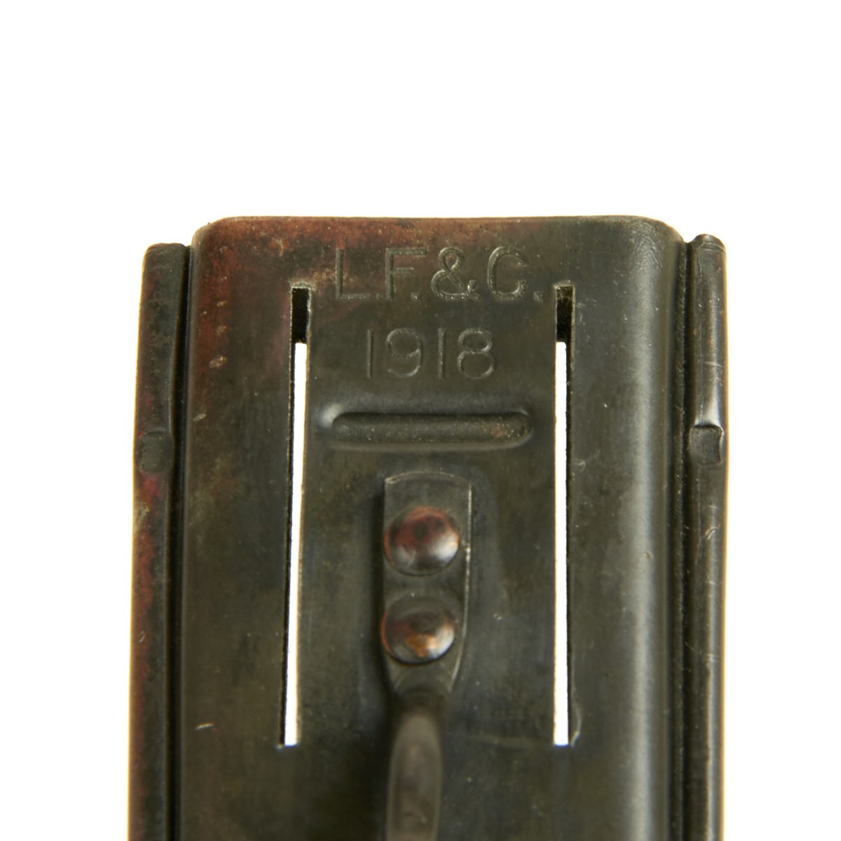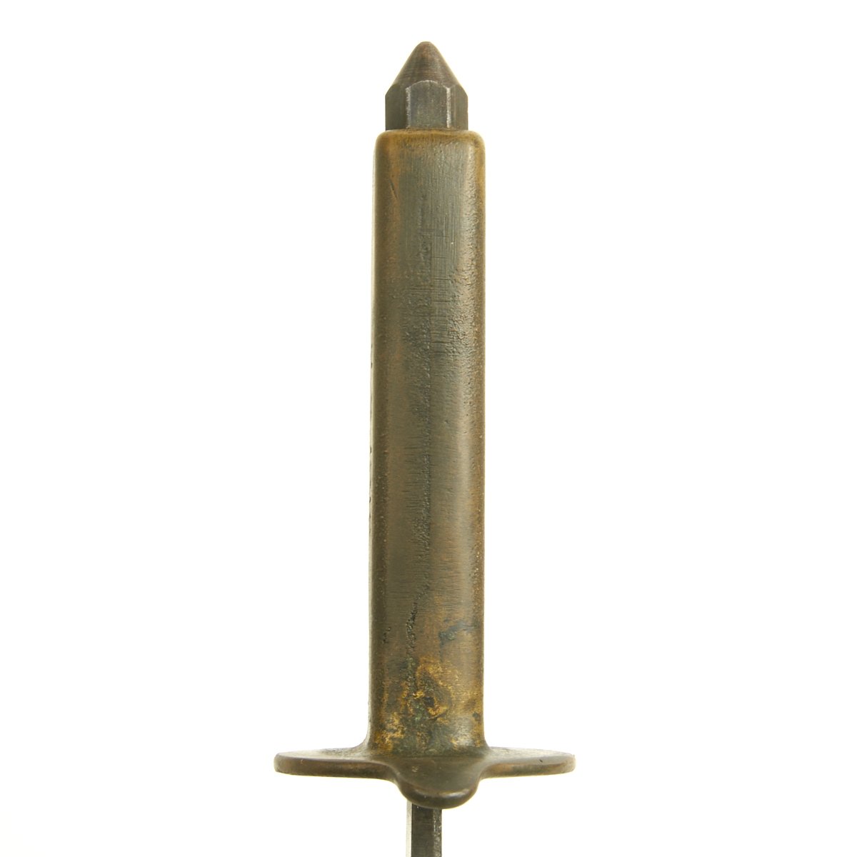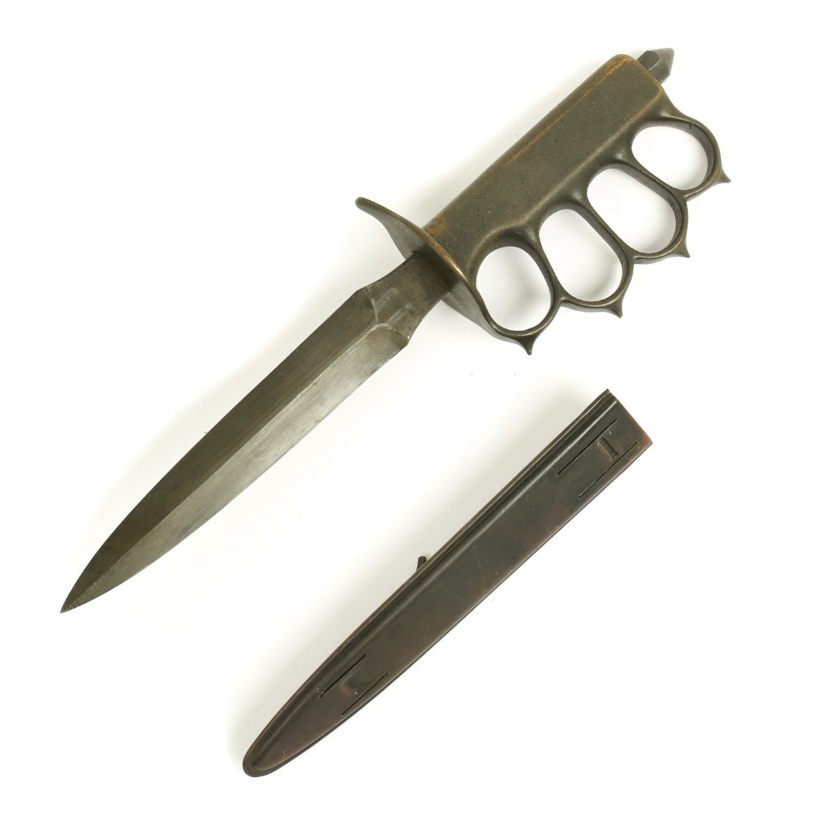 Original Item: Only One Available. This example of the U.S. Model 1918 MkI Trench Knife is offered in near mint condition. The U.S. Model 1918 Mark I Trench Knife was the second major "Knuckle Knife" to be officially adopted and issued to the US military. It was developed for use in the horrific trench warfare that typified the stalemate on the Western Front during the latter part of World War One and saw use not only there, but during World War Two as well. The knife was manufactured in the United States by Henry Disston & Sons (H.D. & S.) as well as Landers, Frary & Clark (L.F. & C.) and Oneida Community Ltd (O.C.L.). The knives were also produced in France and are marked with the usual 1918 and US marks, as well as Au Lion on the blade. Whether this mark was a maker's mark or simply a motto is not known. The U.S. M-1918 Mark I Trench Knife is easily identifiable due to its large "brass knuckle" style guard and grip. The knives were 11 ¾" in overall length, with a 6 ¾" dagger style blade. The brass grips were marked U.S. 1918 and with the makers name or initials.