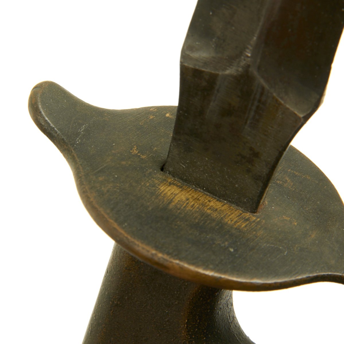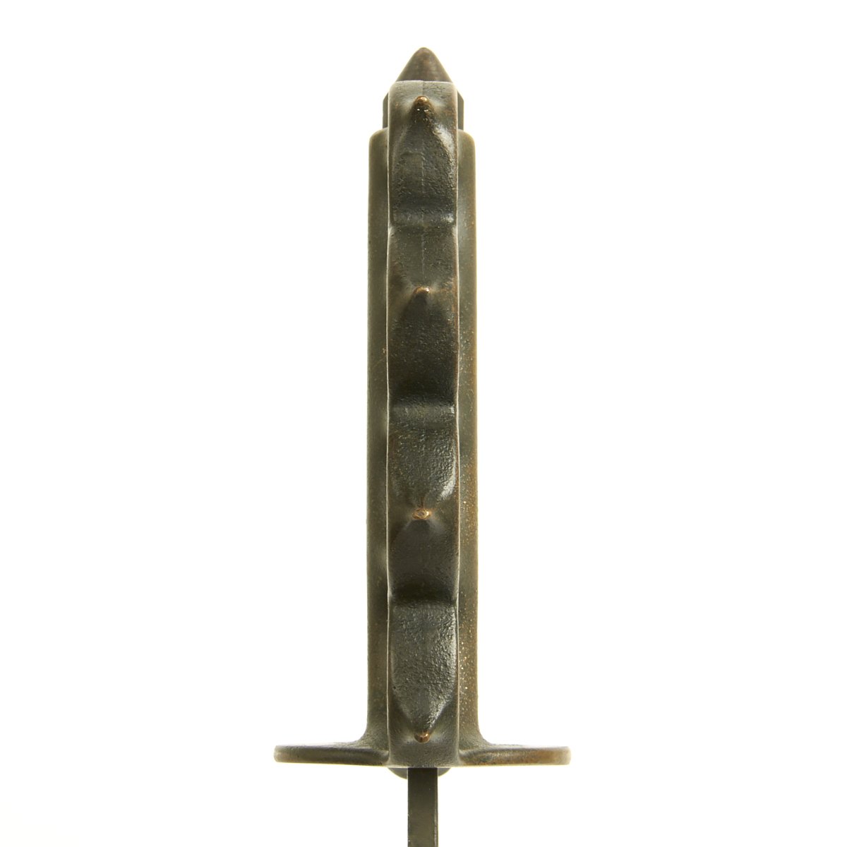 The brass grip and knuckle guard retain approximately 80% of their original blackened finish and is blended with a lovely, un-cleaned deep, bronze patina. The blackened steel dagger blade is smooth and retains about 85%+ of the original blackened finish, with some very minor fading and wear - mostly from being inserted and removed from the steel scabbard. Both edges of the blade are still sharp and are nick free.
