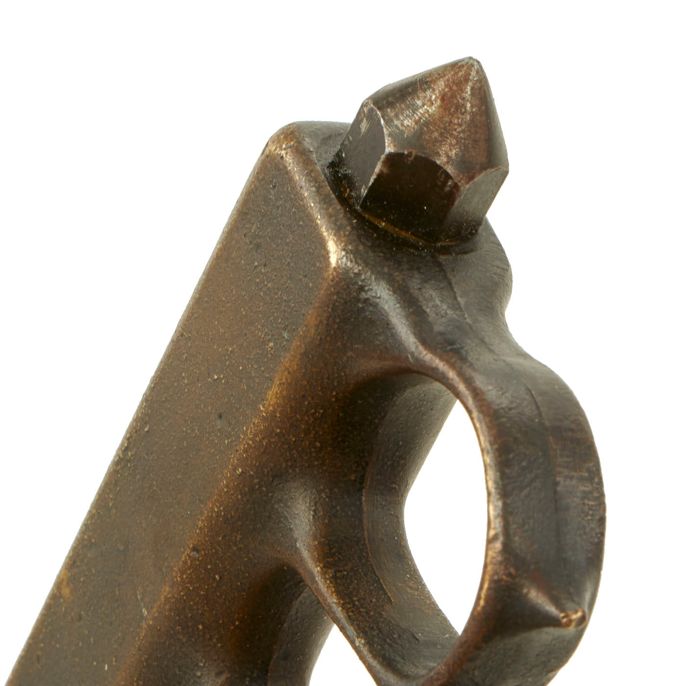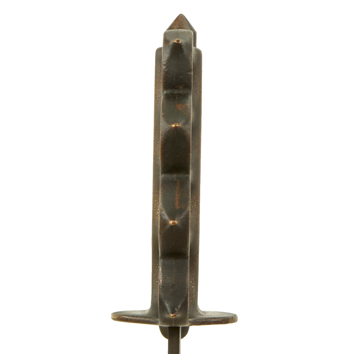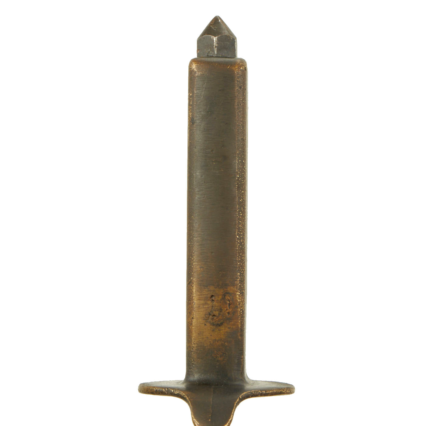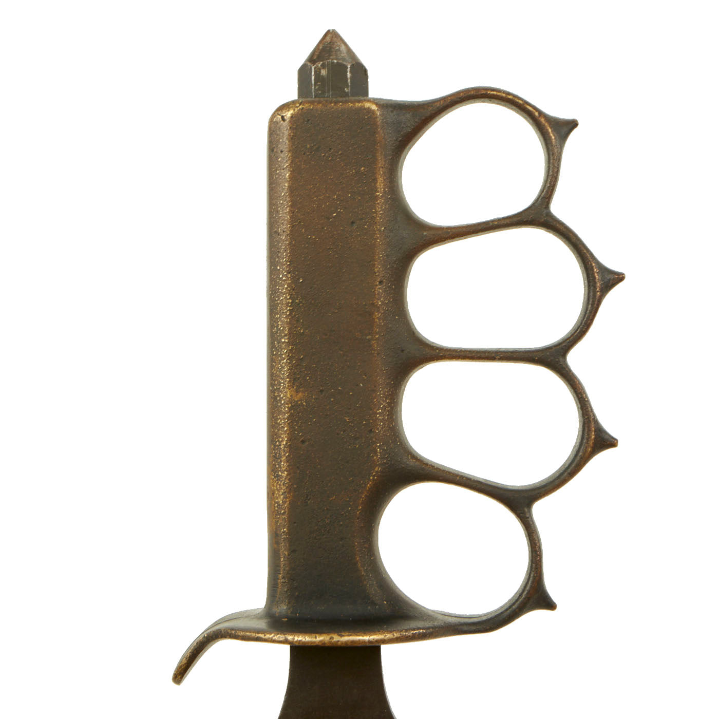 The brass grip and knuckle guard blackening is mostly worn away, as seen on most examples. In its place is a lovely aged brass patina. The steel dagger blade still has much of the original factory grind on the edge, and still has some of the original factory finish. The very last 1-2mm of the tip is broken away unfortunately, and overall it does have a worn patina from cleaning and oxidation. There are also signs of further sharpening to the blade.