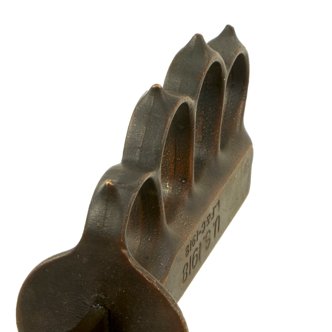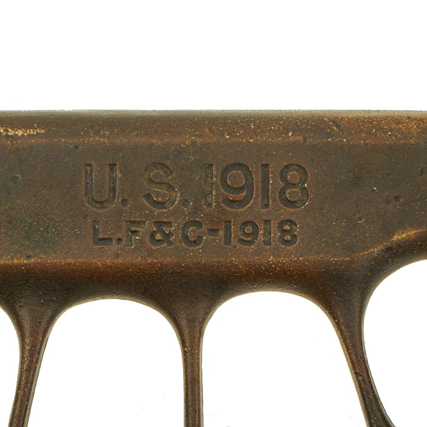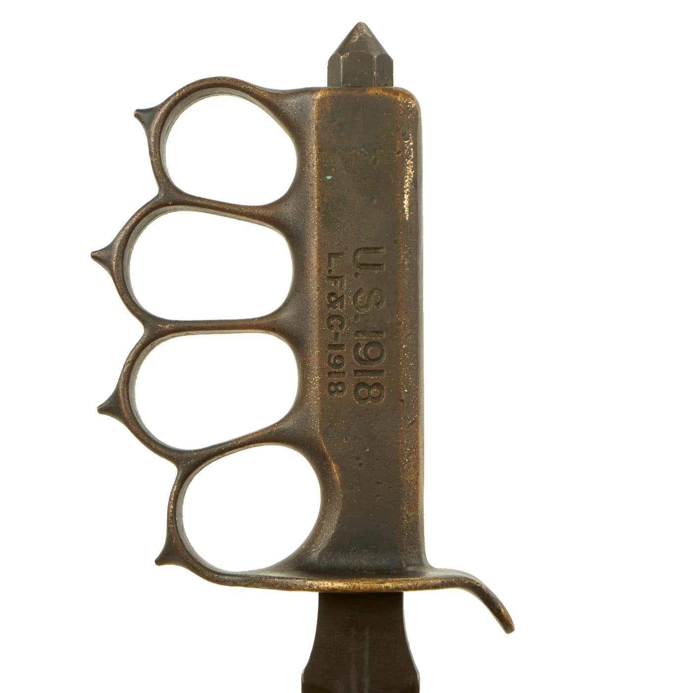 Original Item: Only One Available. The U.S. Model 1918 Mark I Trench Knife was the second major "Knuckle Knife" to be officially adopted and issued to the US military. It was developed for use in the horrific trench warfare that typified the stalemate on the Western Front during the latter part of World War One and saw use not only there, but during World War Two as well. The knife was manufactured in the United States by Henry Disston & Sons (H.D. & S.) as well as Landers, Frary & Clark (L.F. & C.) and Oneida Community Ltd (O.C.L.). The knives were also produced in France and are marked with the usual 1918 and US marks, as well as Au Lion on the blade. Whether this mark was a maker's mark or simply a motto is not known. The U.S. M-1918 Mark I Trench Knife is easily identifiable due to its large "brass knuckle" style guard and grip. The knives were 11 ¾" in overall length, with a 6 ¾" dagger style blade. The brass grips were marked U.S. 1918 and with the makers name or initials.