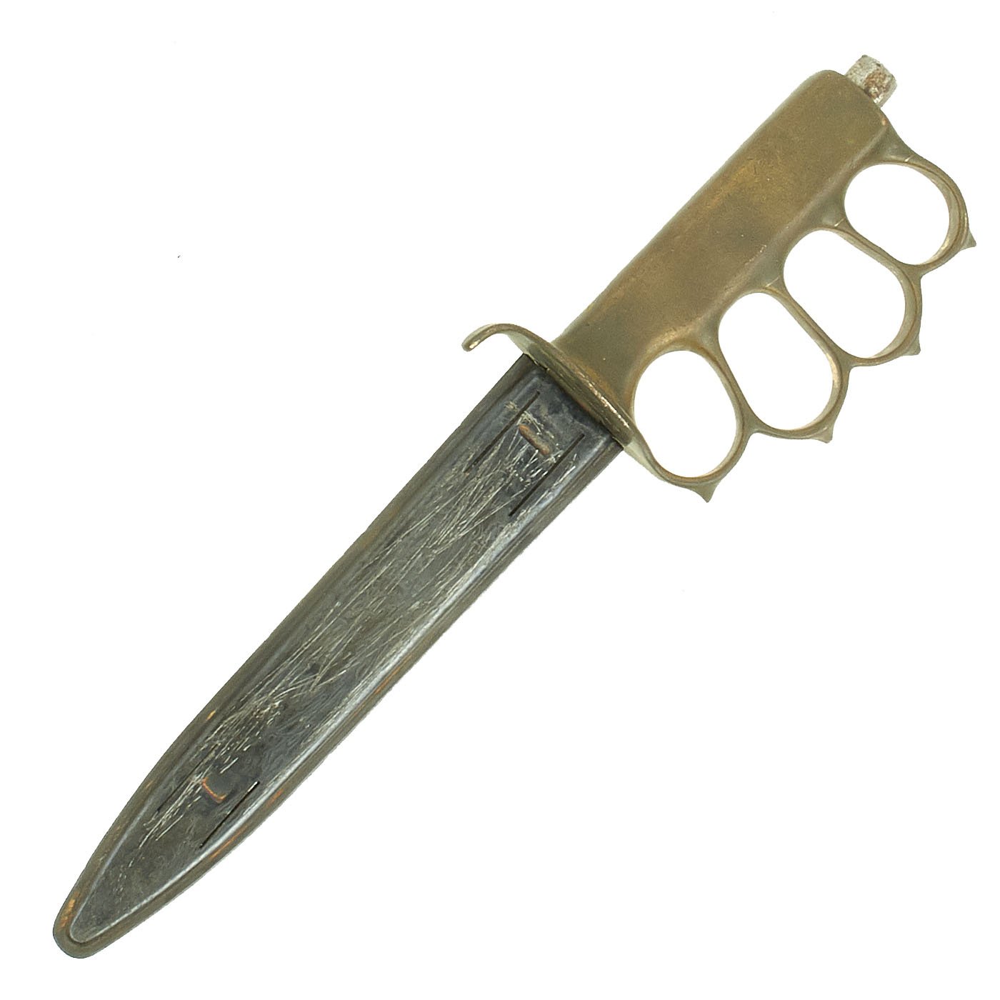 As originally issued, the knives were entirely blackened; both the blades and the brass knuckle hilts. These knives remained in use with the US military, classified as limited standard (secondary issue) through January of 1945, when the knives were officially classified as obsolete. As originally issued, the knives were carried in a blued sheet steel scabbard that was typically maker marked, and was equipped with a pair of wire tabs that were intended to engage the US pistol web belt in use at that time. Many of the knives issued during World War II ended up in substitute leather scabbards of various designs and styles, many of which were "theater made".