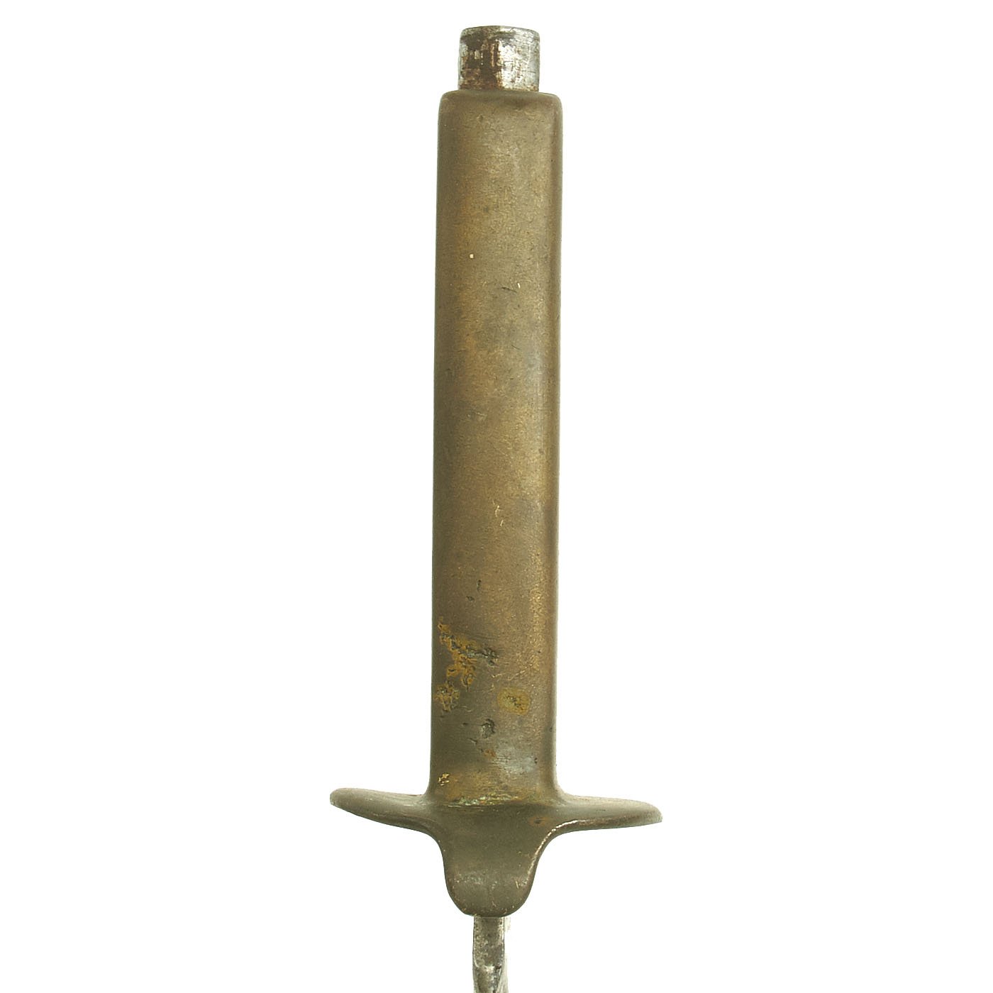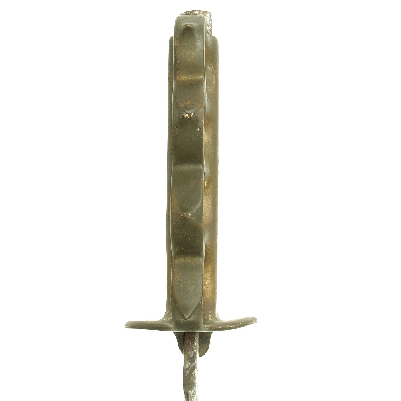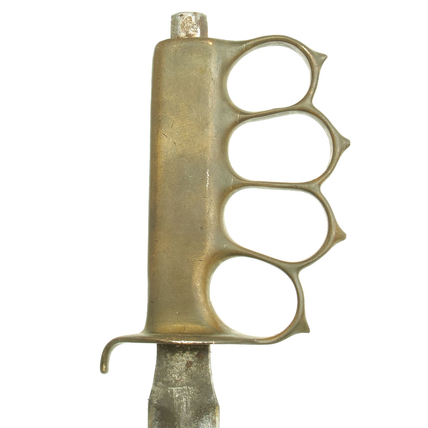 The brass grip and knuckle guard blackening is mostly worn away, as this example seems to have seen extensive service. There is definitely some wear on the brass from cleaning an exposure to the elements, as shown, however it has a lovely greenish patina. The "skull crusher" end nut has had the point filed off. The steel dagger blade is missing all of the original finish, due to cleaning and use. It is still mostly sharp, and some of the original grind marks can be seen on the body, however it does look to have had the blade profile rounded a bit.
