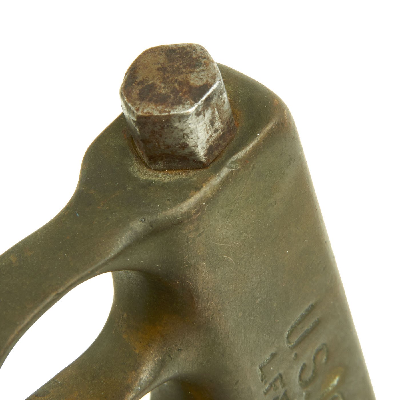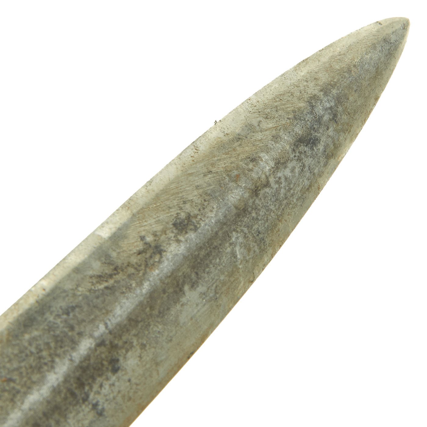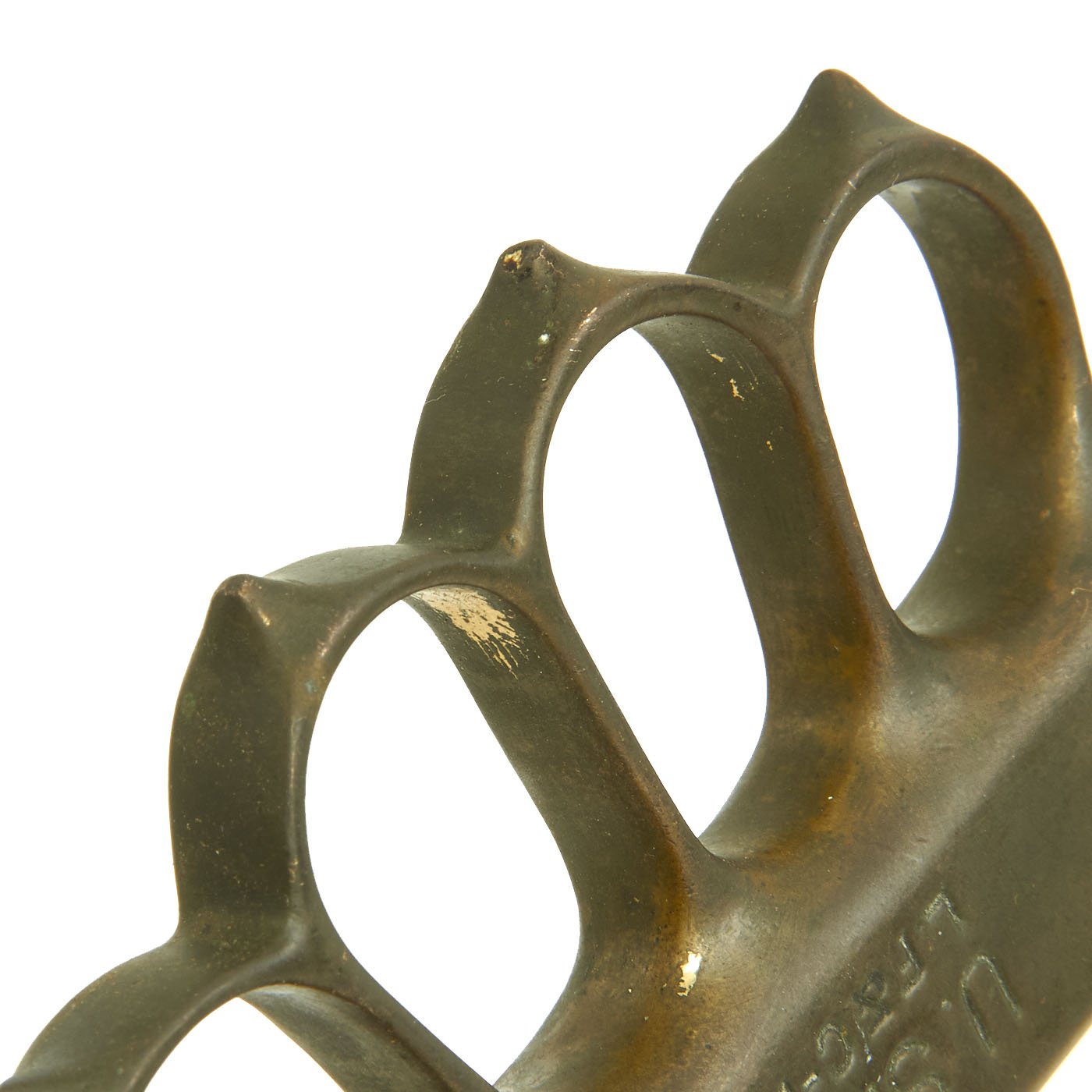The brass grip and knuckle guard blackening is mostly worn away, as this example seems to have seen extensive service. There is definitely some wear on the brass from cleaning an exposure to the elements, as shown, however it has a lovely greenish patina. The "skull crusher" end nut has had the point filed off. The steel dagger blade is missing all of the original finish, due to cleaning and use. It is still mostly sharp, and some of the original grind marks can be seen on the body, however it does look to have had the blade profile rounded a bit.