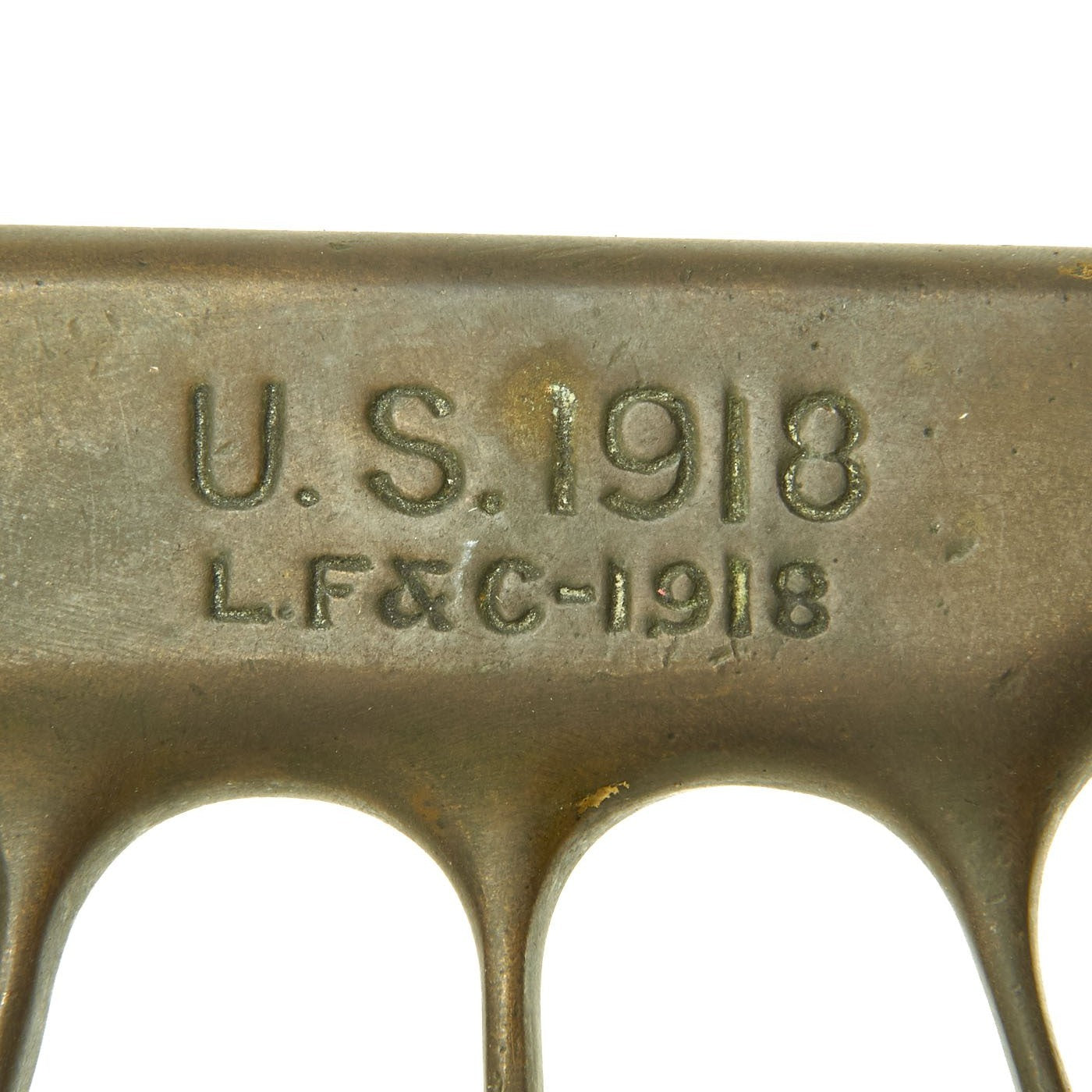 Original Item: Only One Available. The U.S. Model 1918 Mark I Trench Knife was the second major "Knuckle Knife" to be officially adopted and issued to the US military. It was developed for use in the horrific trench warfare that typified the stalemate on the Western Front during the latter part of World War One and saw use not only there, but during World War Two as well. The knife was manufactured in the United States by Henry Disston & Sons (H.D. & S.) as well as Landers, Frary & Clark (L.F. & C.) and Oneida Community Ltd (O.C.L.). The knives were also produced in France and are marked with the usual 1918 and US marks, as well as Au Lion on the blade. Whether this mark was a maker's mark or simply a motto is not known. The U.S. M-1918 Mark I Trench Knife is easily identifiable due to its large "brass knuckle" style guard and grip. The knives were 11 ¾" in overall length, with a 6 ¾" dagger style blade. The brass grips were marked U.S. 1918 and with the makers name or initials.