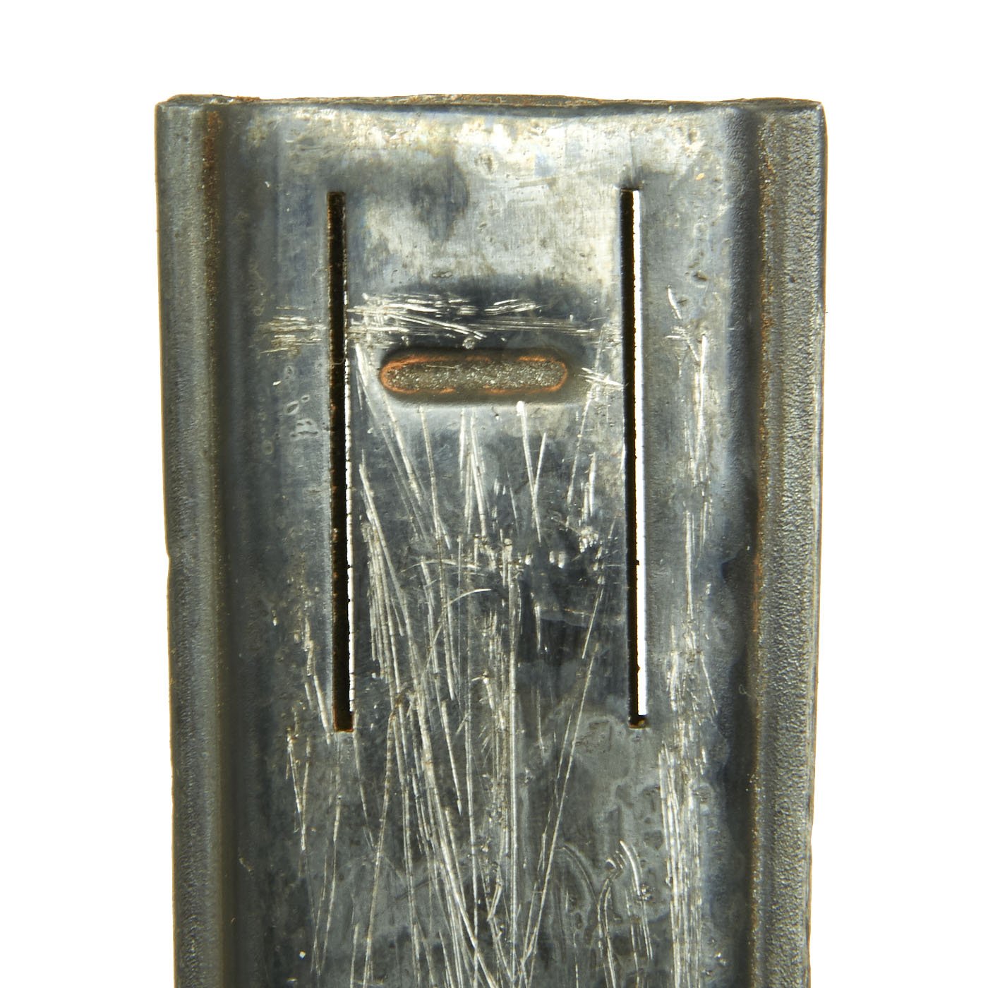 The steel scabbard is in good condition with only some small dents, with the expected finish wear on a 100 year old scabbard, and still has both belt clips. It still has a good amount of the original blued finish. The scabbard is clearly marked on the rear, near the throat: