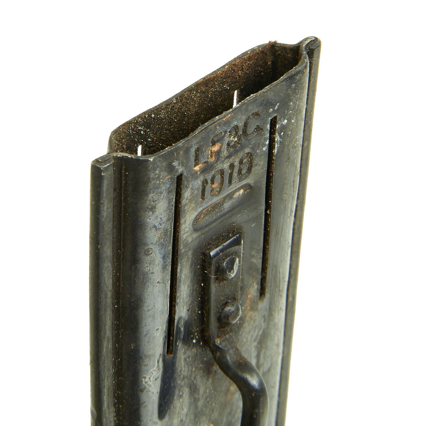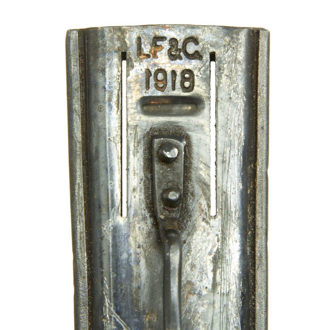 This example of the U.S. Model 1918 MkI Trench Knife is offered in very good condition. The knife was produced by the Landers, Frary & Clark company of New Britain, CT. L.F. & C. was established in 1865 and produced a wide variety of housewares, cutlery and event appliances. Many of their products were marketed under the trade name "Universal". The products of L.F. & C. included everything from scales, mousetraps and ice skates to electric ranges and toasters. L.F. & C. also produced the triangular blade US M-1917 Trench Knife as well. The assets of the L.F. & C. company were purchased by General Electric in 1965. This Mark I Trench Knife is clearly marked in two lines in the brass grip:
