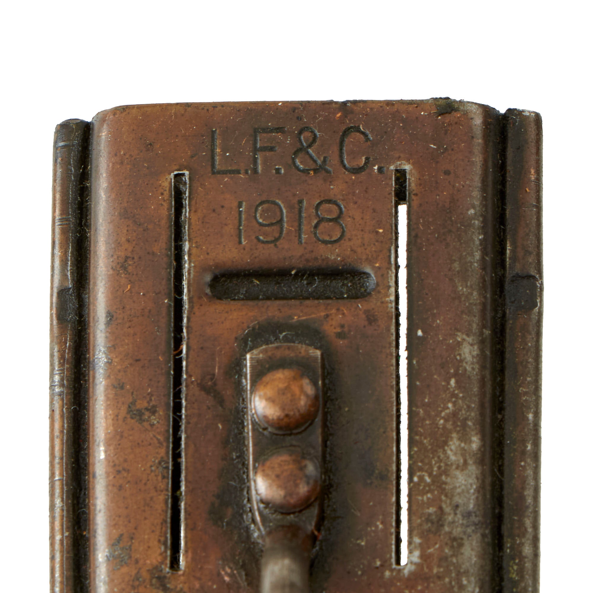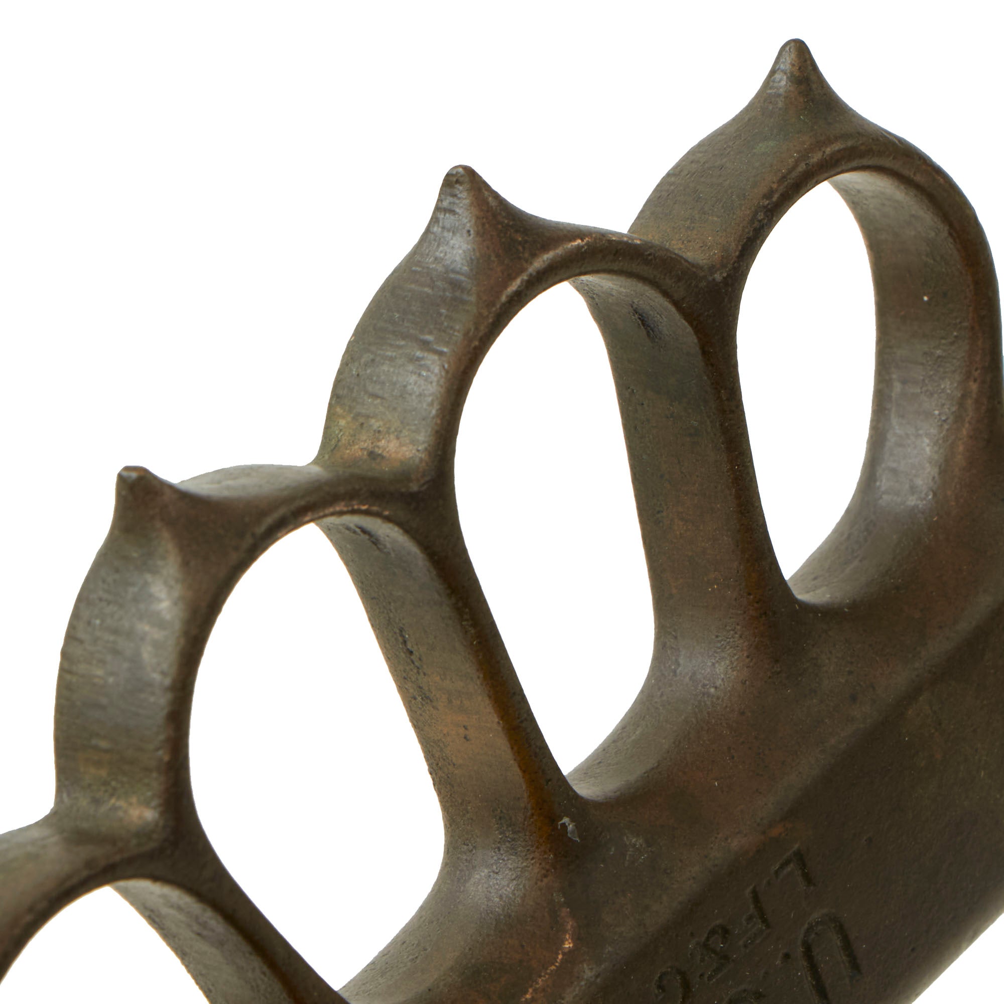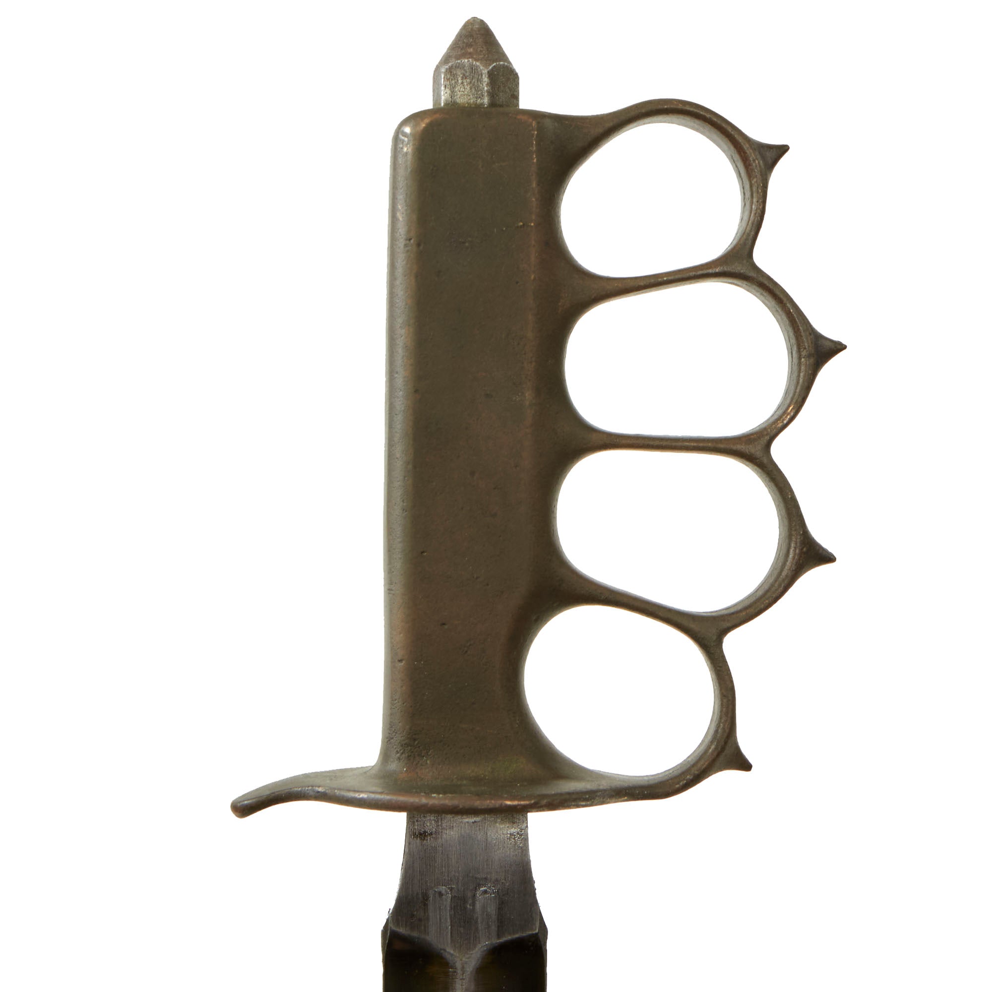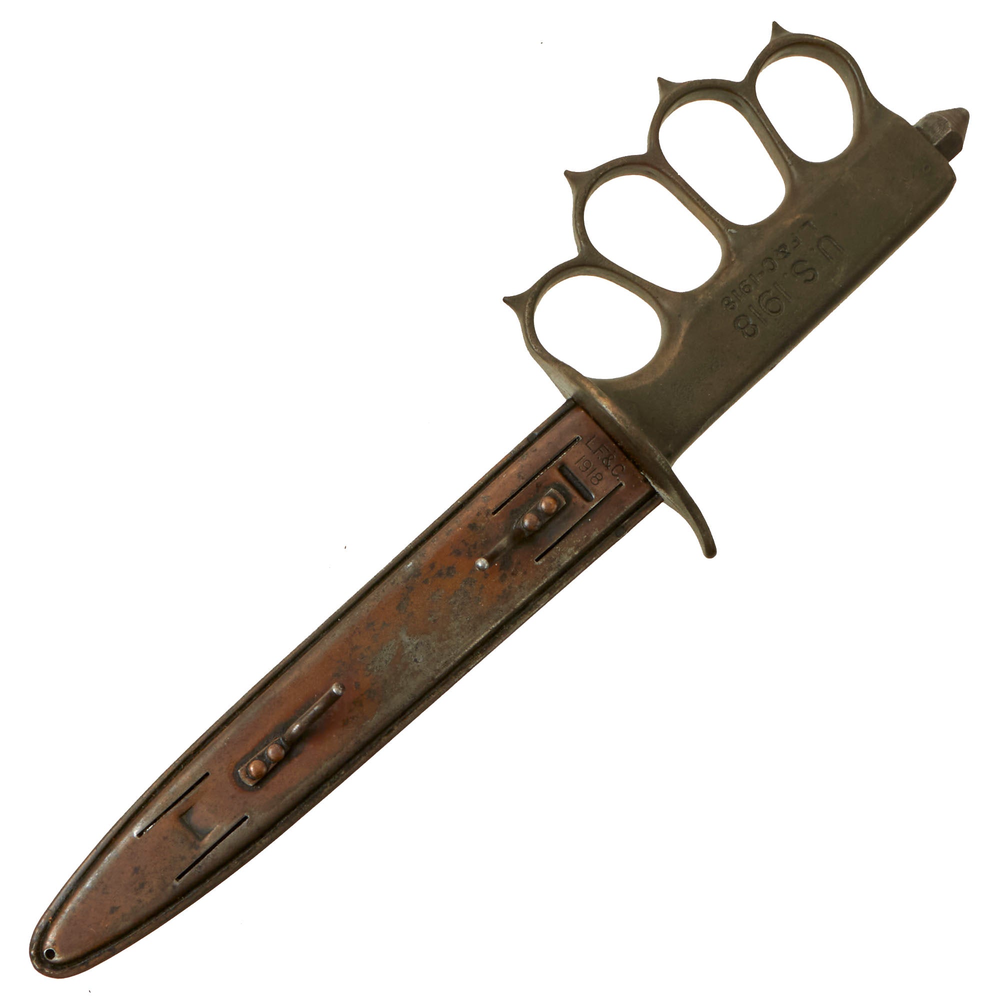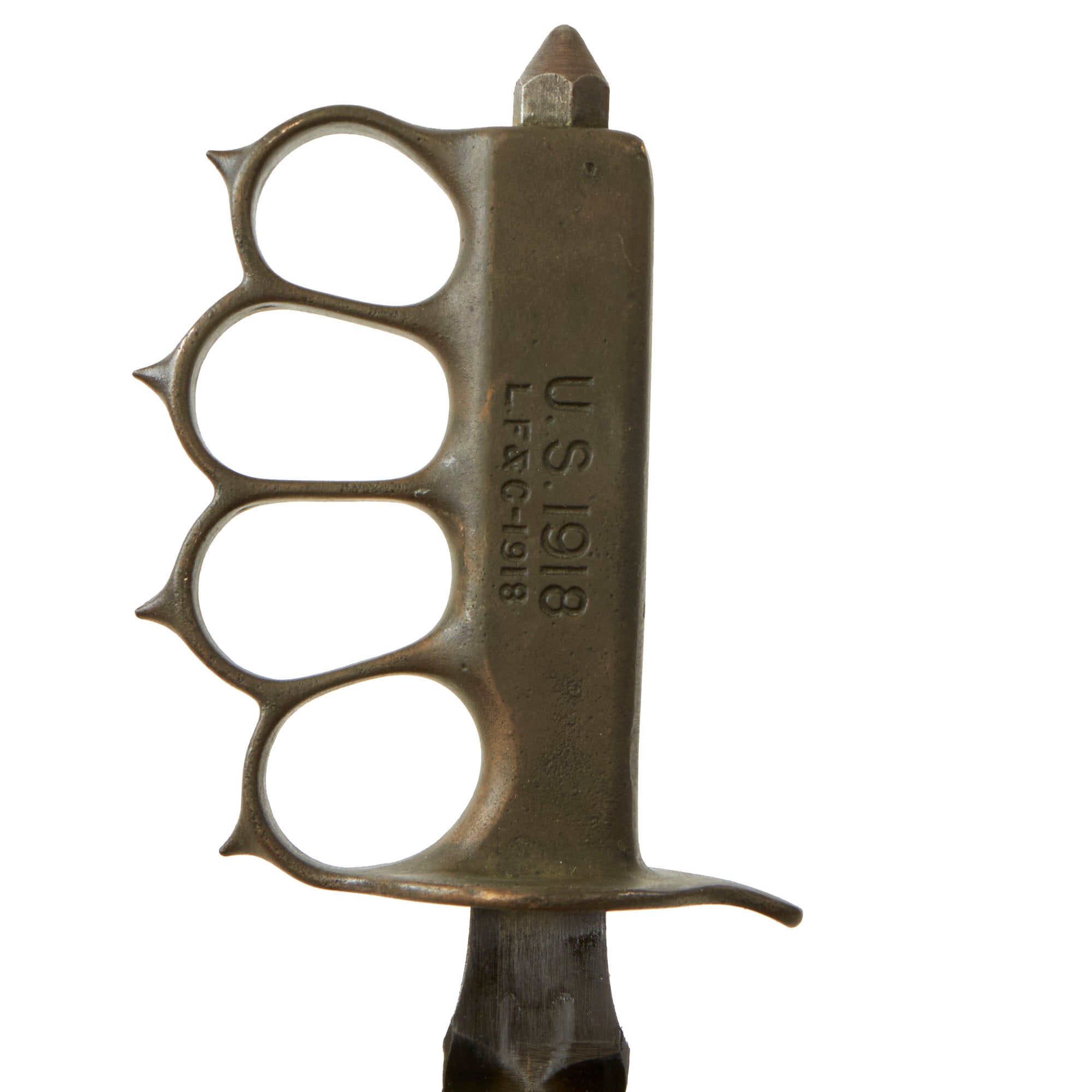 Original Item: Only One Available. The U.S. Model 1918 Mark I Trench Knife was the second major "Knuckle Knife" to be officially adopted and issued to the US military. It was developed for use in the horrific trench warfare that typified the stalemate on the Western Front during the latter part of World War One and saw use not only there, but during World War Two as well. The knife was manufactured in the United States by Henry Disston & Sons (H.D. & S.) as well as Landers, Frary & Clark (L.F. & C.) and Oneida Community Ltd (O.C.L.). The knives were also produced in France and are marked with the usual 1918 and US marks, as well as Au Lion on the blade. Whether this mark was a maker's mark or simply a motto is not known.