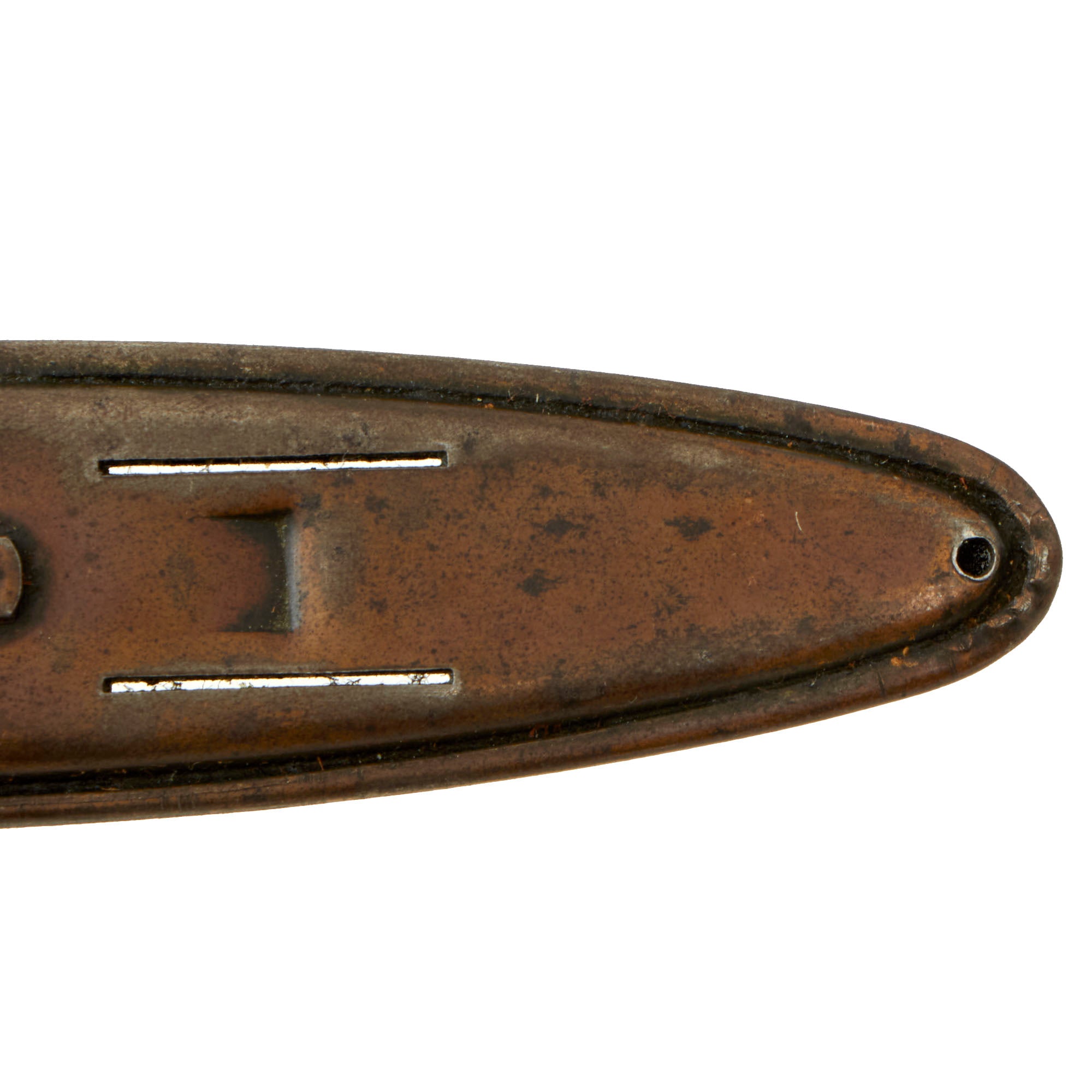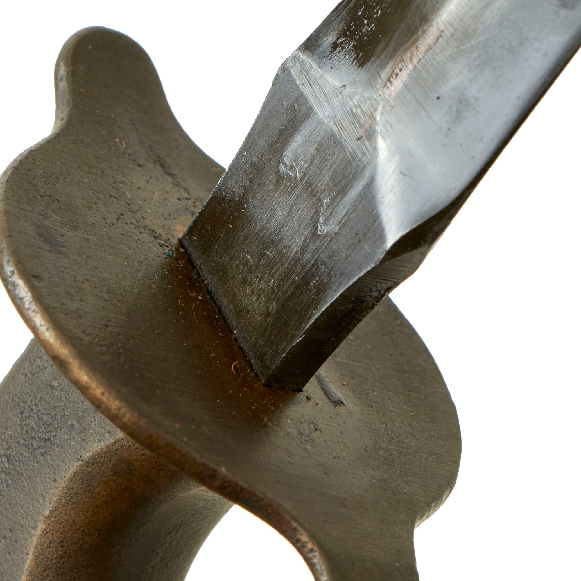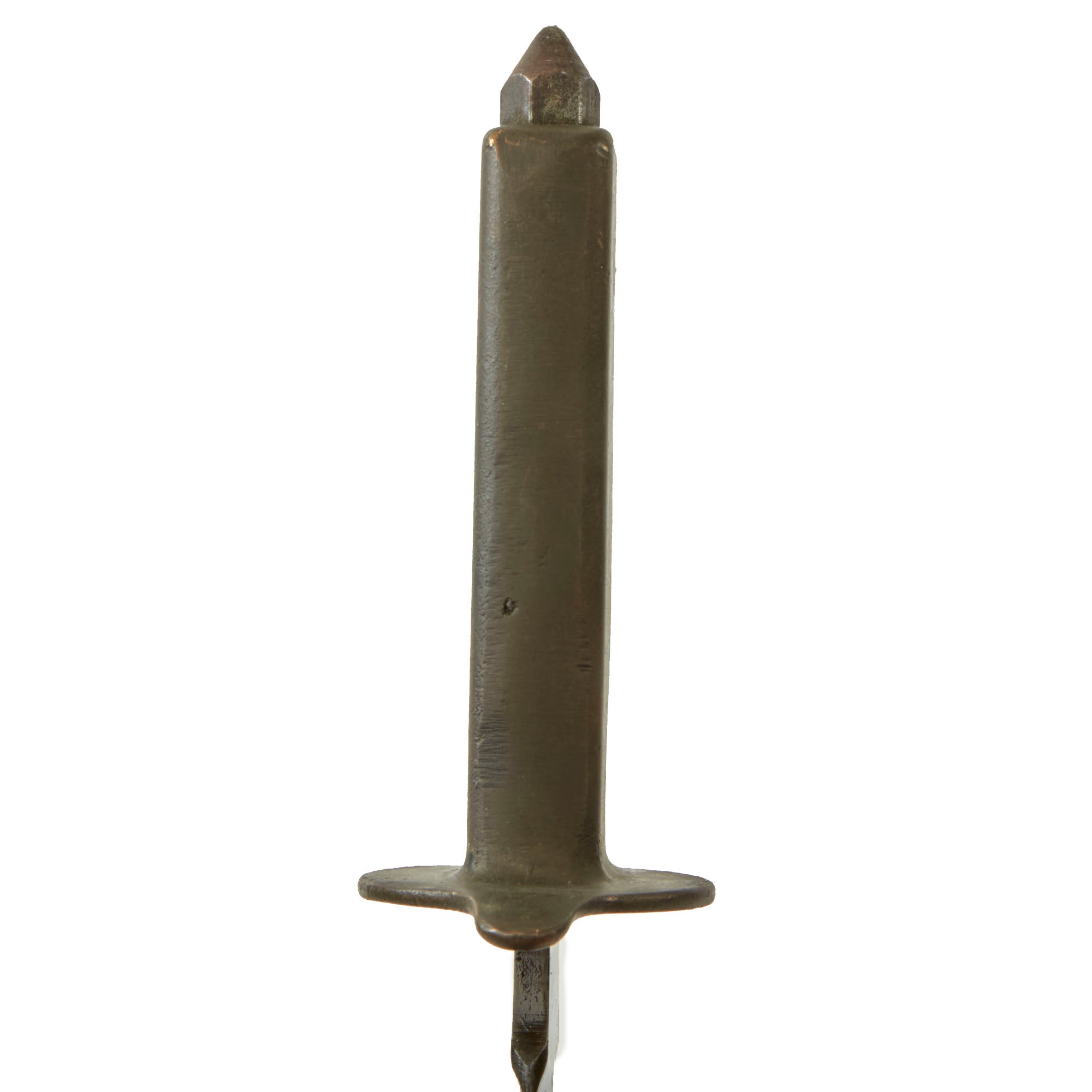 The brass grip and knuckle guard blackening is retained much. Where the blackening is worn is a lovely aged brass dark patina. The steel dagger blade still has much of the original factory grind visible though the blade was most certainly cleaned and reblued. The tip of the knife appears to have been “hard sharpened” slightly causing it to have the appearance of a change in profile, though we believe it was never intentionally altered.