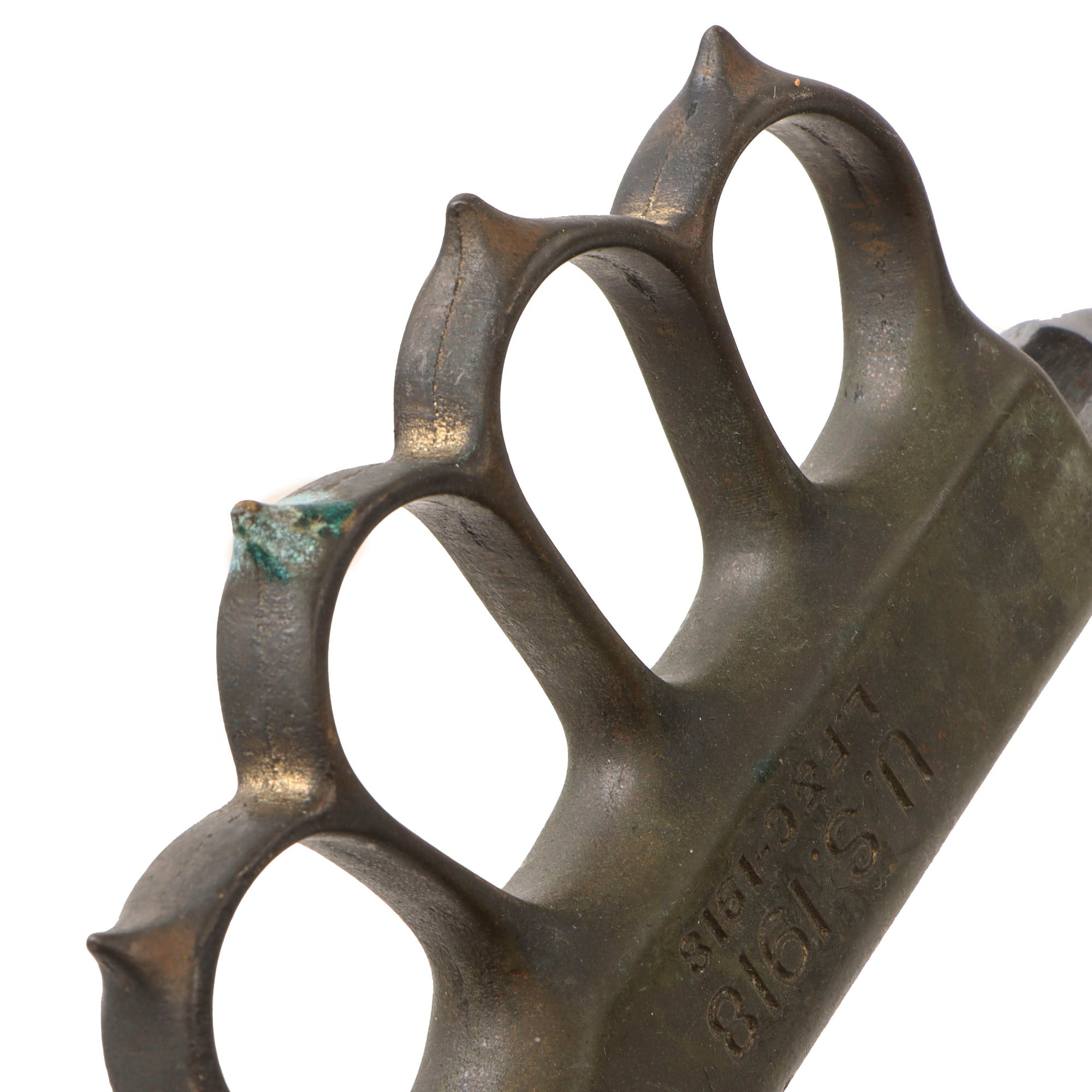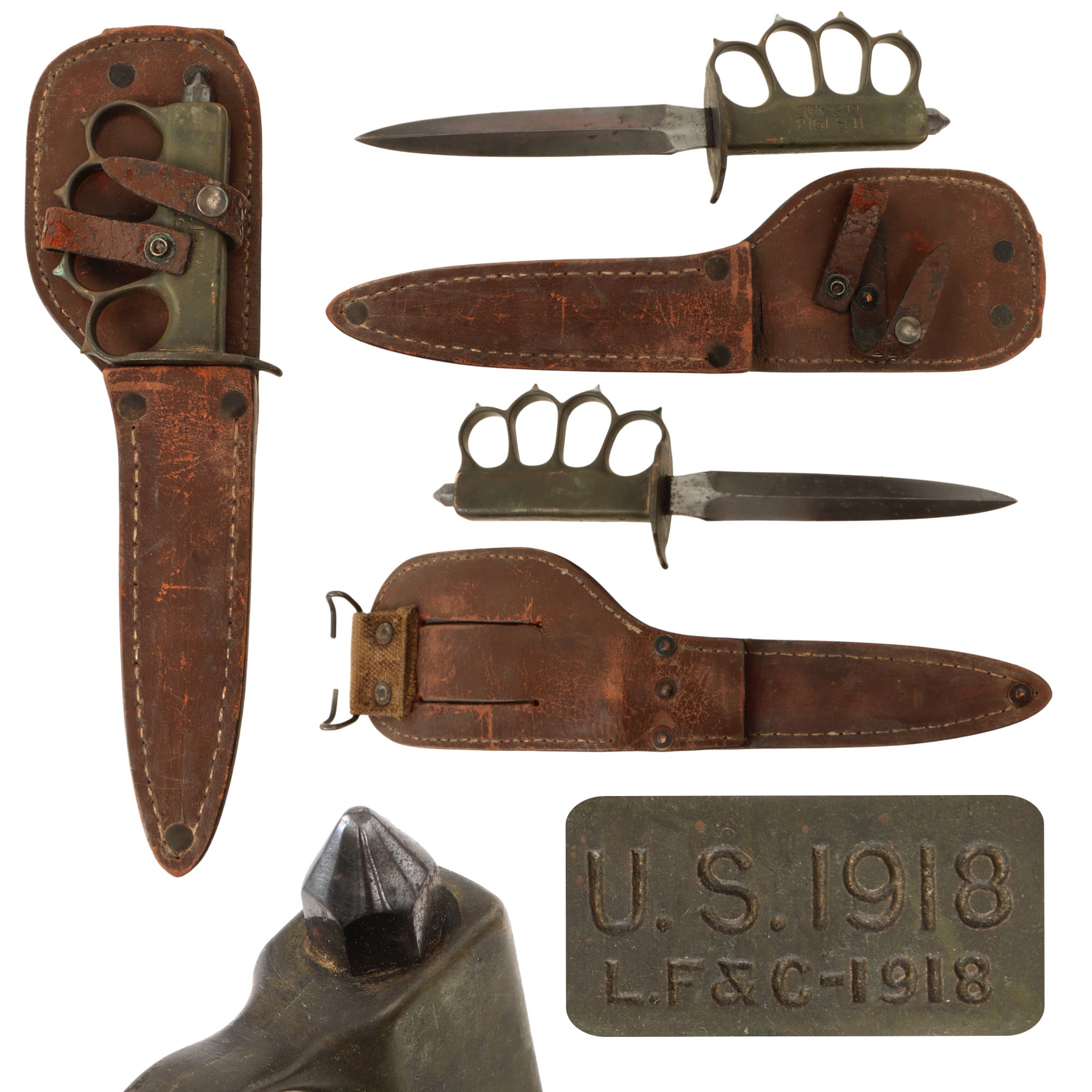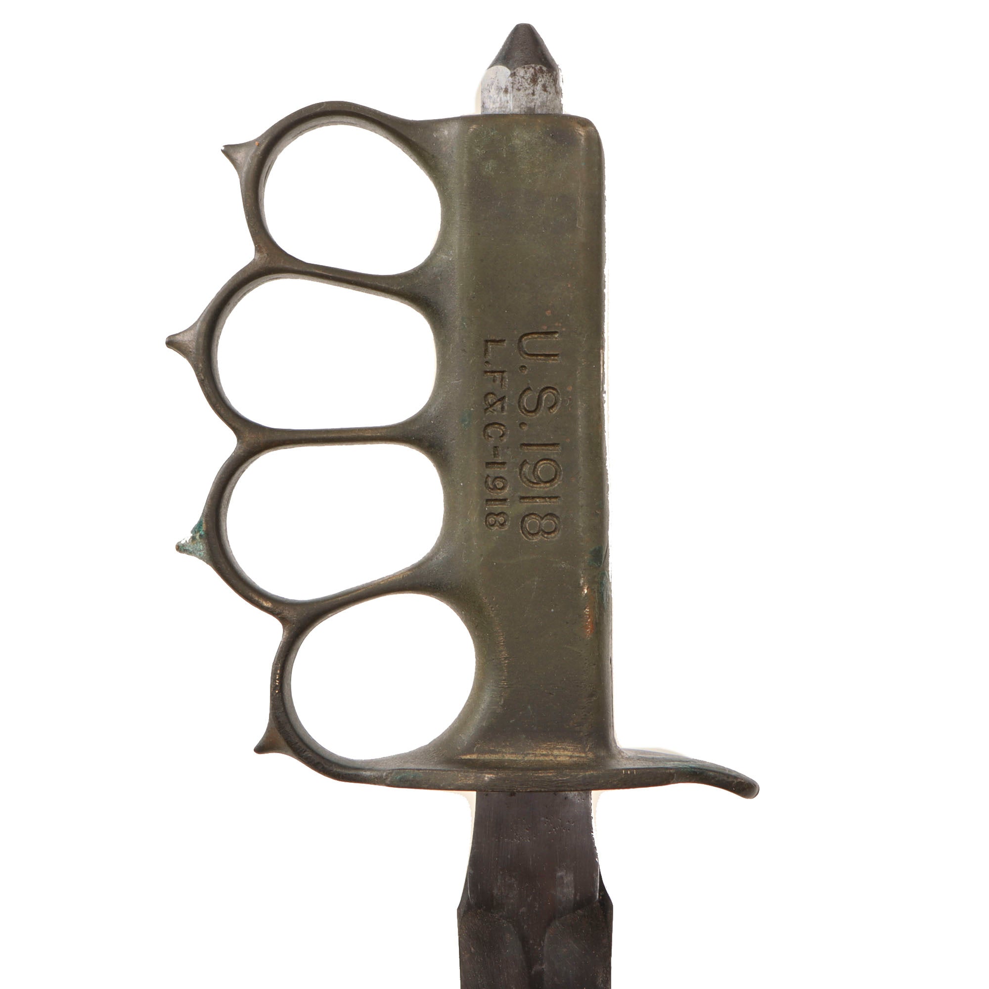 Original Item: Only One Available. The U.S. Model 1918 Mark I Trench Knife was the second major "Knuckle Knife" to be officially adopted and issued to the US military. It was developed for use in the horrific trench warfare that typified the stalemate on the Western Front during the latter part of World War One and saw use not only there, but during World War Two as well. The knife was manufactured in the United States by Henry Disston & Sons (H.D. & S.) as well as Landers, Frary & Clark (L.F. & C.) and Oneida Community Ltd (O.C.L.). The knives were also produced in France and are marked with the usual 1918 and US marks, as well as Au Lion on the blade. Whether this mark was a maker's mark or simply a motto is not known.