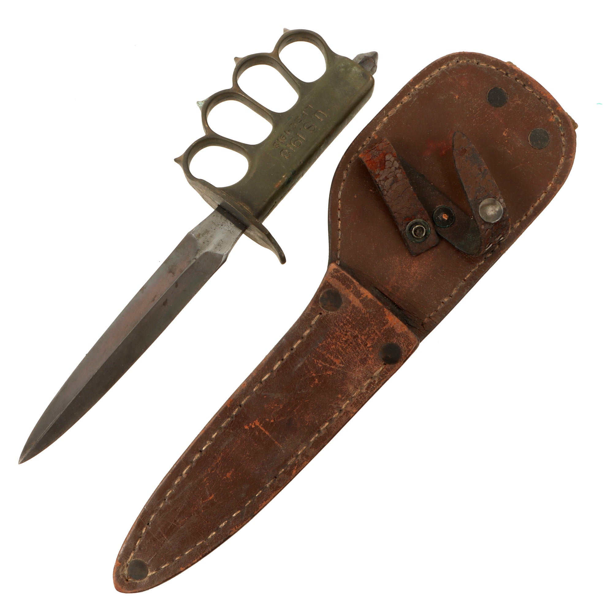 As originally issued, the knives were entirely blackened; both the blades and the brass knuckle hilts. These knives remained in use with the US military, classified as limited standard (secondary issue) through January of 1945, when the knives were officially classified as obsolete. As originally issued, the knives were carried in a blued sheet steel scabbard that was typically maker marked, and was equipped with a pair of wire tabs that were intended to engage the US pistol web belt in use at that time. Many of the knives issued during World War II ended up in substitute leather scabbards of various designs and styles, many of which were "theater made".
