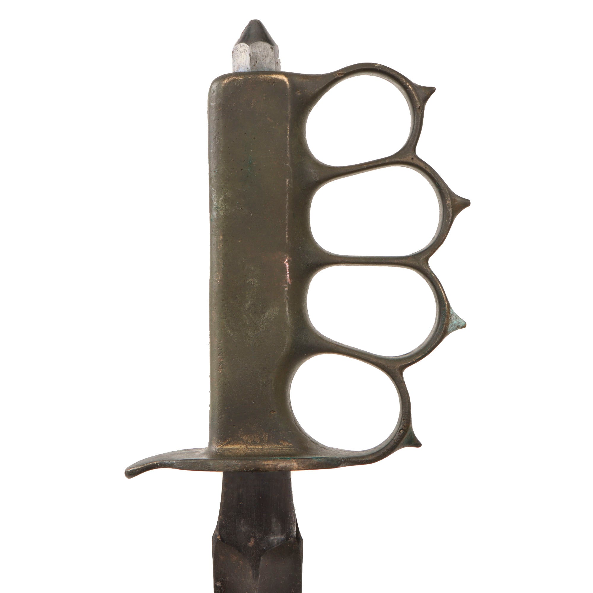 Overall this is a fair well-used example of the very popular and collectible World War I era US trench knife that saw use in WWI & WWII. These brass D guard knuckle knives always make a great centerpiece to any military knife display and certainly draw attention due to their size and fierce appearance.