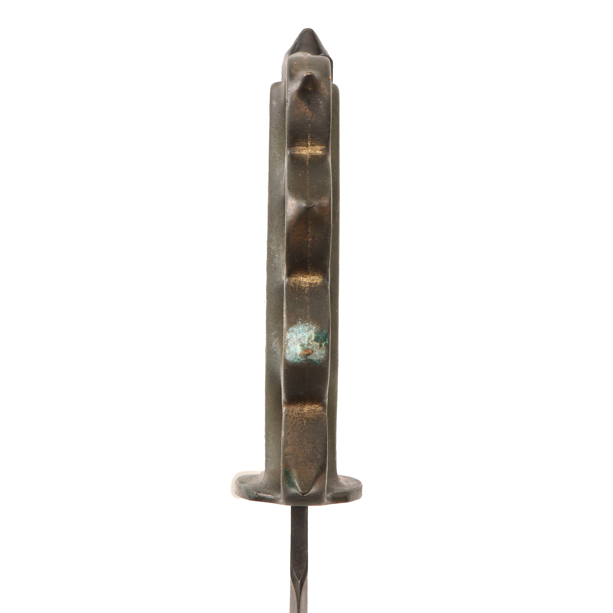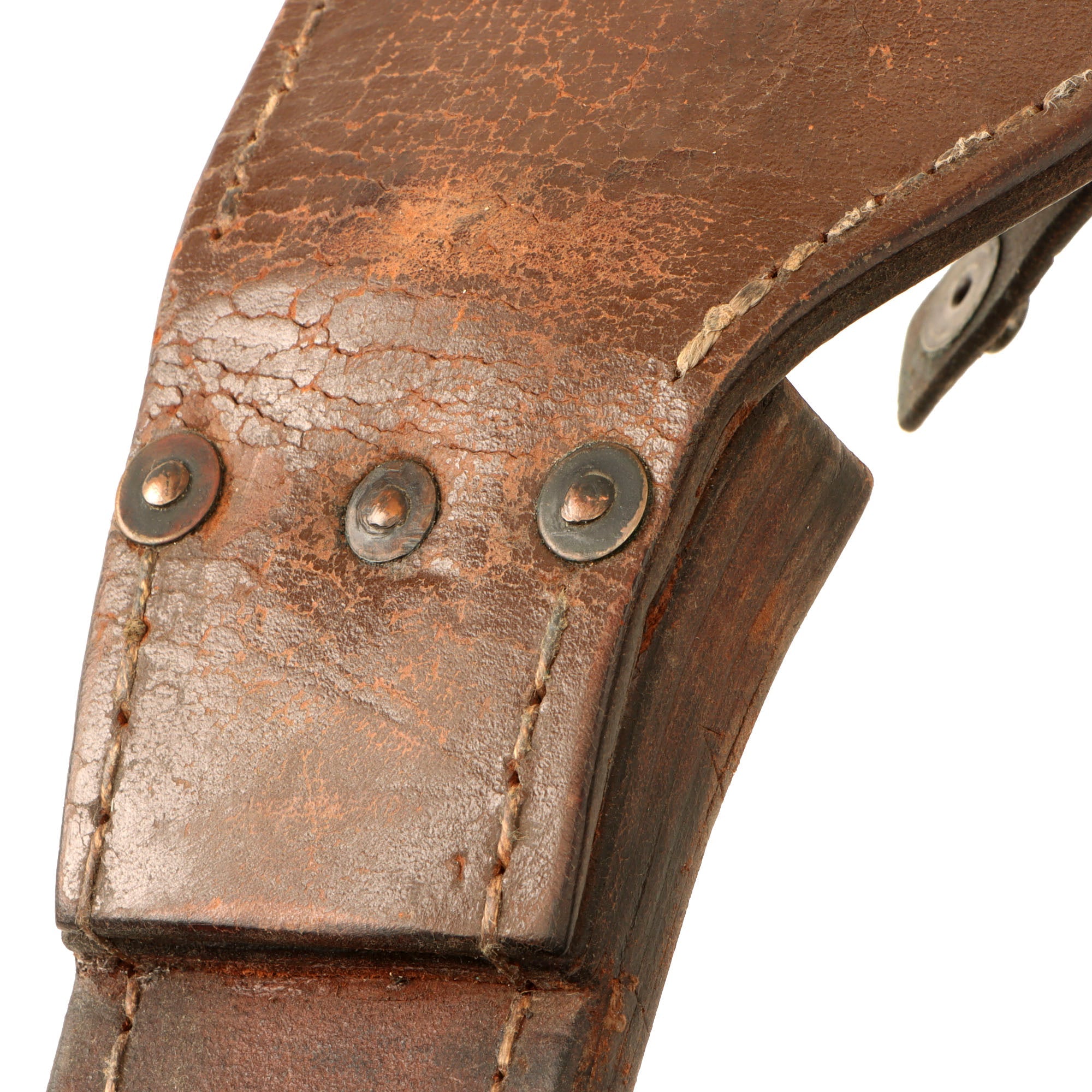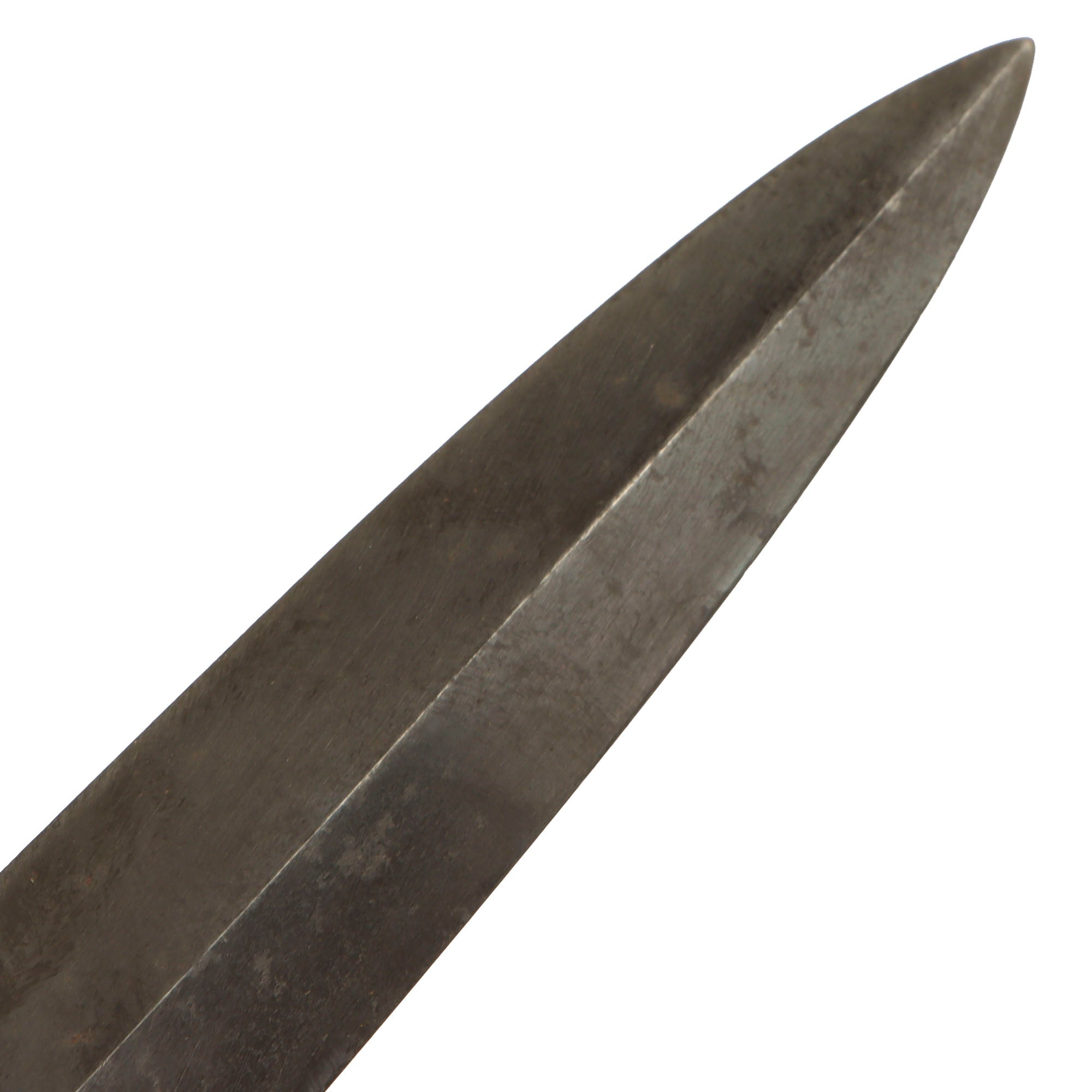 The brass grip and knuckle guard blackening is mostly gone and the handle has heavy scuffing and denting along the spine with some casting flaws. As mentioned, the rounded crossguard has been shaven down on both sides, now resembling an oval, so that it would fit into the custom leather sheath. The sheath has a large hilt pad with a leather securing strap now heavily cracked and crazed that fits perfectly around the handle through the middle finger hole. The snap is present but no longer works.