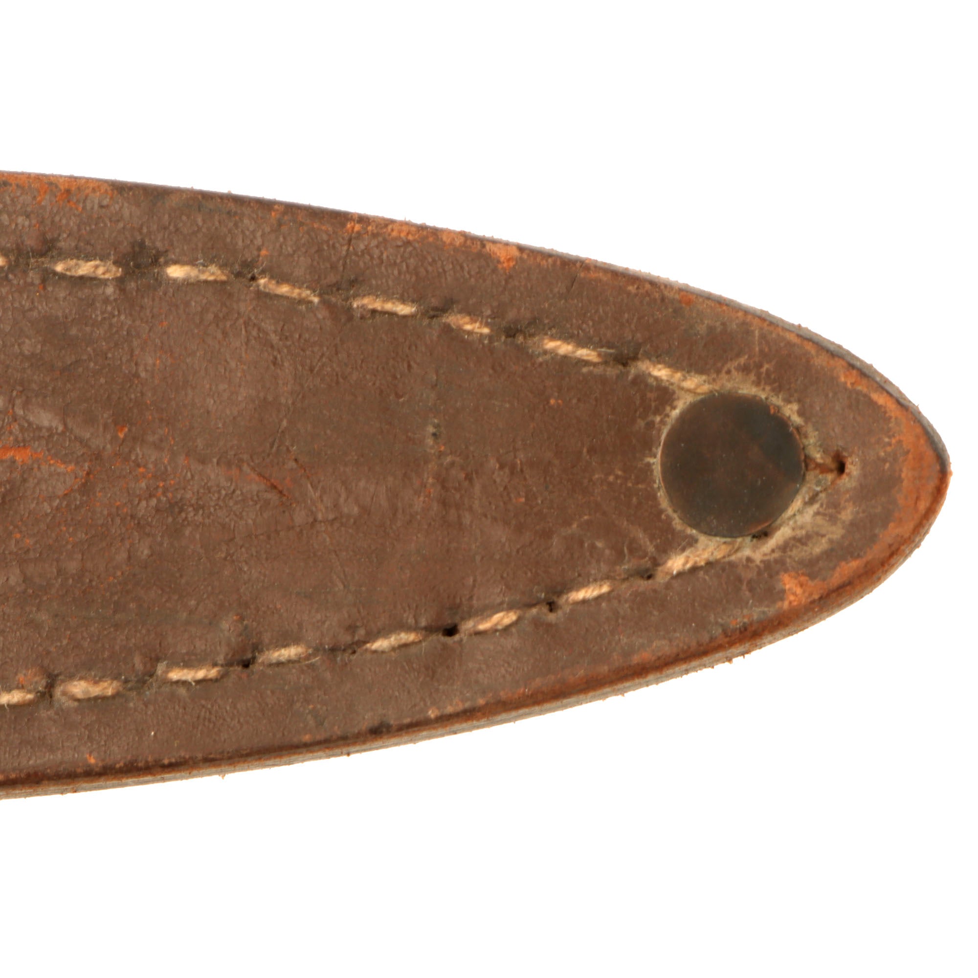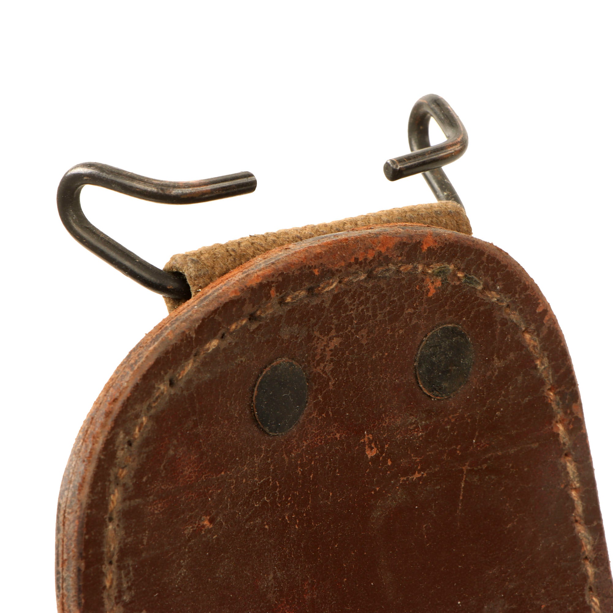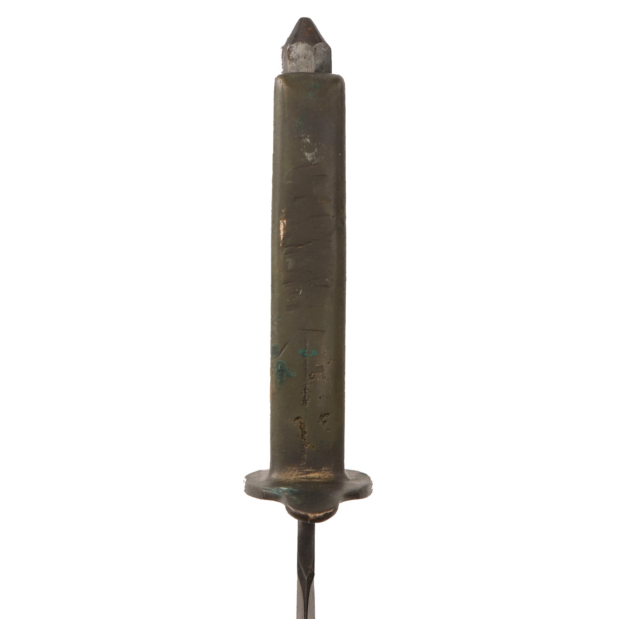 The U.S. M-1918 Mark I Trench Knife is easily identifiable due to its large "brass knuckle" style guard and grip. This knife is 11 ¾" in overall length, with a 6 ¾" dagger style blade. The overall length with scabbard is 12”. The brass grips are beautifully darkened and are marked U.S. 1918 L.F & C - 1918. This example’s crossguard was cut down on the sides, and the knife is fitted in a custom leather sheath with a securing strap. The construction is similar to other WWII examples we’ve seen.