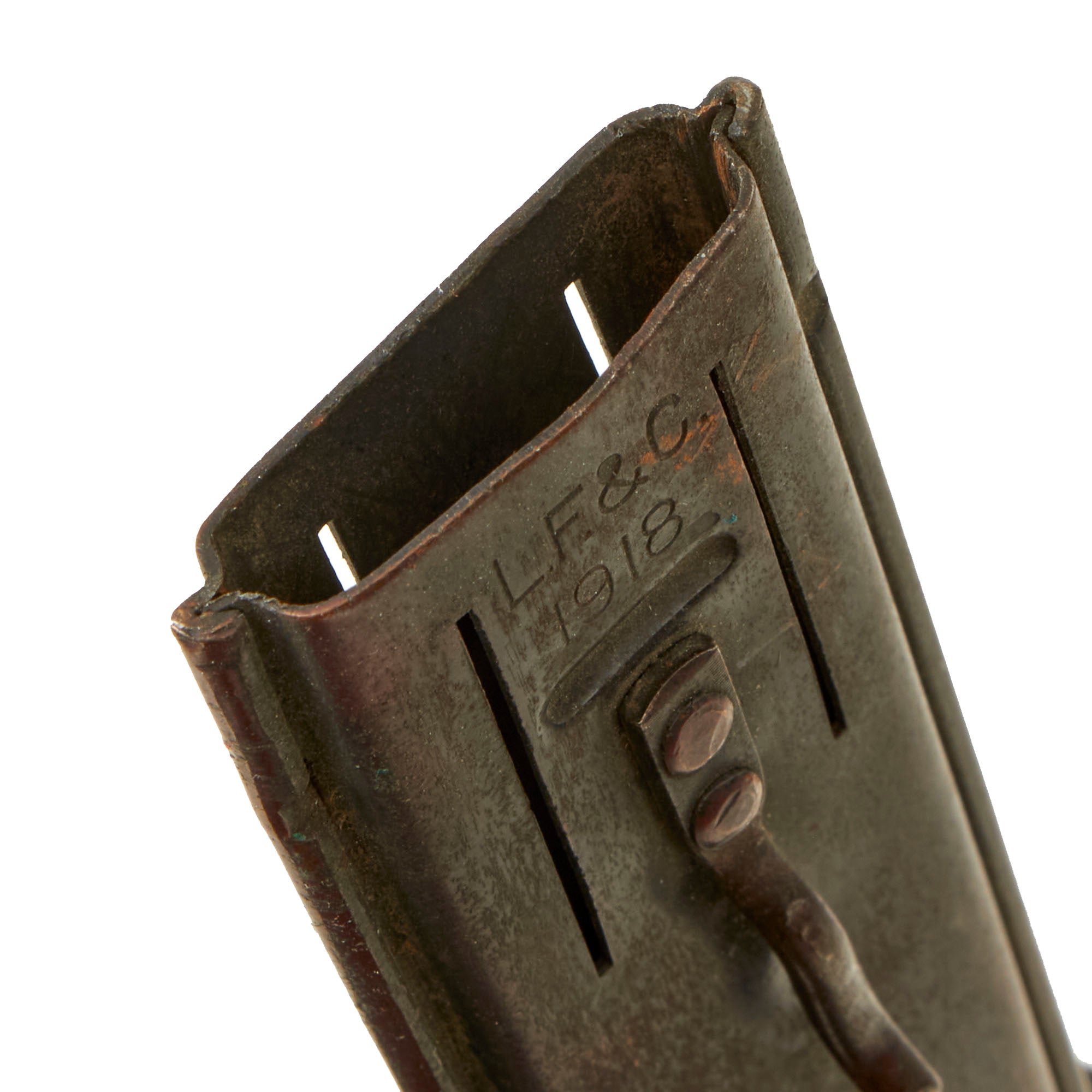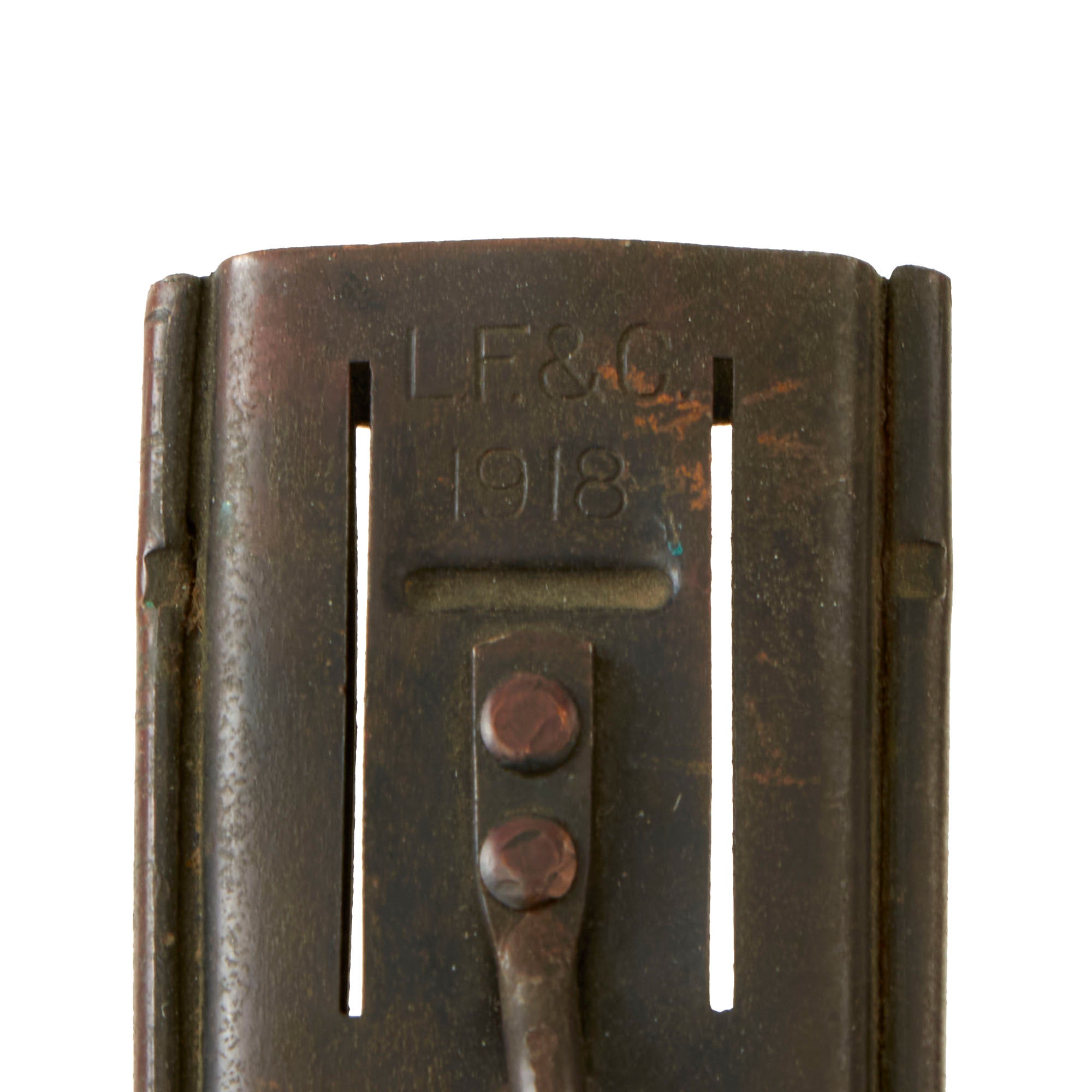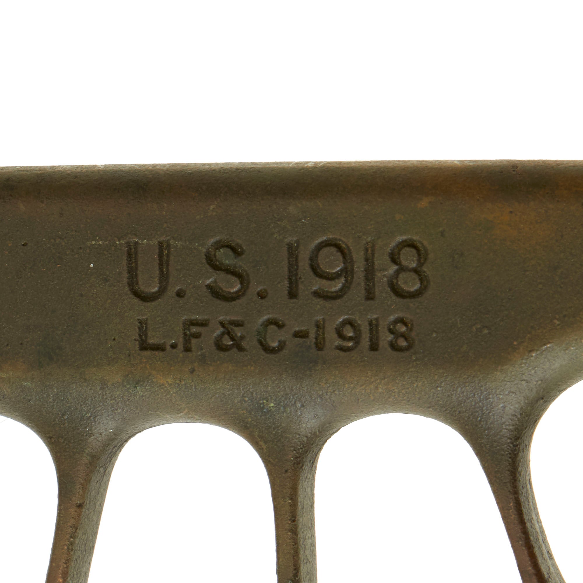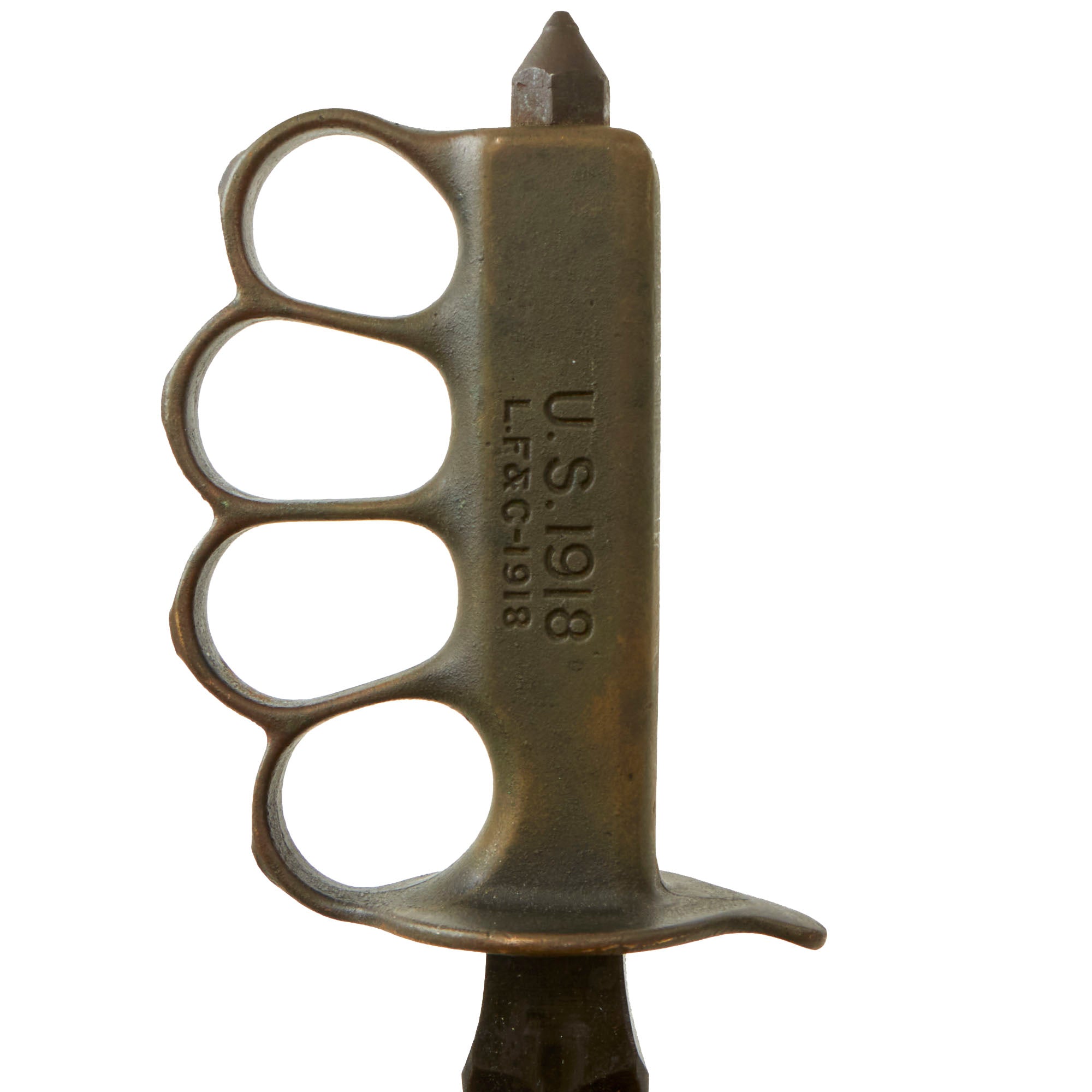 Original Item: Only One Available. The U.S. Model 1918 Mark I Trench Knife was the second major "Knuckle Knife" to be officially adopted and issued to the US military. It was developed for use in the horrific trench warfare that typified the stalemate on the Western Front during the latter part of World War One and saw use not only there, but during World War Two as well. The knife was manufactured in the United States by Henry Disston & Sons (H.D. & S.) as well as Landers, Frary & Clark (L.F. & C.) and Oneida Community Ltd (O.C.L.). The knives were also produced in France and are marked with the usual 1918 and US marks, as well as Au Lion on the blade. Whether this mark was a maker's mark or simply a motto is not known.The U.S. M-1918 Mark I Trench Knife is easily identifiable due to its large "brass knuckle" style guard and grip. This knife is 11 ¾" in overall length, with a 6 ¾" dagger style blade. The overall length with scabbard is 12”. The brass grips are beautifully darkened and are marked U.S. 1918 L.F & C - 1918. The scabbard is marked LF&C 1918. One of the two hanging prongs has broken off, but the other is intact as shown.As originally issued, the knives were entirely blackened; both the blades and the brass knuckle hilts. These knives remained in use with the US military, classified as limited standard (secondary issue) through January of 1945, when the knives were officially classified as obsolete. As originally issued, the knives were carried in a blued sheet steel scabbard that was typically maker marked, and was equipped with a pair of wire tabs that were intended to engage the US pistol web belt in use at that time. Many of the knives issued during World War II ended up in substitute leather scabbards of various designs and styles, many of which were "theater made".The knife was produced by the Landers, Frary & Clark company of New Britain, CT. L.F. & C. was established in 1865 and produced a wide variety of housewares, cutlery and event appliances. Many of their products were marketed under the trade name "Universal". The products of L.F. & C. included everything from scales, mousetraps and ice skates to electric ranges and toasters. L.F. & C. also produced the triangular blade US M-1917 Trench Knife as well. The assets of the L.F. & C. company were purchased by General Electric in 1965.The brass grip and knuckle guard blackening is retained much. The blade also has a considerable amount of oxidation across the edge. The steel dagger blade still has much of the original factory grind visible though the blade was most certainly cleaned and reblued. Overall this is a very nice example of the very popular and collectible World War I era US trench knife. These brass D guard knuckle knives always make a great centerpiece to any military knife display and certainly draw attention due to their size and fierce appearance. The only flaw would be the absence of one prong.Specifications:Blade Length: 6 3/4"Blade Style: Double Edged DaggerOverall length: 12”Guard: 4 1/2" long x 3 3/4" wideScabbard Length: 7 ⅛