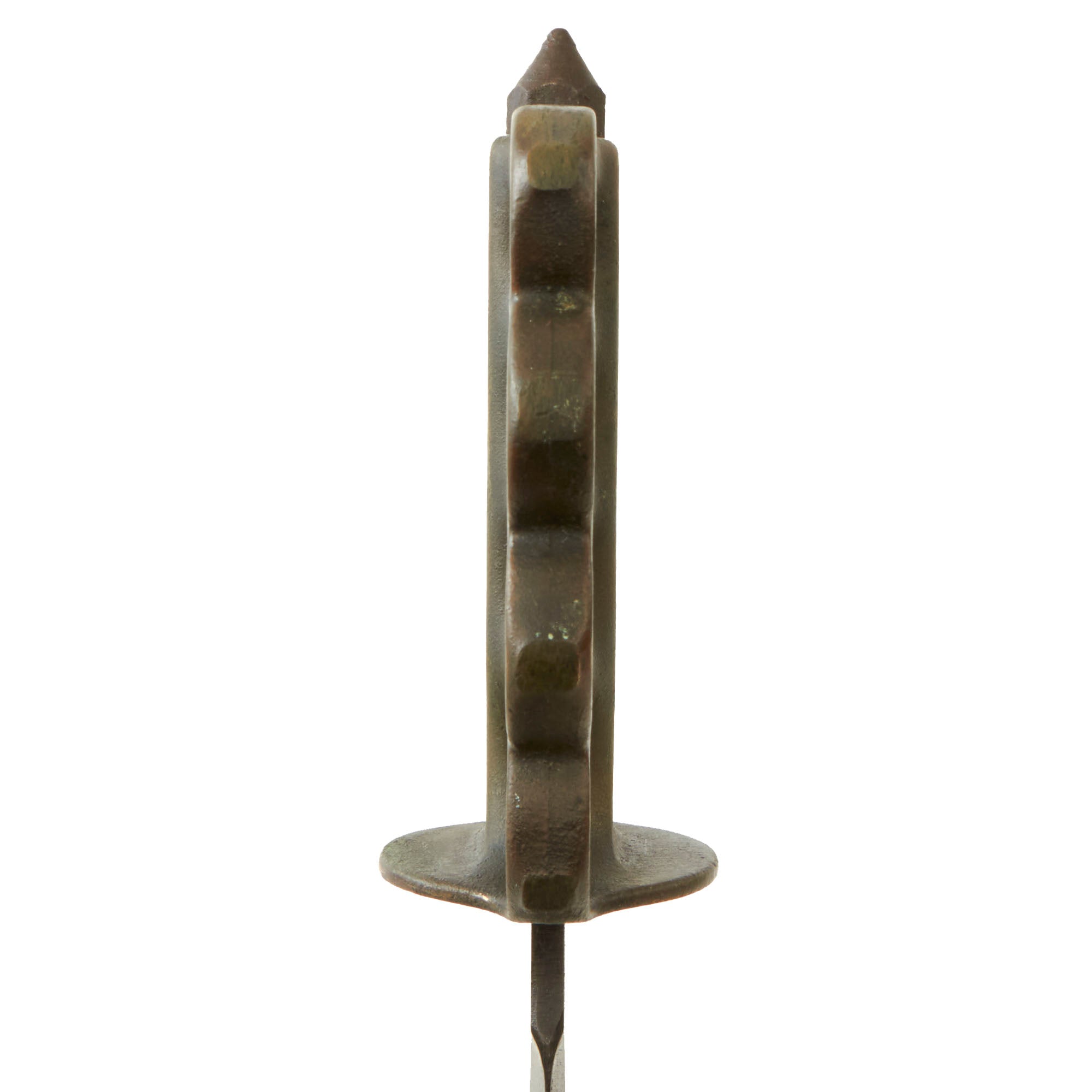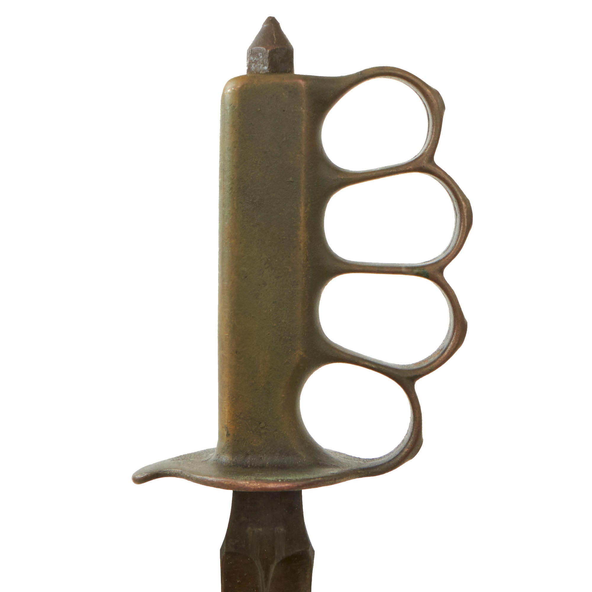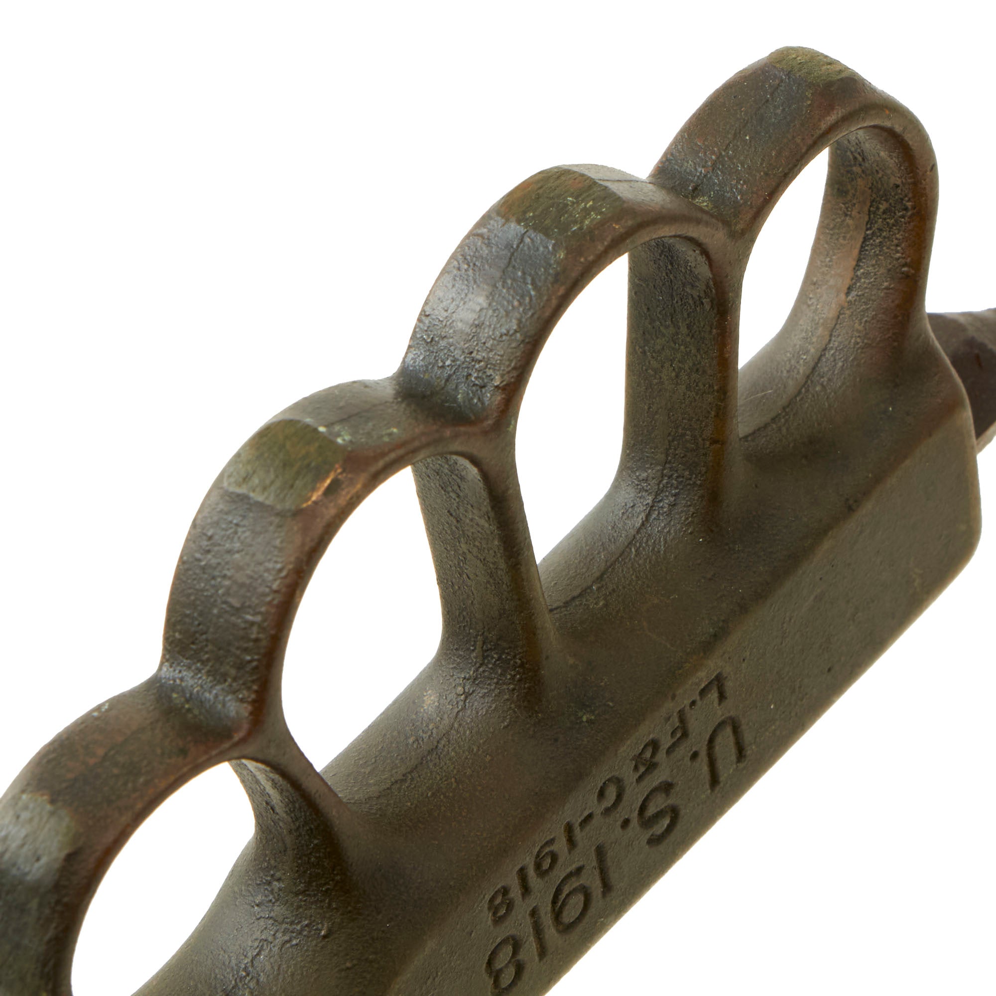 Original Item: Only One Available. The U.S. Model 1918 Mark I Trench Knife was the second major "Knuckle Knife" to be officially adopted and issued to the US military. It was developed for use in the horrific trench warfare that typified the stalemate on the Western Front during the latter part of World War One and saw use not only there, but during World War Two as well. The knife was manufactured in the United States by Henry Disston & Sons (H.D. & S.) as well as Landers, Frary & Clark (L.F. & C.) and Oneida Community Ltd (O.C.L.). The knives were also produced in France and are marked with the usual 1918 and US marks, as well as Au Lion on the blade. Whether this mark was a maker's mark or simply a motto is not known.The U.S. M-1918 Mark I Trench Knife is easily identifiable due to its large "brass knuckle" style guard and grip. This knife is 11 ¾" in overall length, with a 6 ¾" dagger style blade. The overall length with scabbard is 12”. The brass grips are beautifully darkened and are marked U.S. 1918 L.F & C - 1918. The scabbard is marked LF&C 1918. One of the two hanging prongs has broken off, but the other is intact as shown.As originally issued, the knives were entirely blackened; both the blades and the brass knuckle hilts. These knives remained in use with the US military, classified as limited standard (secondary issue) through January of 1945, when the knives were officially classified as obsolete. As originally issued, the knives were carried in a blued sheet steel scabbard that was typically maker marked, and was equipped with a pair of wire tabs that were intended to engage the US pistol web belt in use at that time. Many of the knives issued during World War II ended up in substitute leather scabbards of various designs and styles, many of which were "theater made".The knife was produced by the Landers, Frary & Clark company of New Britain, CT. L.F. & C. was established in 1865 and produced a wide variety of housewares, cutlery and event appliances. Many of their products were marketed under the trade name "Universal". The products of L.F. & C. included everything from scales, mousetraps and ice skates to electric ranges and toasters. L.F. & C. also produced the triangular blade US M-1917 Trench Knife as well. The assets of the L.F. & C. company were purchased by General Electric in 1965.The brass grip and knuckle guard blackening is retained much. The blade also has a considerable amount of oxidation across the edge. The steel dagger blade still has much of the original factory grind visible though the blade was most certainly cleaned and reblued. Overall this is a very nice example of the very popular and collectible World War I era US trench knife. These brass D guard knuckle knives always make a great centerpiece to any military knife display and certainly draw attention due to their size and fierce appearance. The only flaw would be the absence of one prong.Specifications:Blade Length: 6 3/4"Blade Style: Double Edged DaggerOverall length: 12”Guard: 4 1/2" long x 3 3/4" wideScabbard Length: 7 ⅛