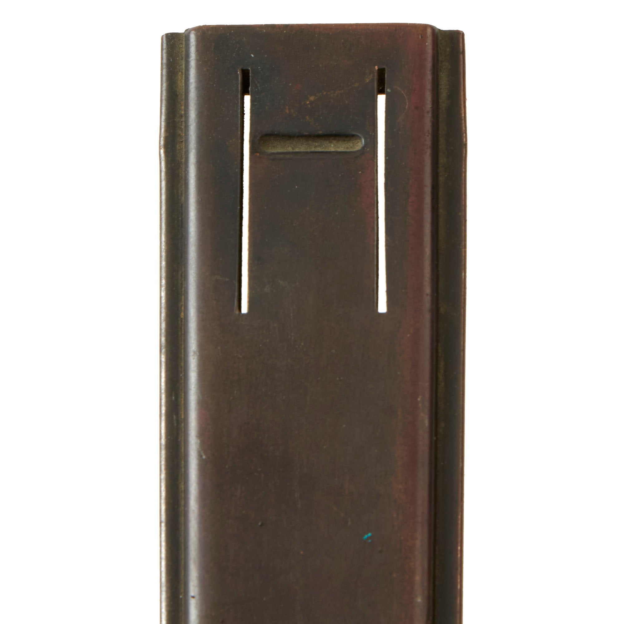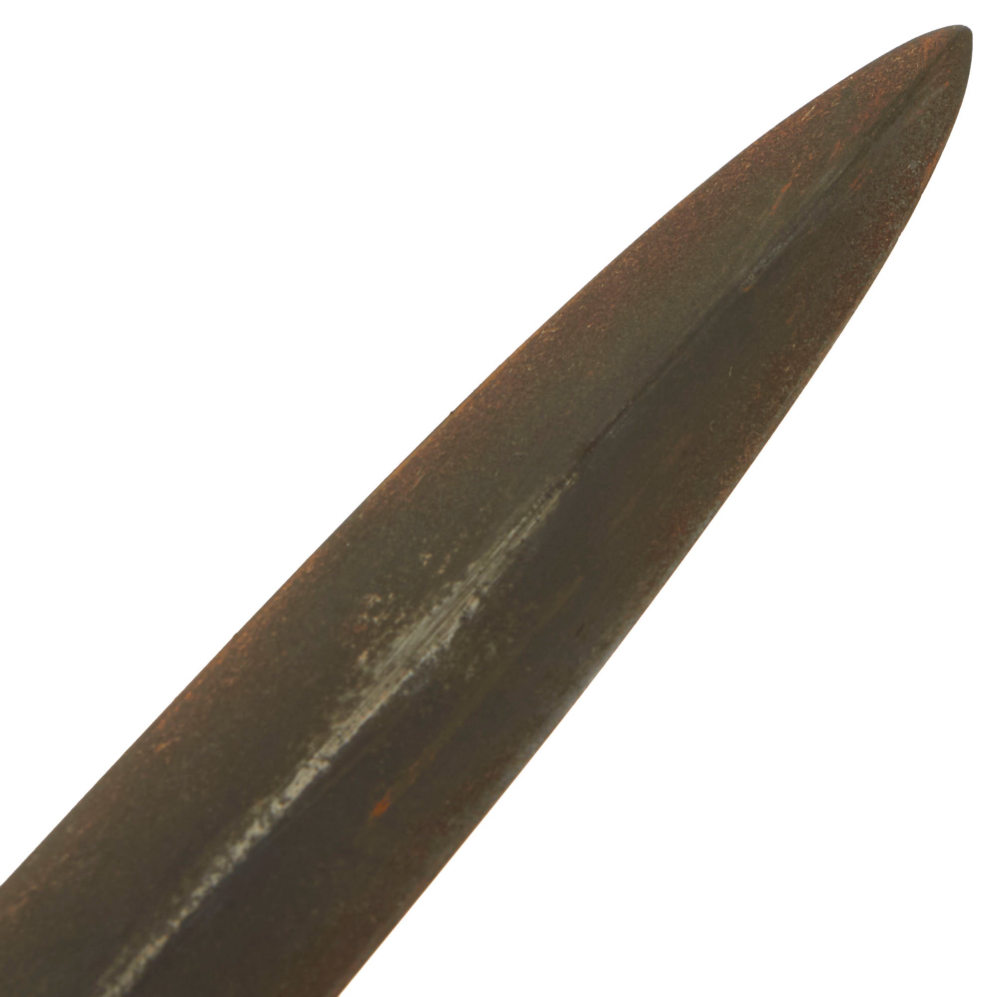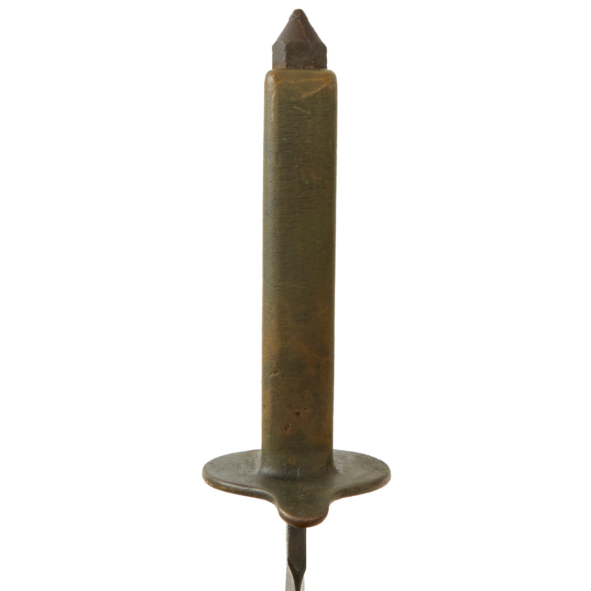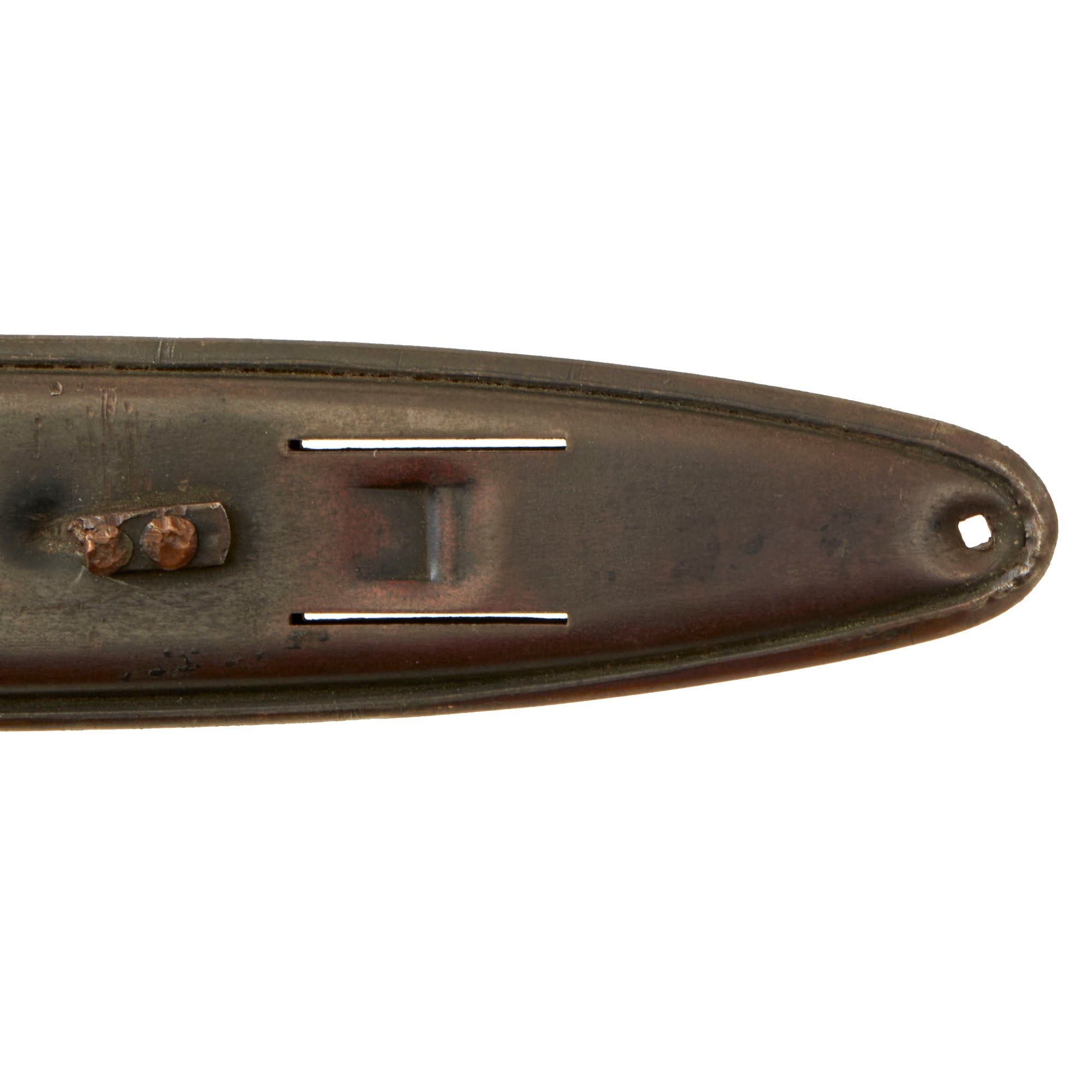 Original Item: Only One Available. The U.S. Model 1918 Mark I Trench Knife was the second major "Knuckle Knife" to be officially adopted and issued to the US military. It was developed for use in the horrific trench warfare that typified the stalemate on the Western Front during the latter part of World War One and saw use not only there, but during World War Two as well. The knife was manufactured in the United States by Henry Disston & Sons (H.D. & S.) as well as Landers, Frary & Clark (L.F. & C.) and Oneida Community Ltd (O.C.L.). The knives were also produced in France and are marked with the usual 1918 and US marks, as well as Au Lion on the blade. Whether this mark was a maker's mark or simply a motto is not known.The U.S. M-1918 Mark I Trench Knife is easily identifiable due to its large "brass knuckle" style guard and grip. This knife is 11 ¾" in overall length, with a 6 ¾" dagger style blade. The overall length with scabbard is 12”. The brass grips are beautifully darkened and are marked U.S. 1918 L.F & C - 1918. The scabbard is marked LF&C 1918. One of the two hanging prongs has broken off, but the other is intact as shown.As originally issued, the knives were entirely blackened; both the blades and the brass knuckle hilts. These knives remained in use with the US military, classified as limited standard (secondary issue) through January of 1945, when the knives were officially classified as obsolete. As originally issued, the knives were carried in a blued sheet steel scabbard that was typically maker marked, and was equipped with a pair of wire tabs that were intended to engage the US pistol web belt in use at that time. Many of the knives issued during World War II ended up in substitute leather scabbards of various designs and styles, many of which were "theater made".The knife was produced by the Landers, Frary & Clark company of New Britain, CT. L.F. & C. was established in 1865 and produced a wide variety of housewares, cutlery and event appliances. Many of their products were marketed under the trade name "Universal". The products of L.F. & C. included everything from scales, mousetraps and ice skates to electric ranges and toasters. L.F. & C. also produced the triangular blade US M-1917 Trench Knife as well. The assets of the L.F. & C. company were purchased by General Electric in 1965.The brass grip and knuckle guard blackening is retained much. The blade also has a considerable amount of oxidation across the edge. The steel dagger blade still has much of the original factory grind visible though the blade was most certainly cleaned and reblued. Overall this is a very nice example of the very popular and collectible World War I era US trench knife. These brass D guard knuckle knives always make a great centerpiece to any military knife display and certainly draw attention due to their size and fierce appearance. The only flaw would be the absence of one prong.Specifications:Blade Length: 6 3/4"Blade Style: Double Edged DaggerOverall length: 12”Guard: 4 1/2" long x 3 3/4" wideScabbard Length: 7 ⅛