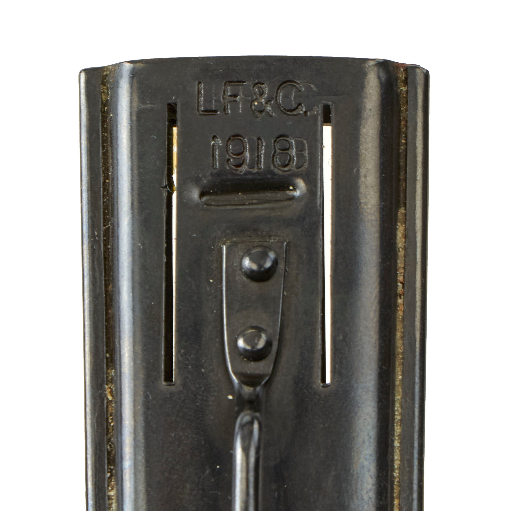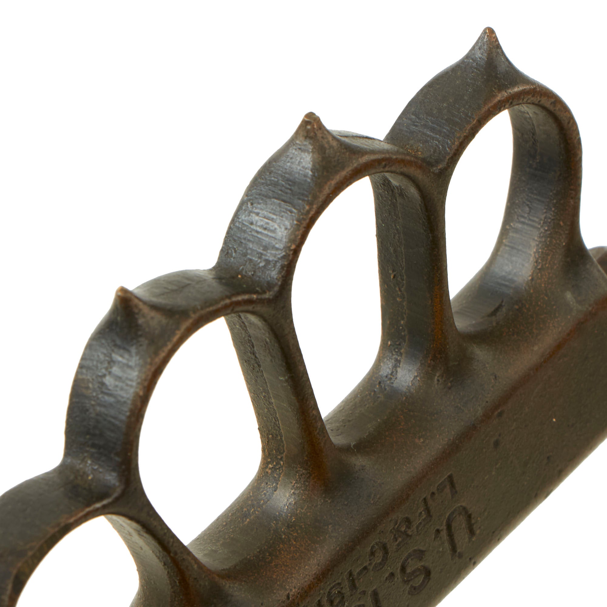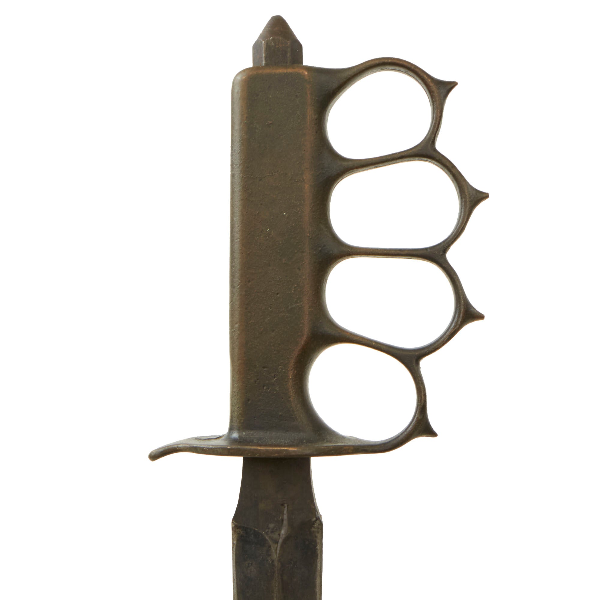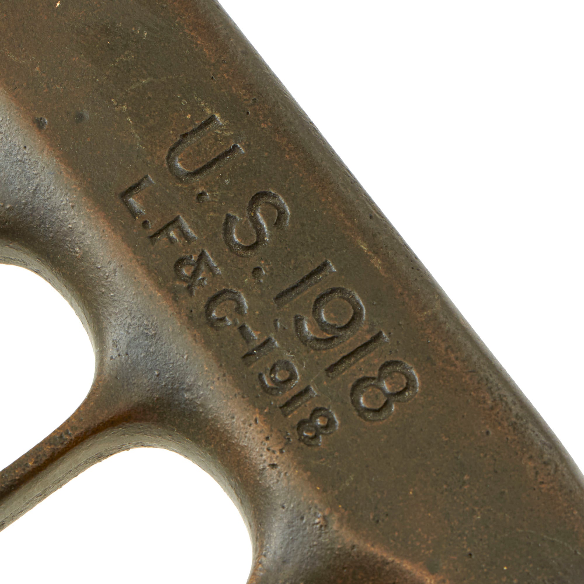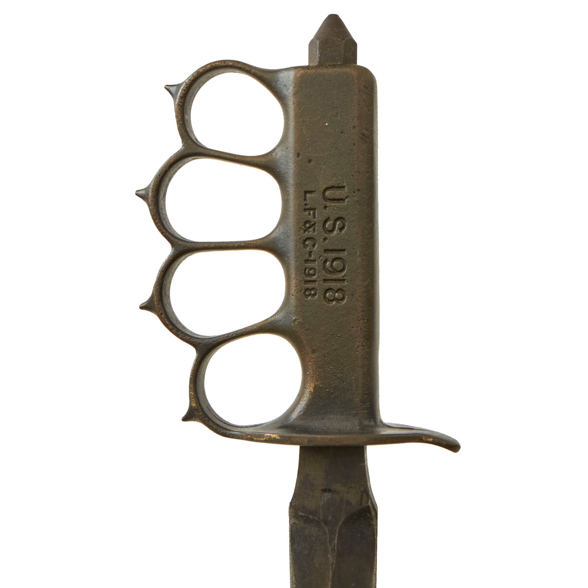 Original Item: Only One Available. The U.S. Model 1918 Mark I Trench Knife was the second major "Knuckle Knife" to be officially adopted and issued to the US military. It was developed for use in the horrific trench warfare that typified the stalemate on the Western Front during the latter part of World War One and saw use not only there, but during World War Two as well. The knife was manufactured in the United States by Henry Disston & Sons (H.D. & S.) as well as Landers, Frary & Clark (L.F. & C.) and Oneida Community Ltd (O.C.L.). The knives were also produced in France and are marked with the usual 1918 and US marks, as well as Au Lion on the blade. Whether this mark was a maker's mark or simply a motto is not known.