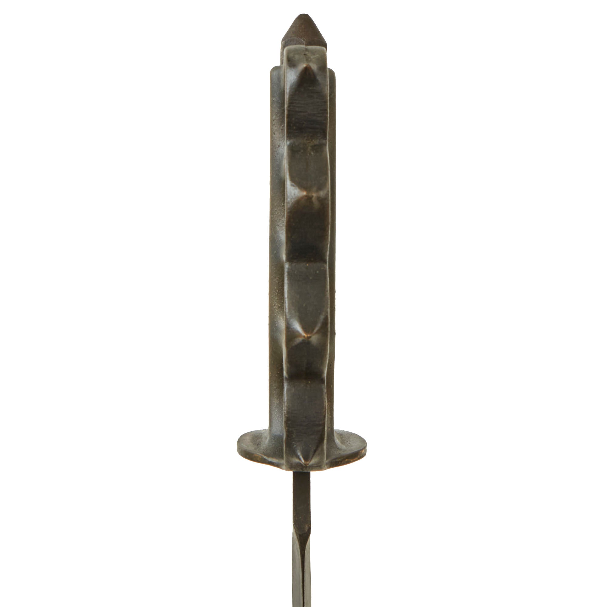 As with most we see, the blackening on the handle has been heavily worn away, with a fair amount retained in the recessed areas such as between the knuckle spikes. It is about 60% retained overall. The blade also has some oxidation in spots. The steel dagger blade still has much of the original factory grind visible though the blade was most certainly cleaned at one point.