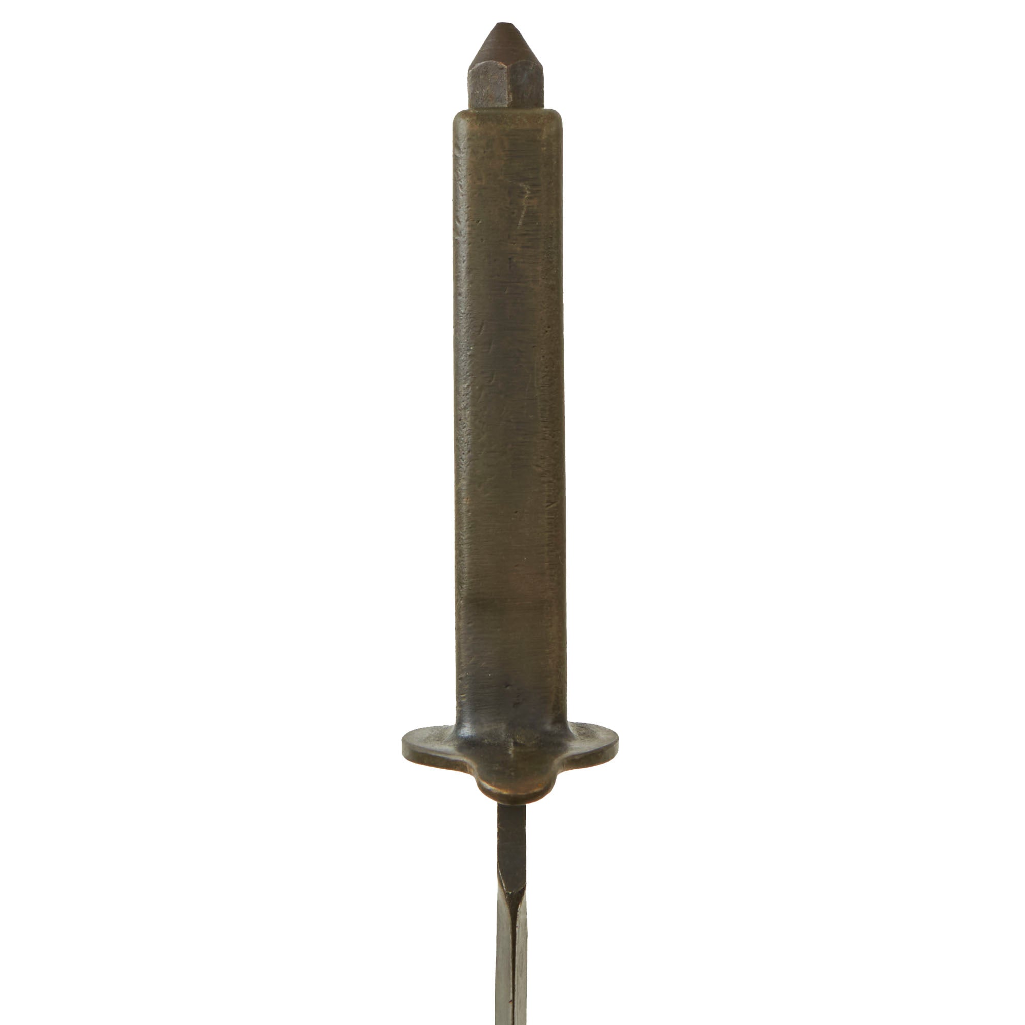 The U.S. M-1918 Mark I Trench Knife is easily identifiable due to its large "brass knuckle" style guard and grip. This knife is 11 ¾" in overall length, with a 6 ¾" dagger style blade. The overall length with scabbard is 12”. The brass grips are beautifully darkened and are marked U.S. 1918 L.F & C - 1918. The scabbard on this example is a reproduction L.F&C marked scabbard, which matches the knife very well.