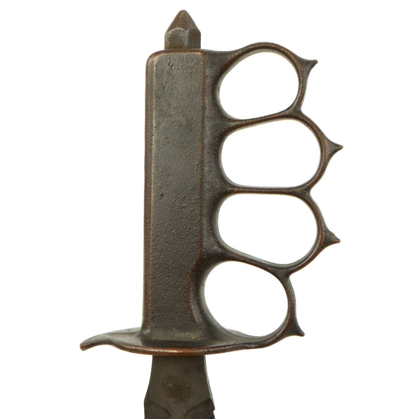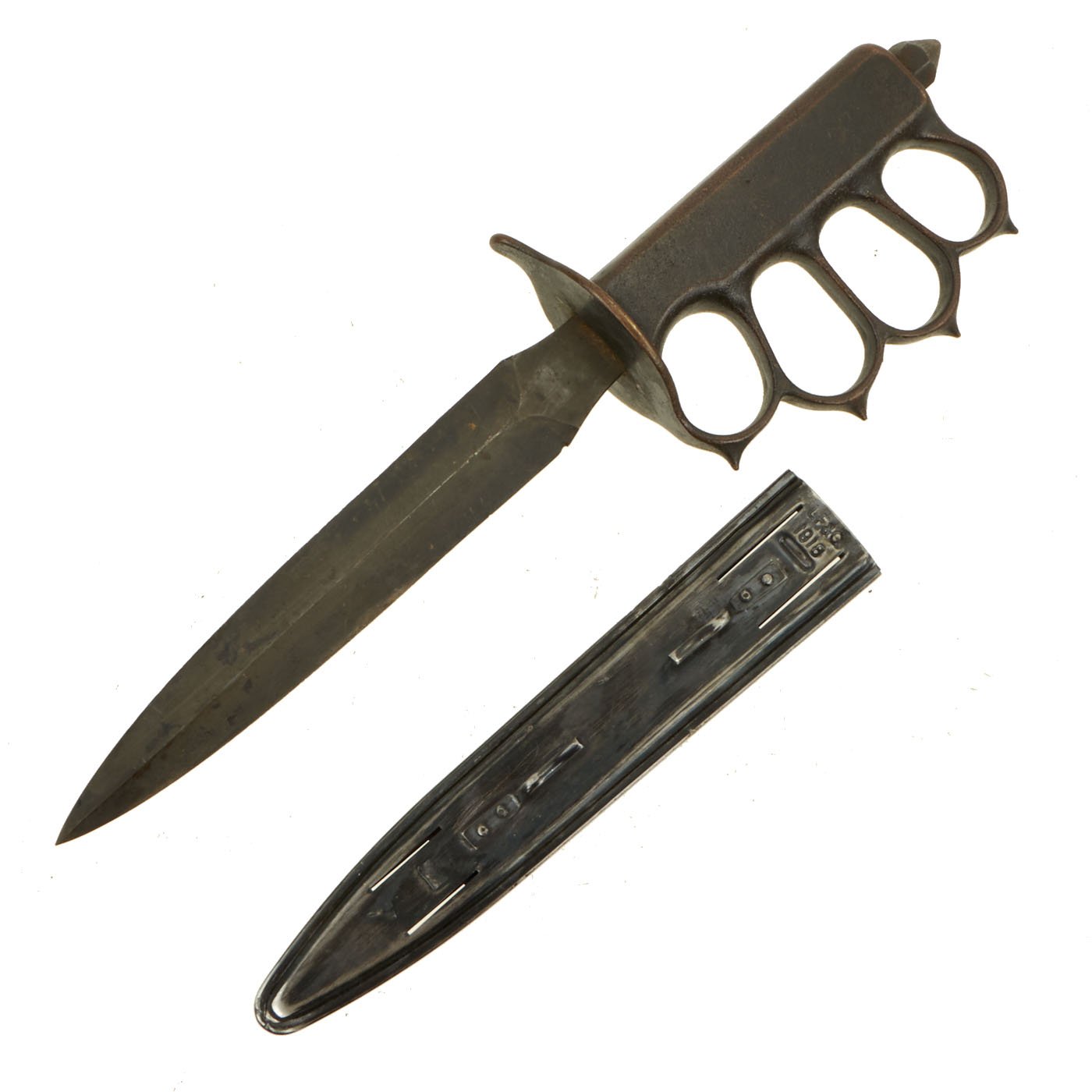 As originally issued, the knives were entirely blackened; both the blades and the brass knuckle hilts. These knives remained in use with the US military, classified as limited standard (secondary issue) through January of 1945, when the knives were officially classified as obsolete. As originally issued, the knives were carried in a blued sheet steel scabbard that was typically maker marked, and was equipped with a pair of wire tabs that were intended to engage the US pistol web belt in use at that time. Many of the knives issued during World War II ended up in substitute leather scabbards of various designs and styles, many of which were "theater made".