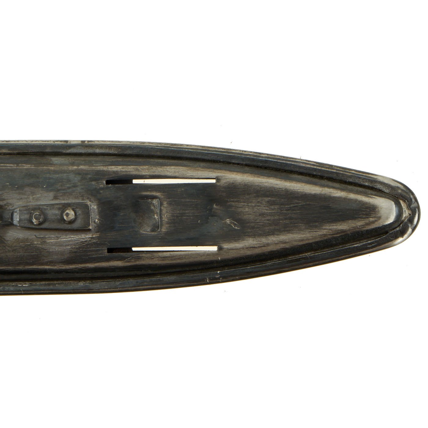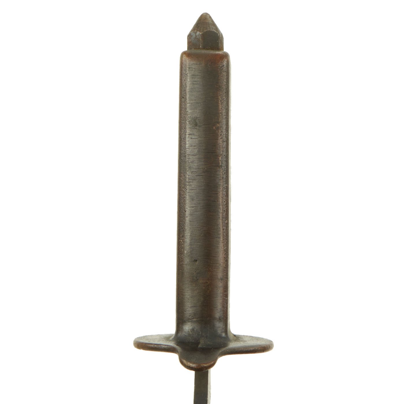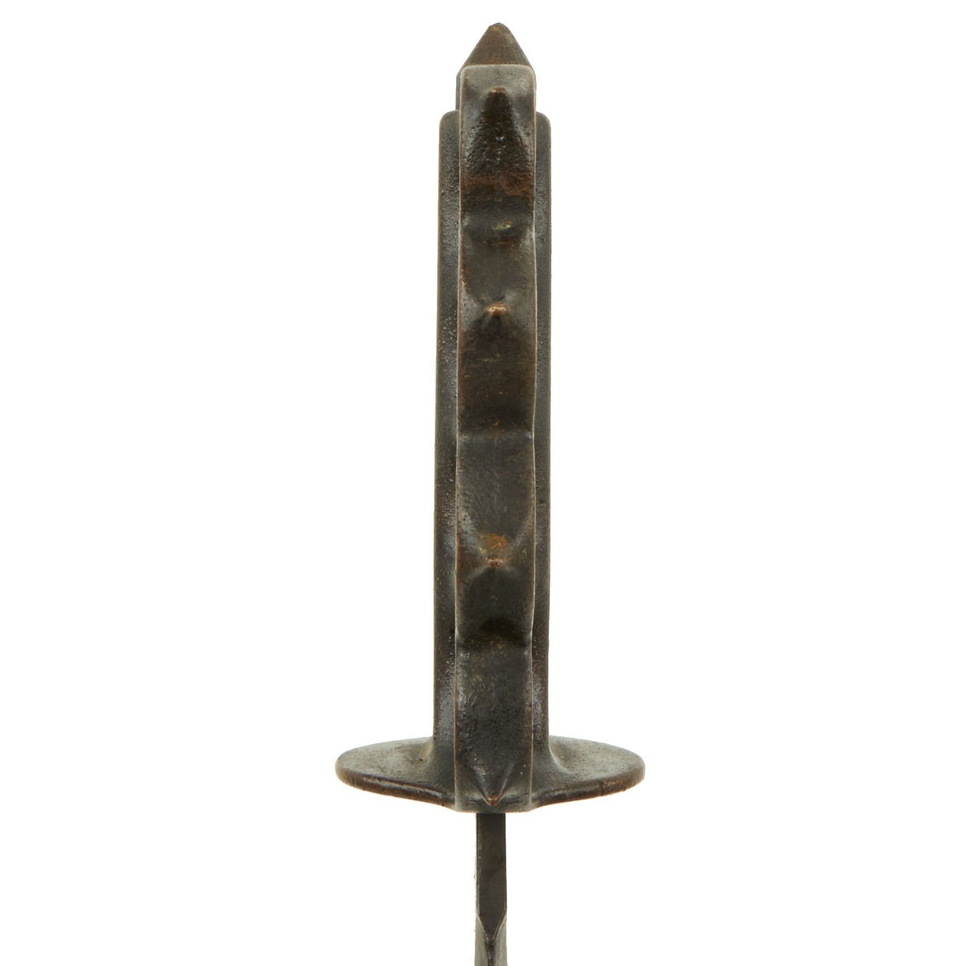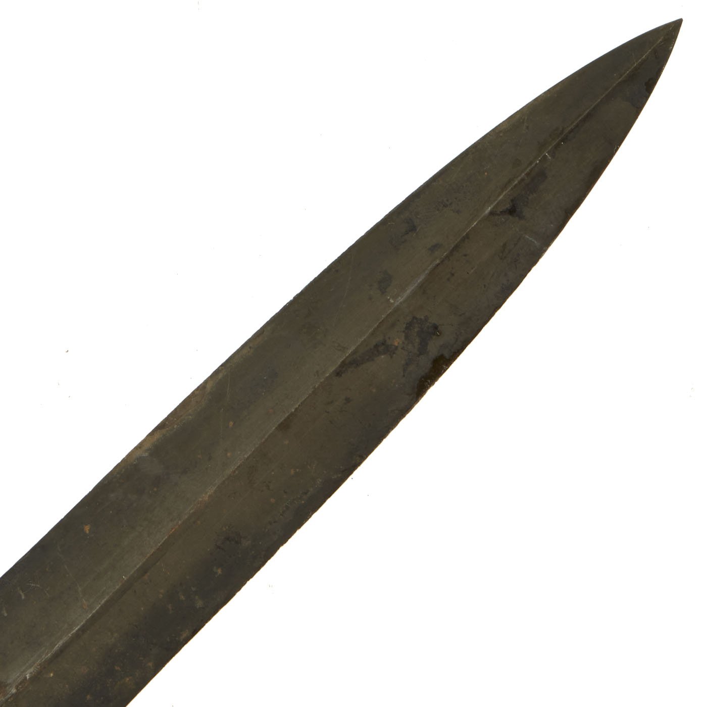 The brass grip and knuckle guard blackening is still present which is rarely seen on most examples. The steel dagger blade still has much of the original factory grind on the edge, and much of the original factory finish.