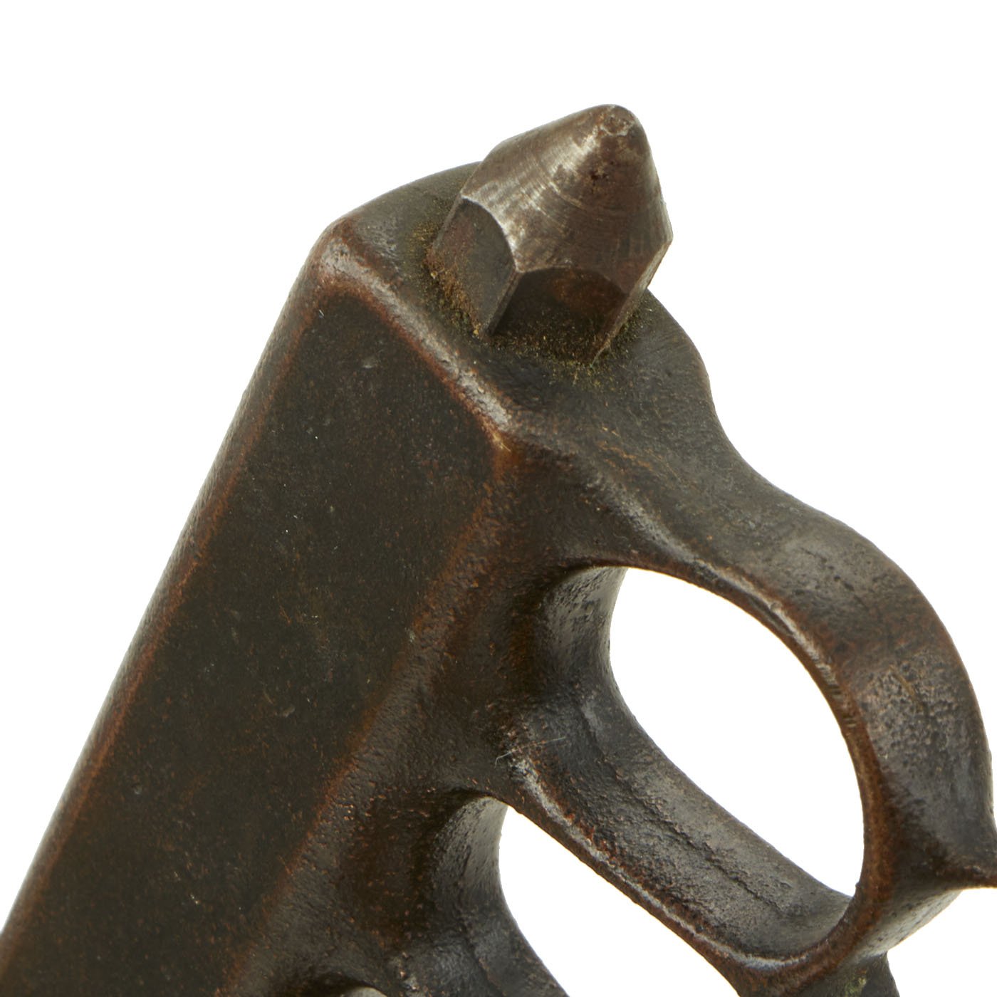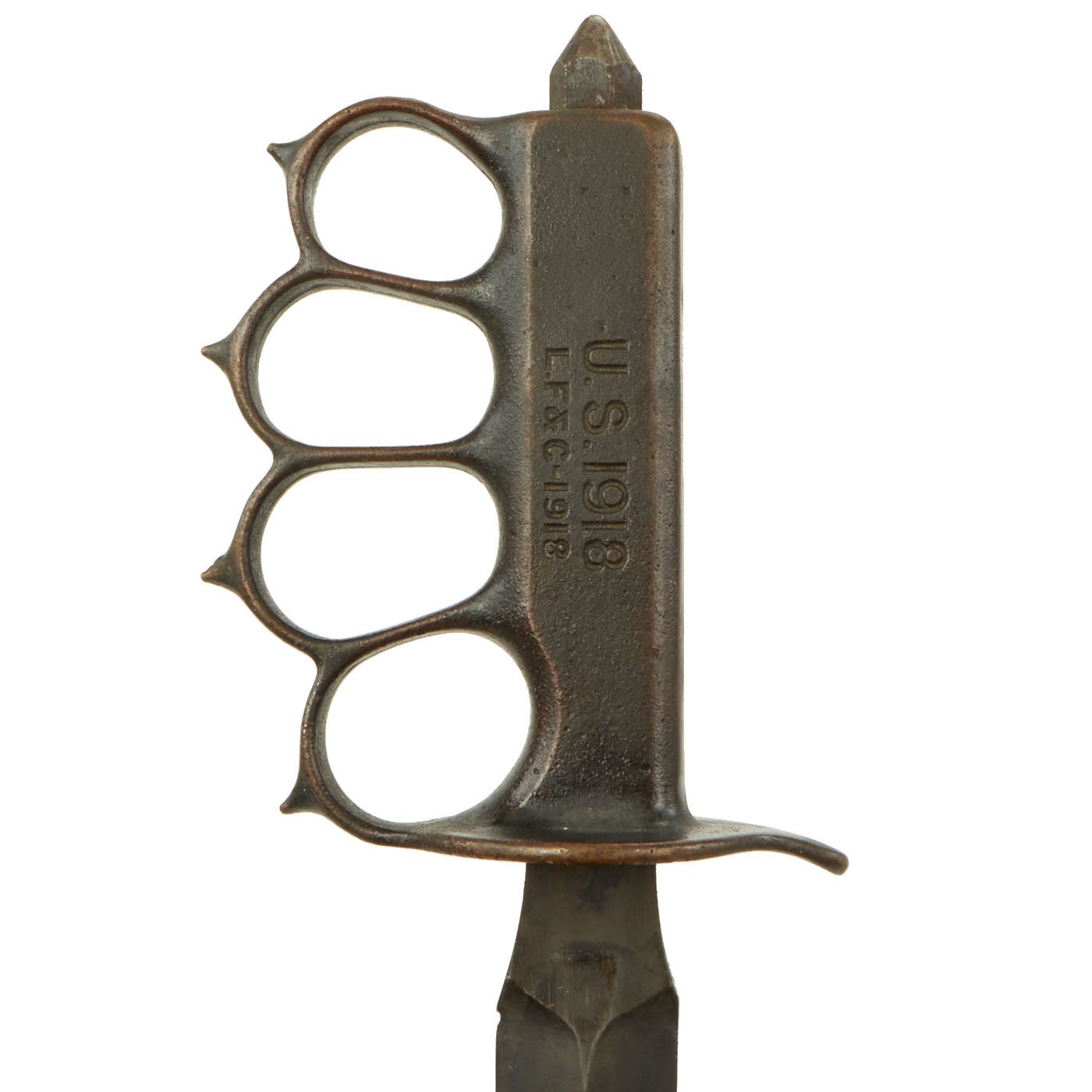The U.S. Model 1918 Mark I Trench Knife was the second major "Knuckle Knife" to be officially adopted and issued to the US military. It was developed for use in the horrific trench warfare that typified the stalemate on the Western Front during the latter part of World War One and saw use not only there, but during World War Two as well. The knife was manufactured in the United States by Henry Disston & Sons (H.D. & S.) as well as Landers, Frary & Clark (L.F. & C.) and Oneida Community Ltd (O.C.L.). The knives were also produced in France and are marked with the usual 1918 and US marks, as well as Au Lion on the blade. Whether this mark was a maker's mark or simply a motto is not known. The U.S. M-1918 Mark I Trench Knife is easily identifiable due to its large "brass knuckle" style guard and grip. The knives were 11 ¾" in overall length, with a 6 ¾" dagger style blade. The brass grips were marked U.S. 1918 and with the makers name or initials.