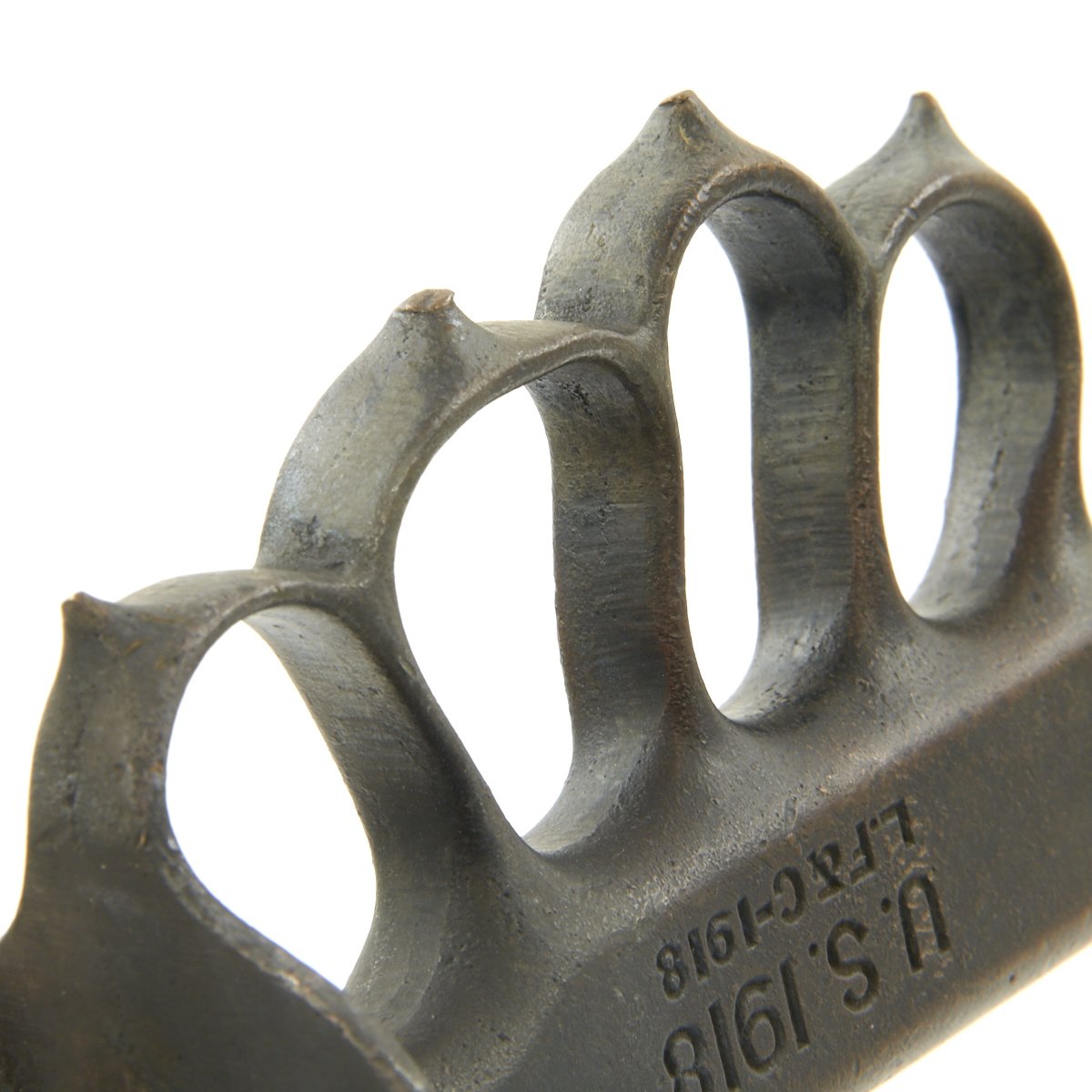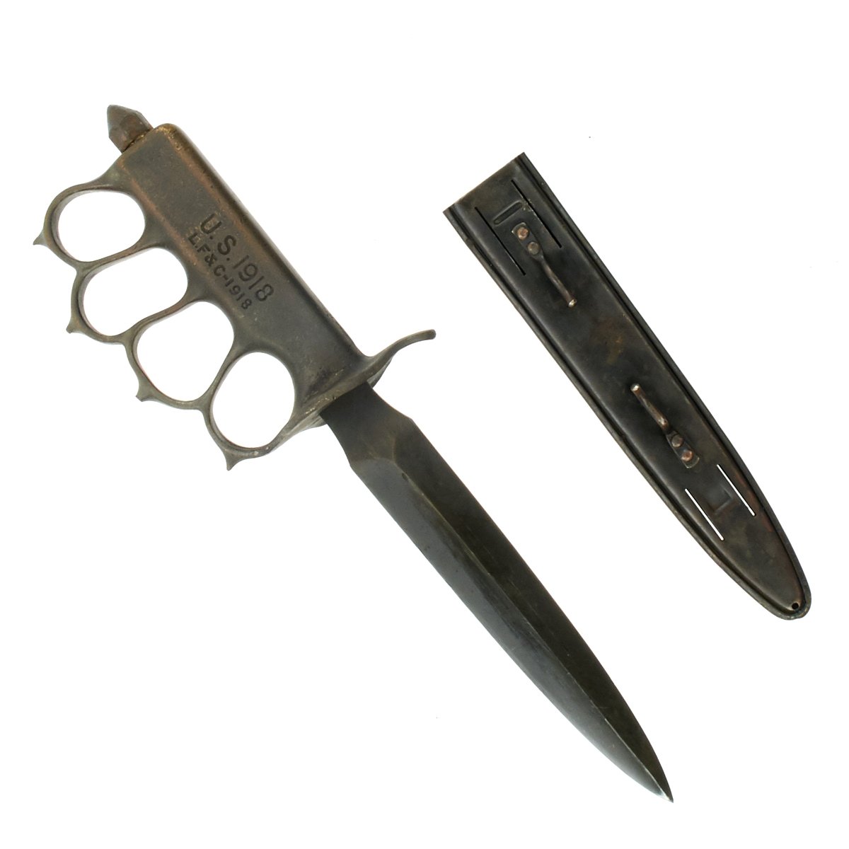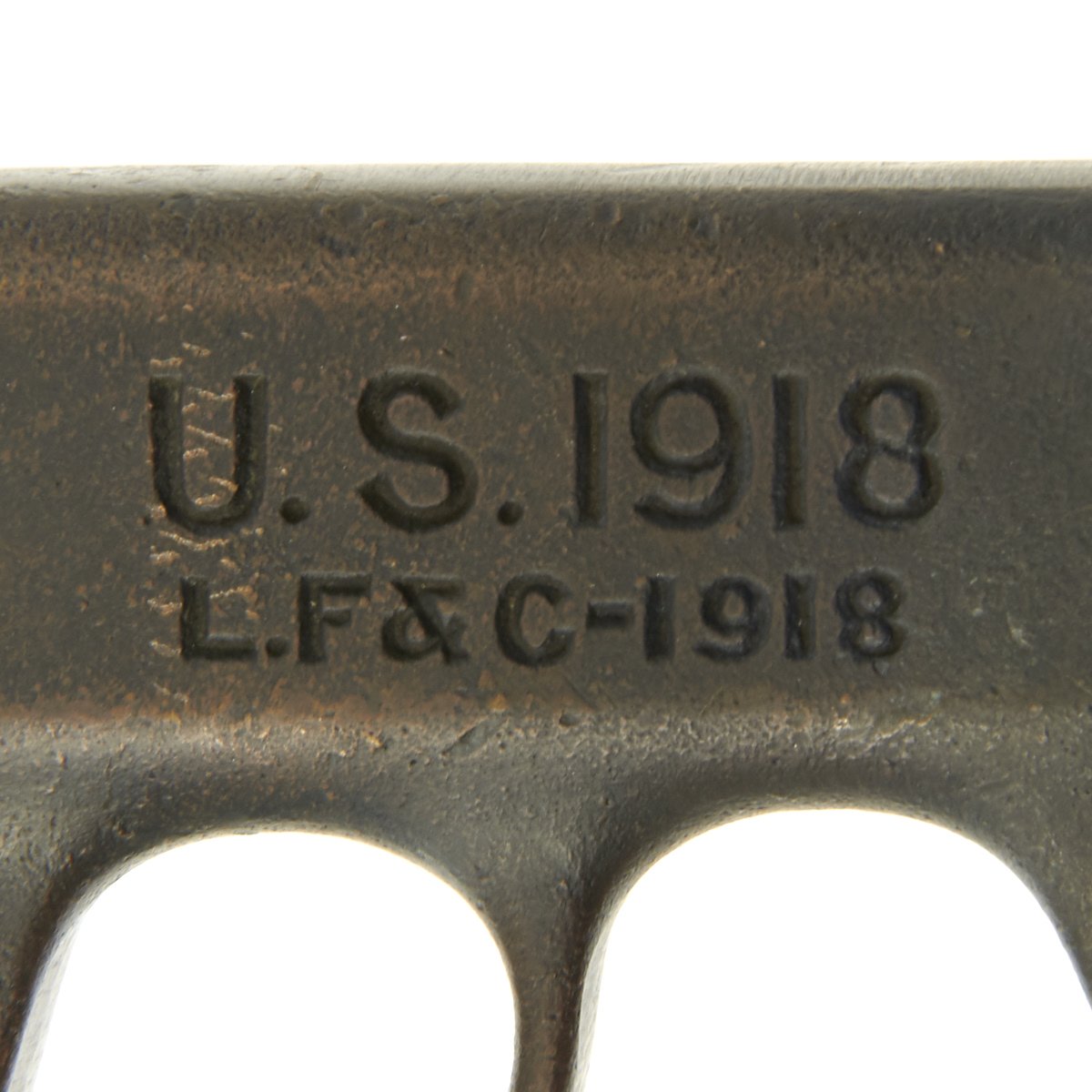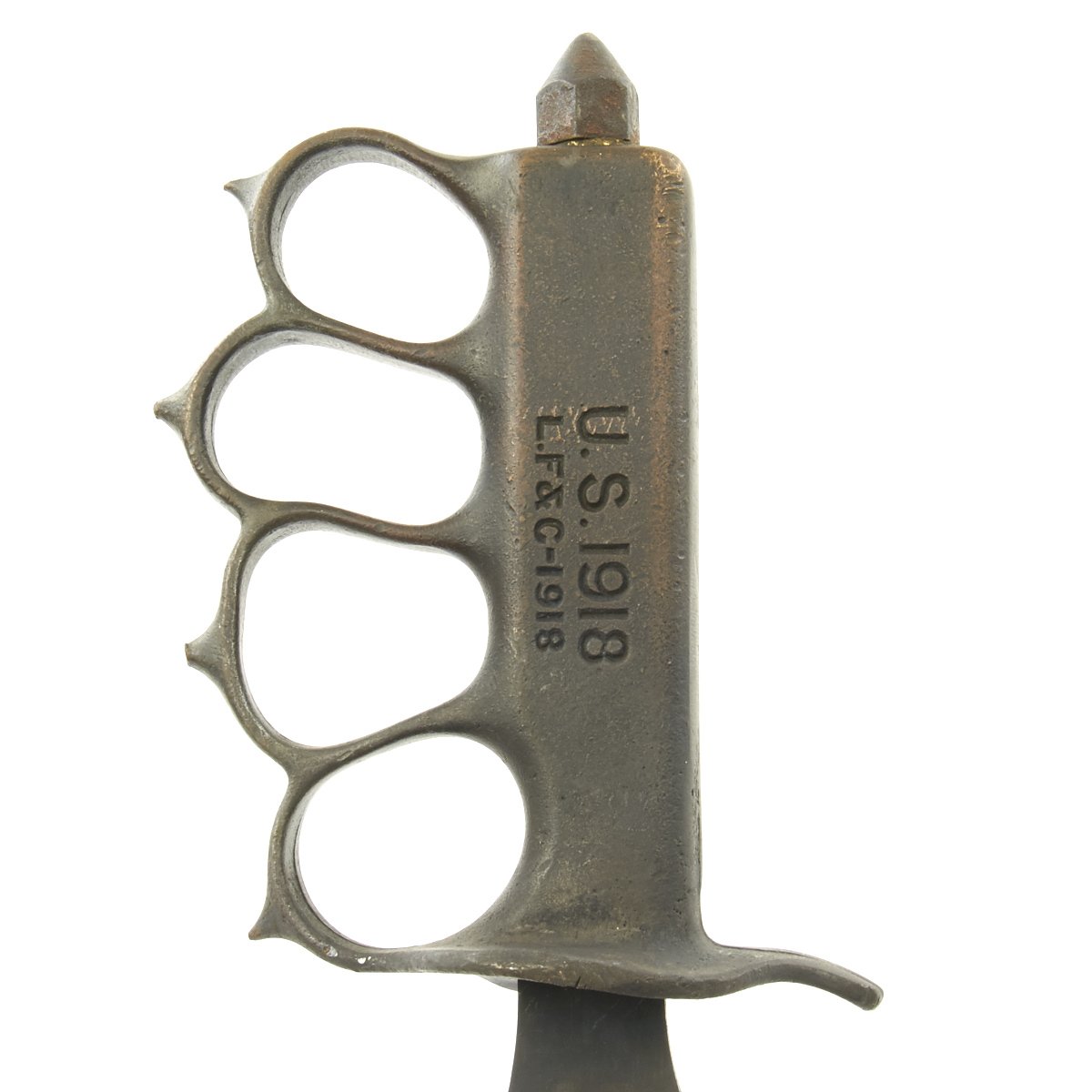 Original Item: Only One Available. The U.S. Model 1918 Mark I Trench Knife was the second major "Knuckle Knife" to be officially adopted and issued to the US military. It was developed for use in the horrific trench warfare that typified the stalemate on the Western Front during the latter part of World War One and saw use not only there, but during World War Two as well. The knife was manufactured in the United States by Henry Disston & Sons (H.D. & S.) as well as Landers, Frary & Clark (L.F. & C.) and Oneida Community Ltd (O.C.L.). The knives were also produced in France and are marked with the usual 1918 and US marks, as well as Au Lion on the blade. Whether this mark was a maker's mark or simply a motto is not known. The U.S. M-1918 Mark I Trench Knife is easily identifiable due to its large "brass knuckle" style guard and grip. The knives were 11 ¾" in overall length, with a 6 ¾" dagger style blade. The brass grips were marked U.S. 1918 and with the makers name or initials.
