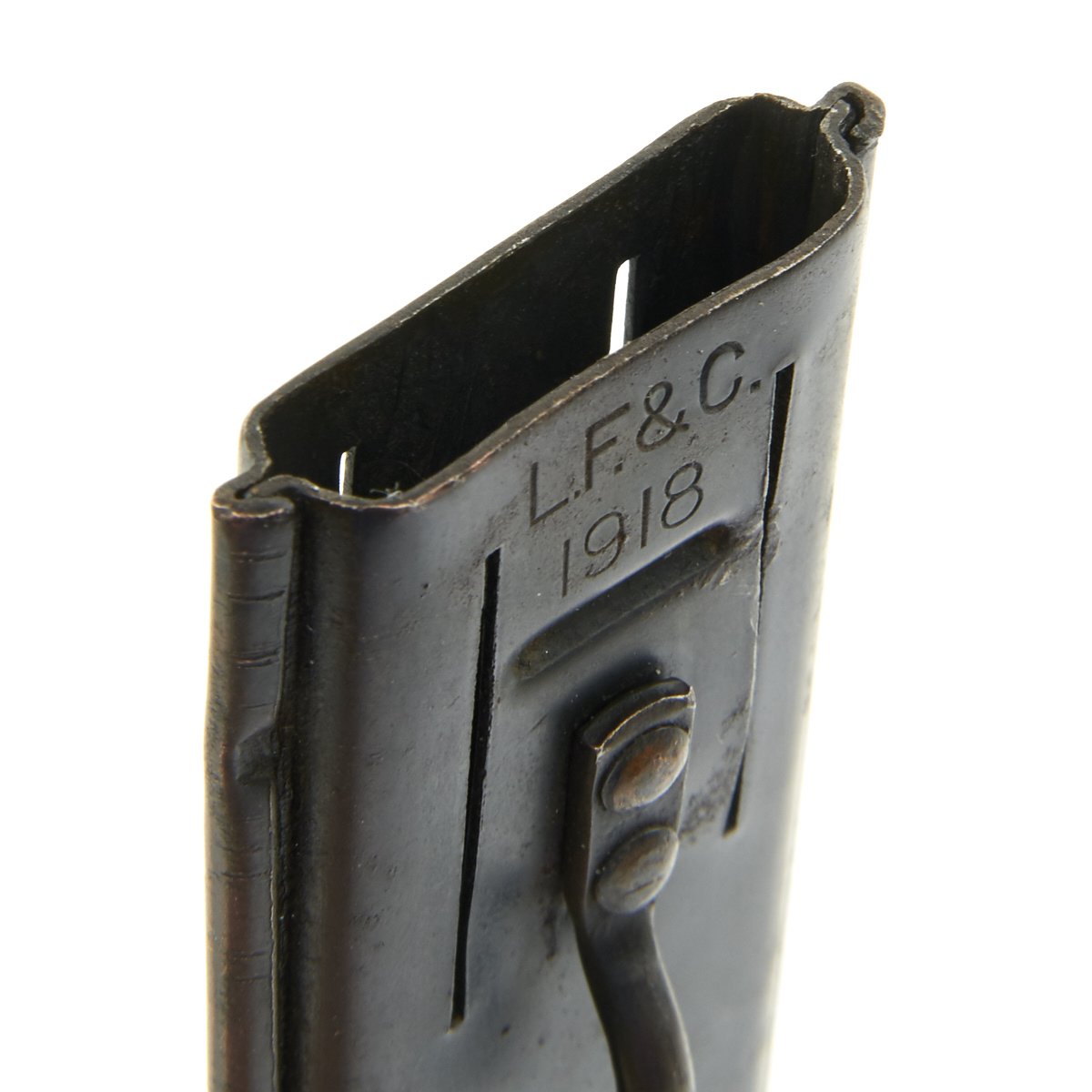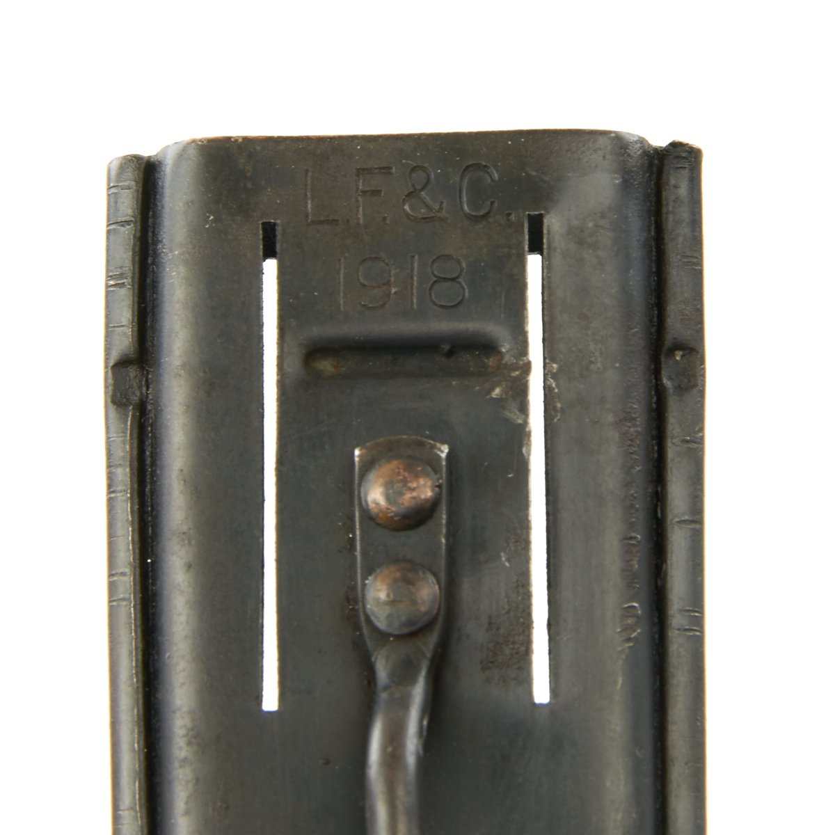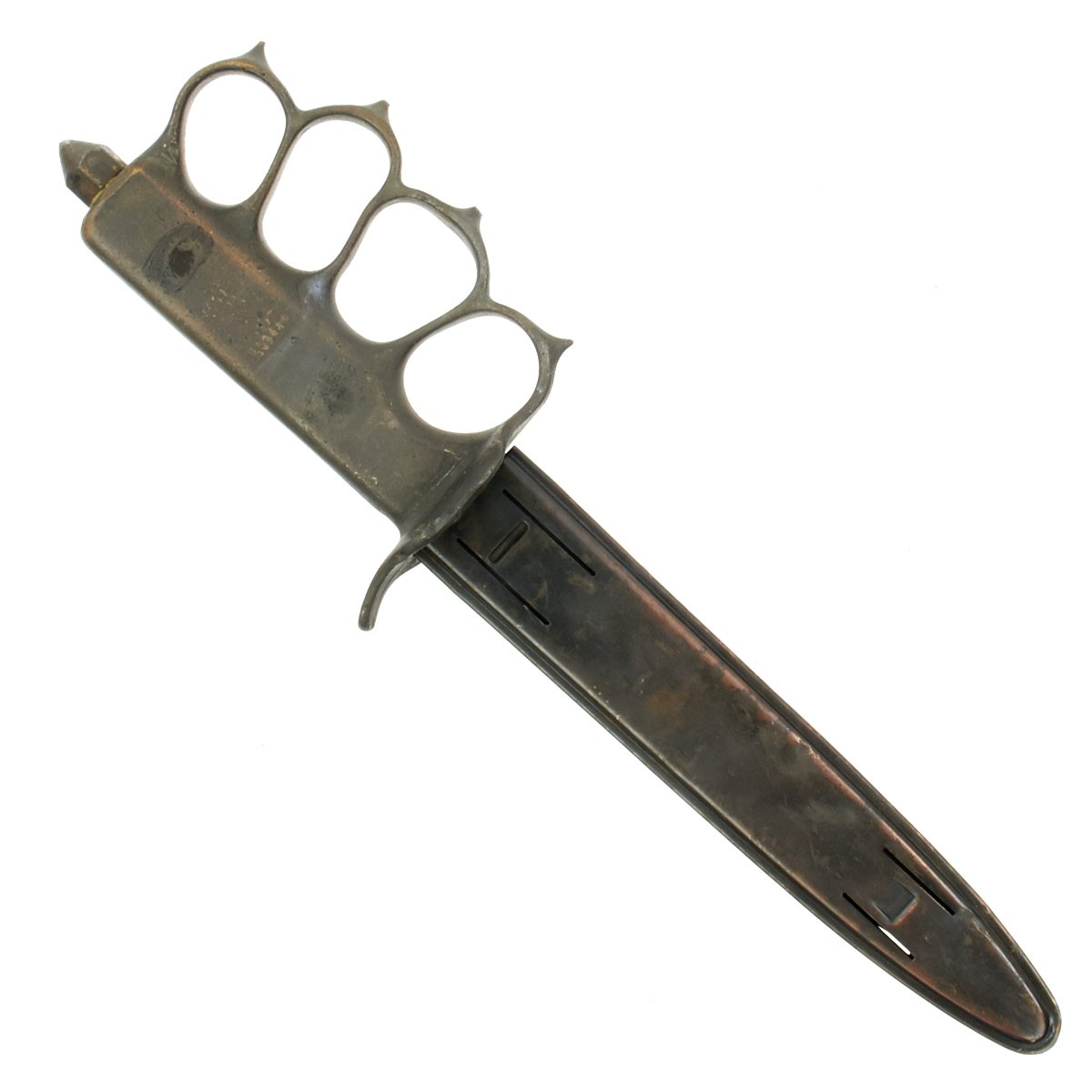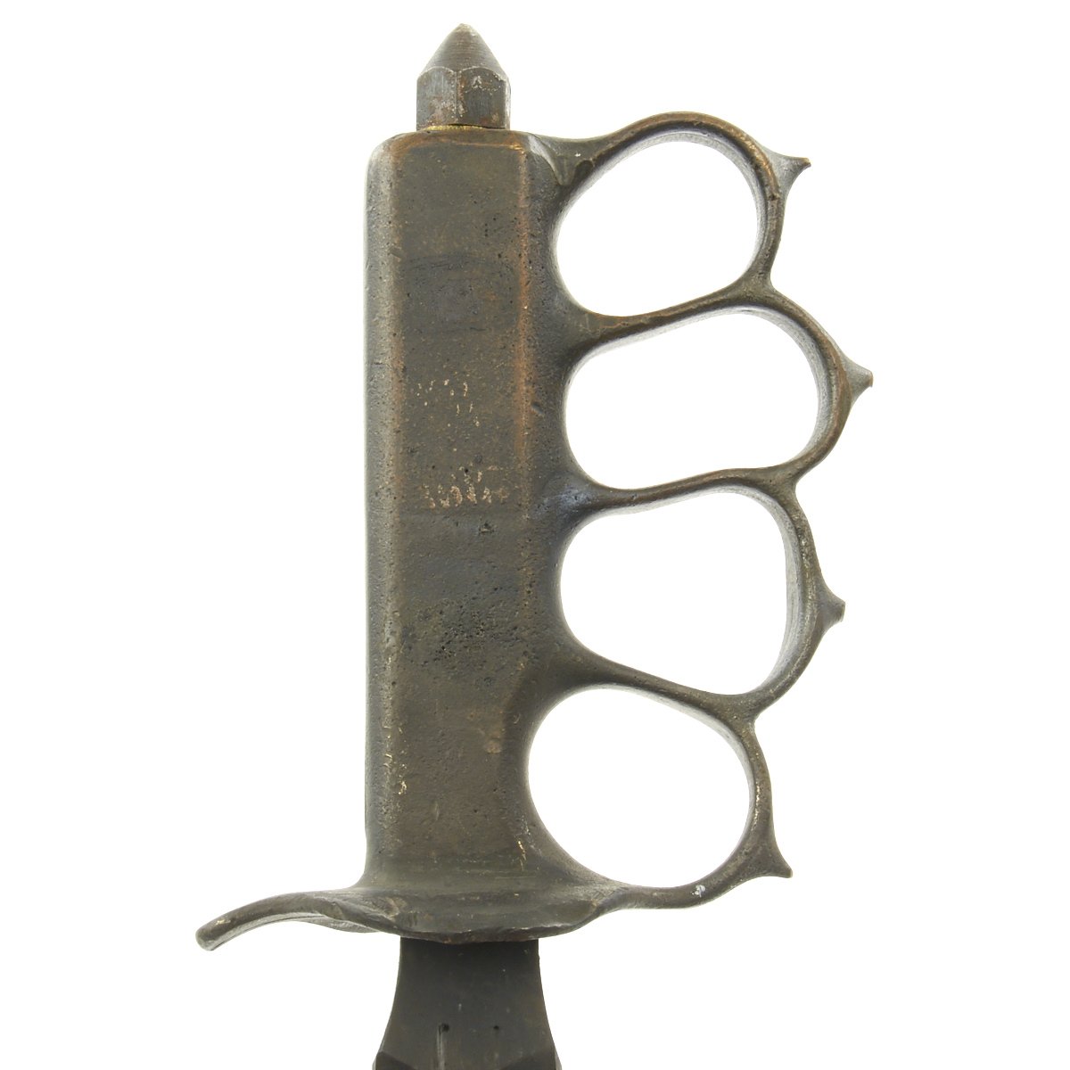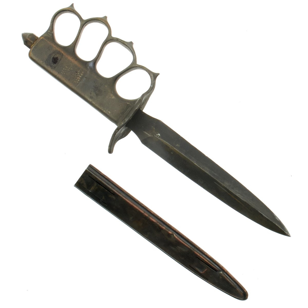 Original Item: Only One Available. The U.S. Model 1918 Mark I Trench Knife was the second major "Knuckle Knife" to be officially adopted and issued to the US military. It was developed for use in the horrific trench warfare that typified the stalemate on the Western Front during the latter part of World War One and saw use not only there, but during World War Two as well. The knife was manufactured in the United States by Henry Disston & Sons (H.D. & S.) as well as Landers, Frary & Clark (L.F. & C.) and Oneida Community Ltd (O.C.L.). The knives were also produced in France and are marked with the usual 1918 and US marks, as well as Au Lion on the blade. Whether this mark was a maker's mark or simply a motto is not known. The U.S. M-1918 Mark I Trench Knife is easily identifiable due to its large "brass knuckle" style guard and grip. The knives were 11 ¾" in overall length, with a 6 ¾" dagger style blade. The brass grips were marked U.S. 1918 and with the makers name or initials.
