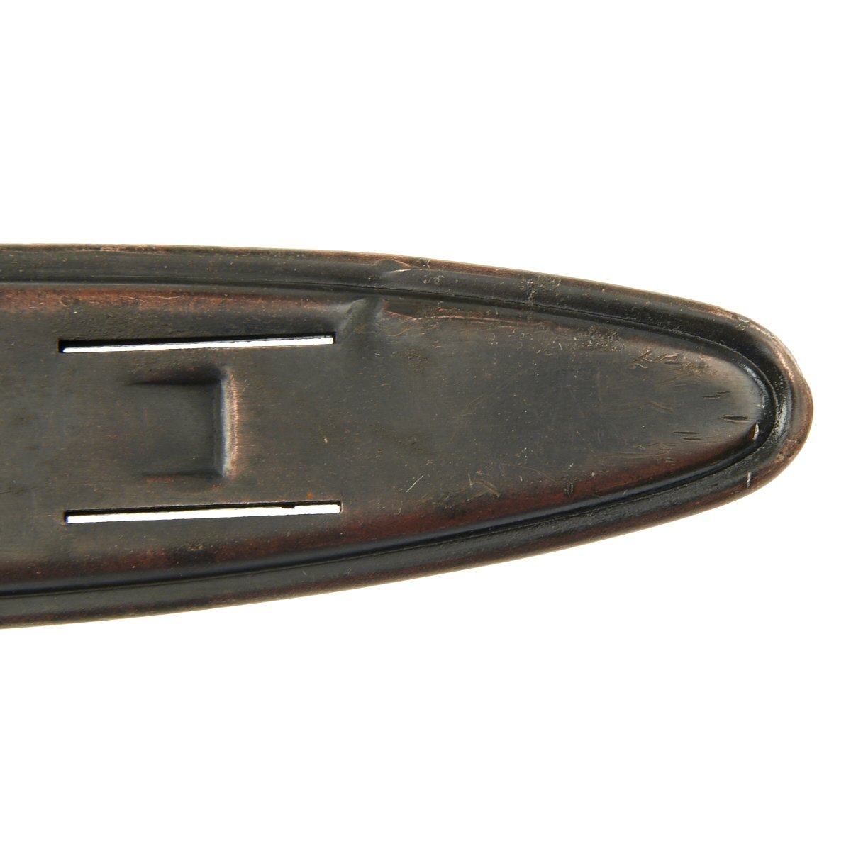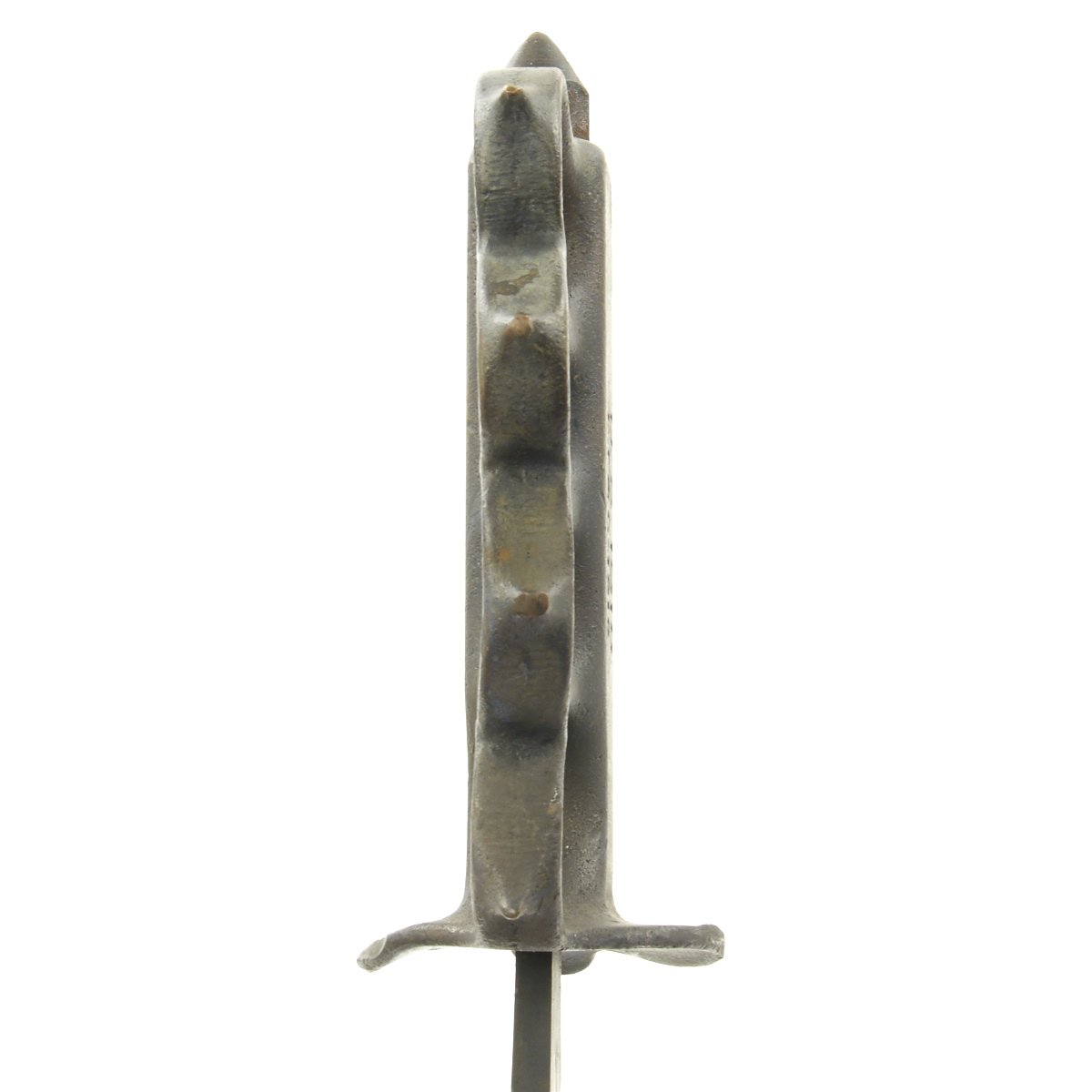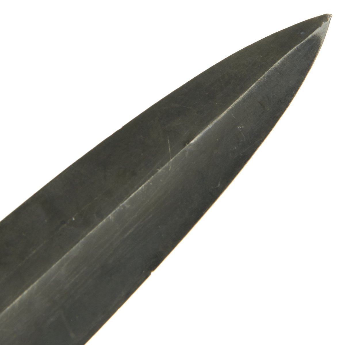 The brass grip and knuckle guard blackening is still quite strong, showing very little of the usual fading. There is however a bit of damage to the handle, in one of the finger loops has been bent inwards, partly distorting the grip. The cross guard is also slightly bent. We're not sure what someone hit with this knife, but it must have been quite solid. The steel dagger blade still appears to have the original factory grind on the edge, and still has almost all of the original factory finish. Just a bit of wear on the tip and runner wear prevent it from being "mint".