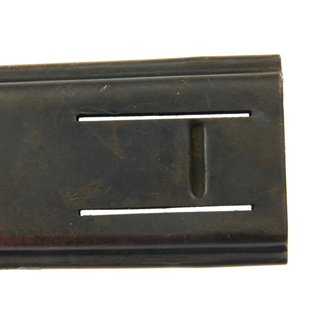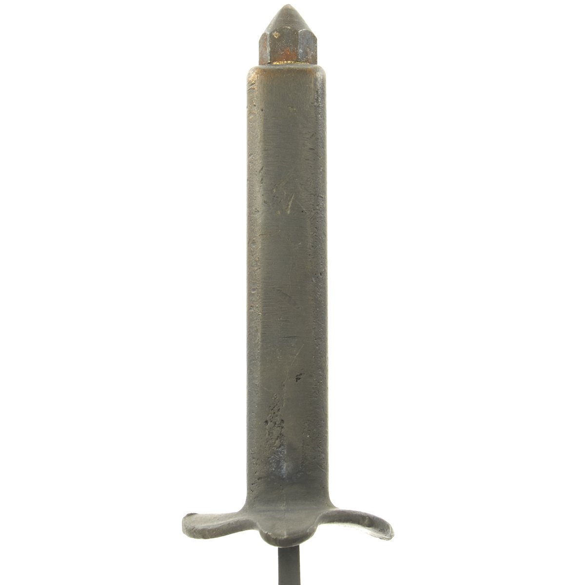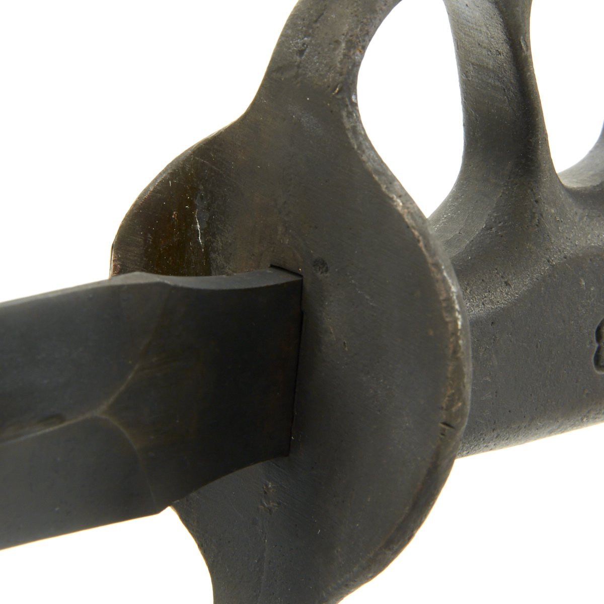 The brass grip and knuckle guard blackening is still quite strong, showing very little of the usual fading. There is however a bit of damage to the handle, in one of the finger loops has been bent inwards, partly distorting the grip. The cross guard is also slightly bent. We're not sure what someone hit with this knife, but it must have been quite solid. The steel dagger blade still appears to have the original factory grind on the edge, and still has almost all of the original factory finish. Just a bit of wear on the tip and runner wear prevent it from being "mint".