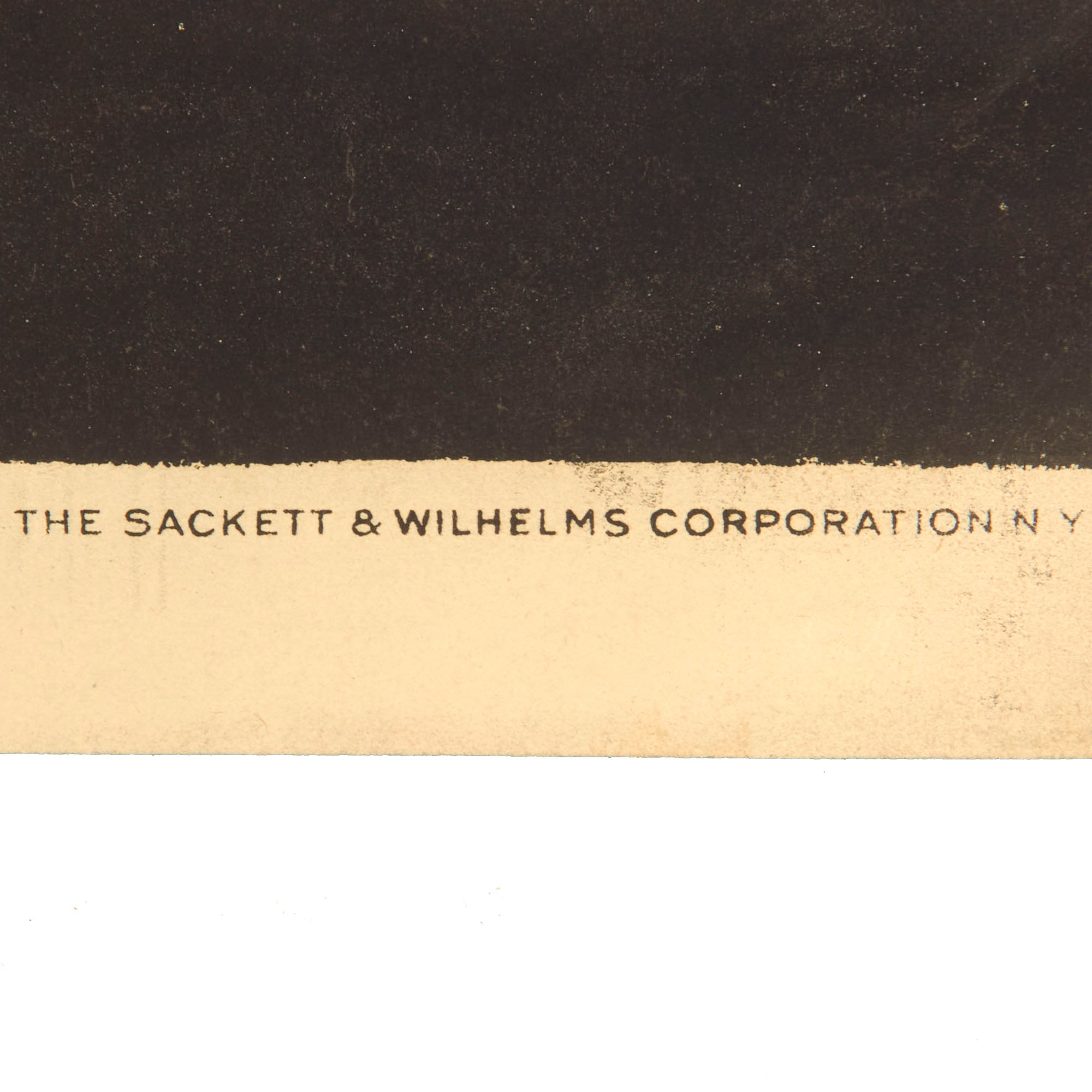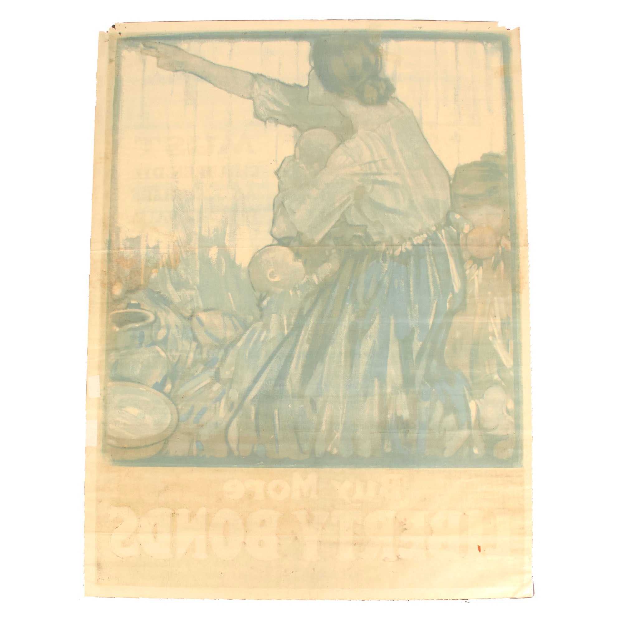 Original Item: Only One Available. This is a wonderful example of a hard to find Liberty Bonds poster, published by The Sackett & Wilhelms Corporation N.Y. featuring artwork by Walter H. Everett. During his early career, Everett was a student of Howard Pyle (‘The Father of American Illustration’) at both the Drexel Institute and Brandywine School as well as a contemporary of N.C. Wyeth. Among the first wave of commercial illustrators in America, students taught by Pyle in the Brandywine School are credited with setting the standards for future American illustrators and often attributed key influences on such artists as Maxfield Parrish and Norman Rockwell. Staples of the Brandywine style included taking inspiration from U.S. culture and the artists' personal lives. Students of Pyle were encouraged to train hard, spiritually and artistically, to study first-hand the environments they painted and to utilize authentic props.
