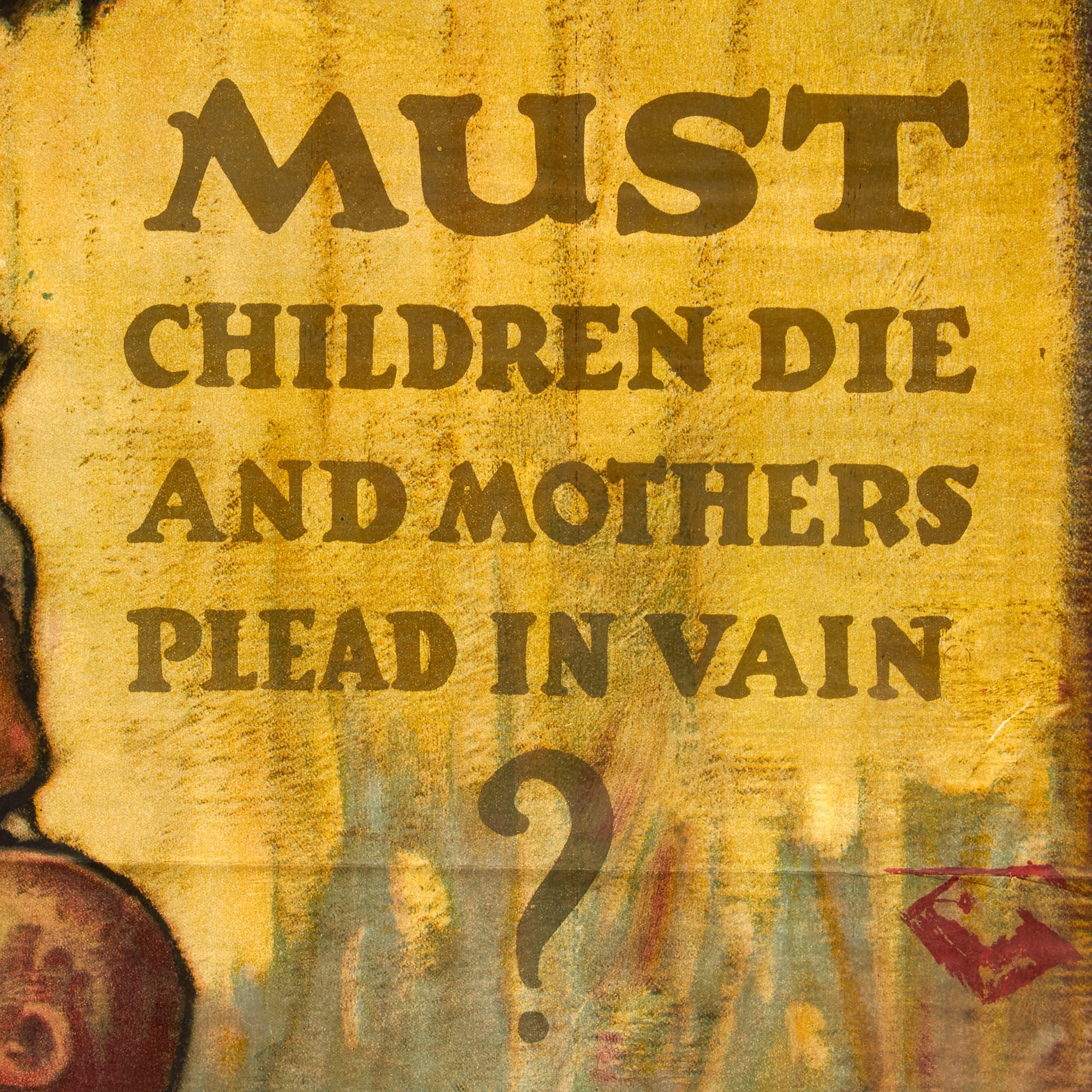 This original WWI poster was created by Walter H. Everett and issued in the United States to help promote the sale of Liberty Bonds. The fearsome image is of a mother reaching out as babies cling to her, adding gravity to the posters grim tag line Must Children Die And Mothers Plead In Vain? The answer to her pleas is printed at the bottom with Buy More Liberty Bonds.